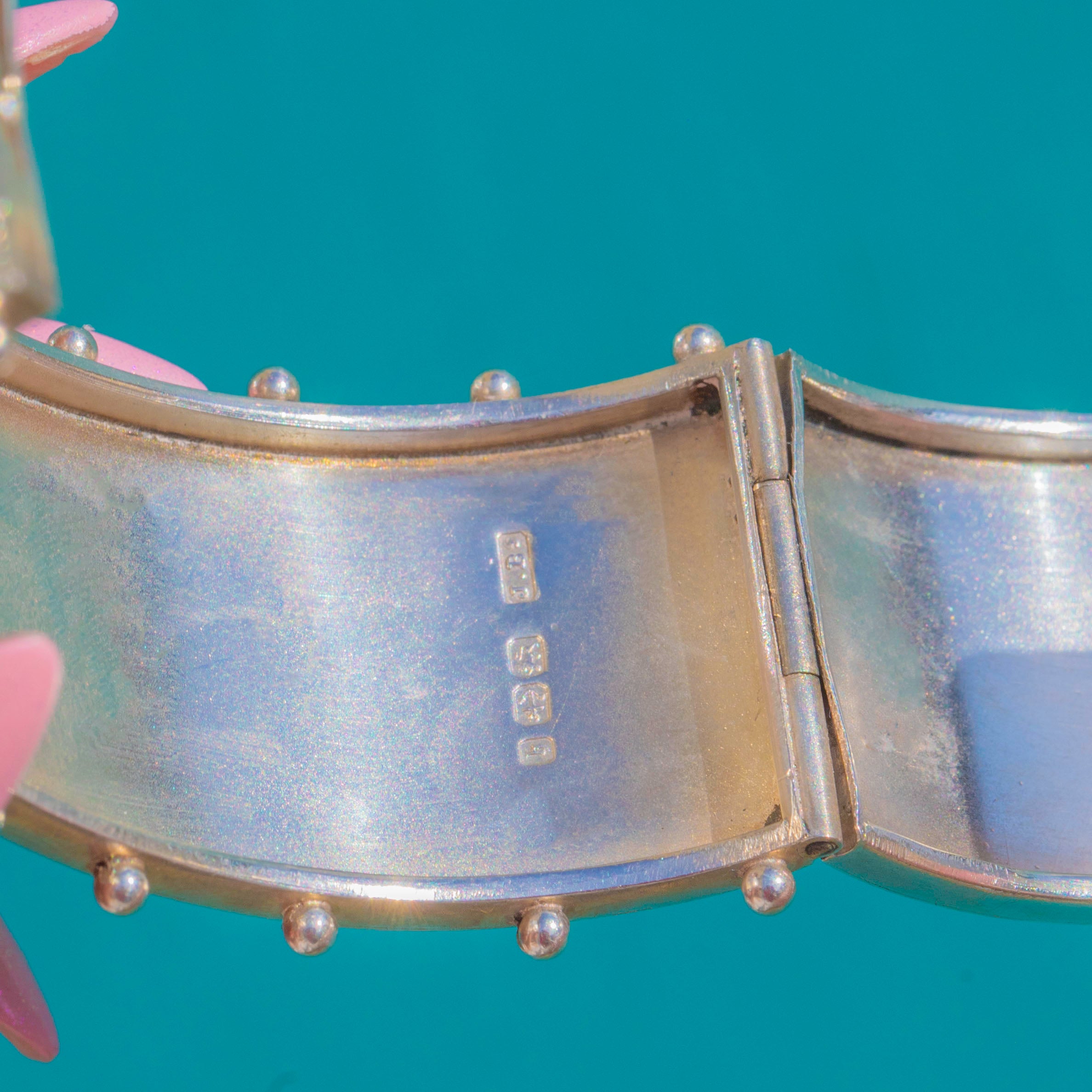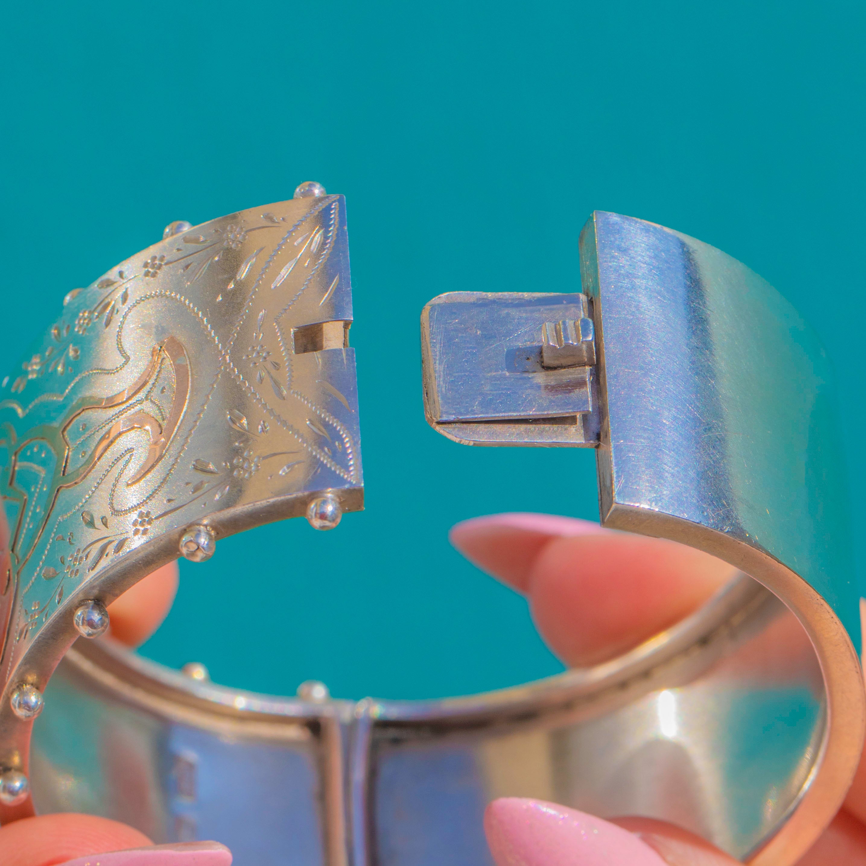 Hallmarked for 1882, the crisp chasing, scrolling cartouches and dotted accents embody the Aesthetic movement’s love of nature and texture. The articulated construction closes with a secure tongue-in-box clasp, and the piece has a satisfyingly substantial presence at 33.2g.