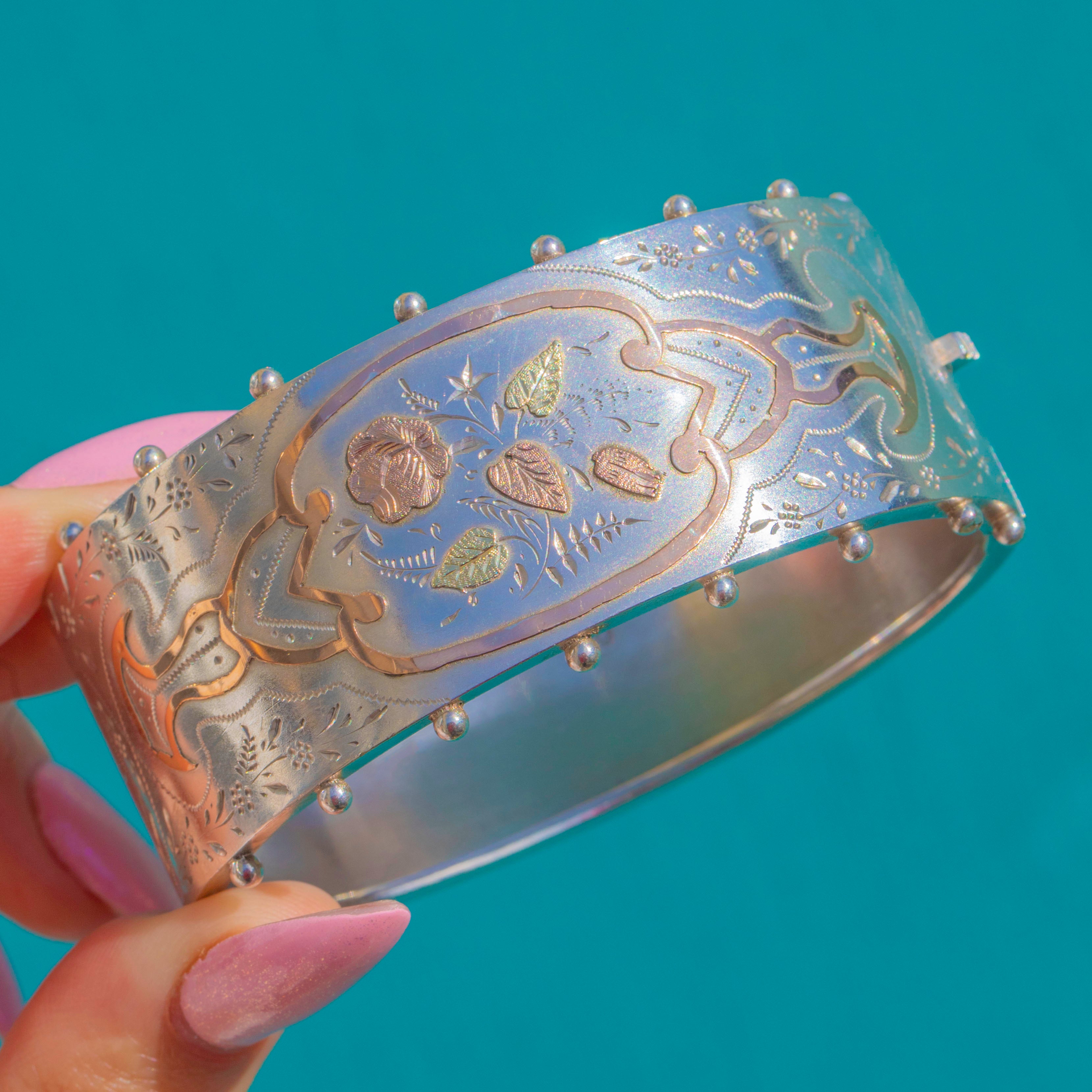 Victorian Aesthetic Silver Bangle 9ct Rose Gold & Green Gold Flowers, c.1882