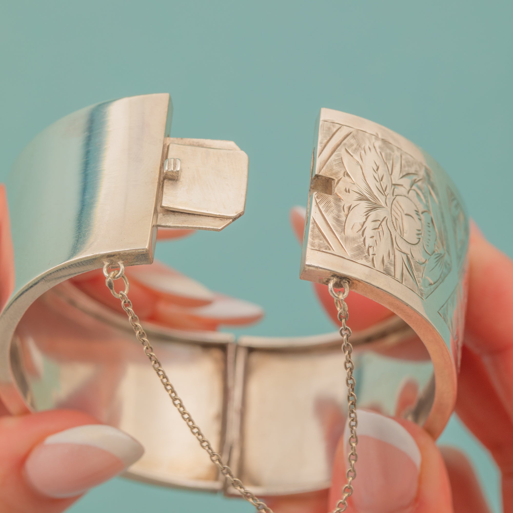 VERY GOOD: This Victorian Aesthetic Silver engraved bangle is in very good condition. The bangle itself has maintained a great form, with the engravings along the front remaining crisp. On the back, there are a few light dings and surface marks but nothing untoward. The clasp shuts securely and the bangle sits comfortably around the wrist!