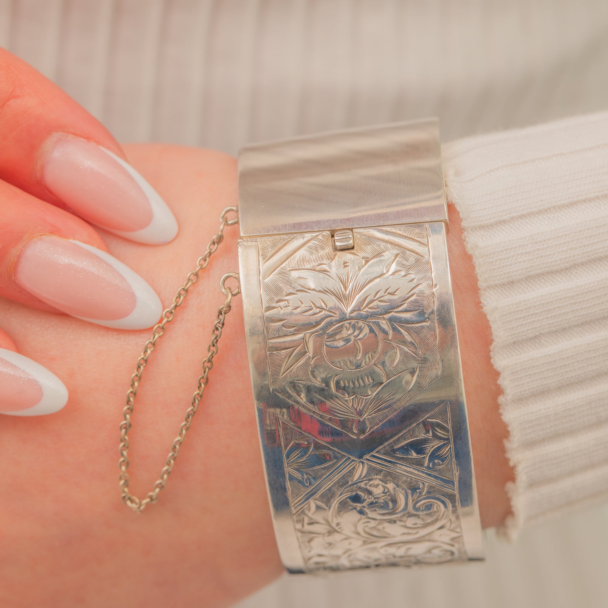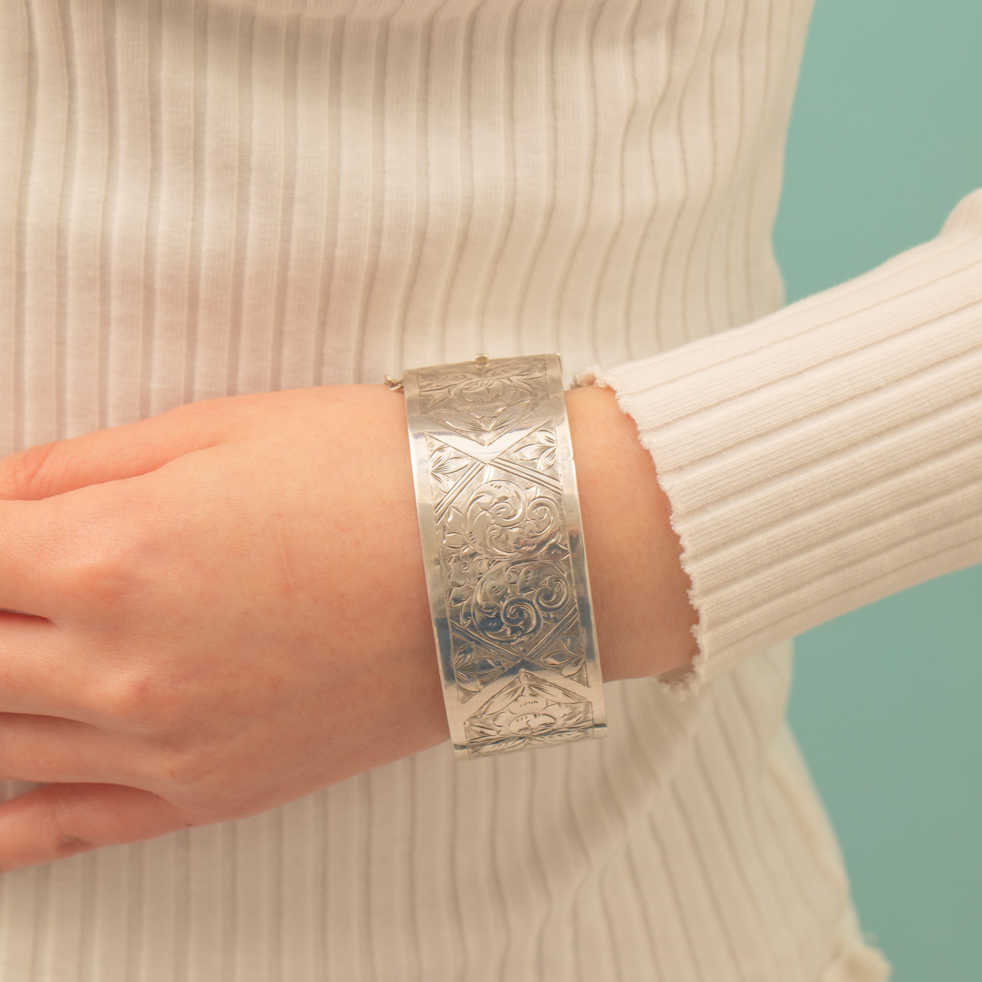 Crafted from wonderfully glossy Sterling Silver, this wide bangle provides great wrist coverage. If you are looking for some statement wrist candy, this antique Silver cuff bangle is a top choice.