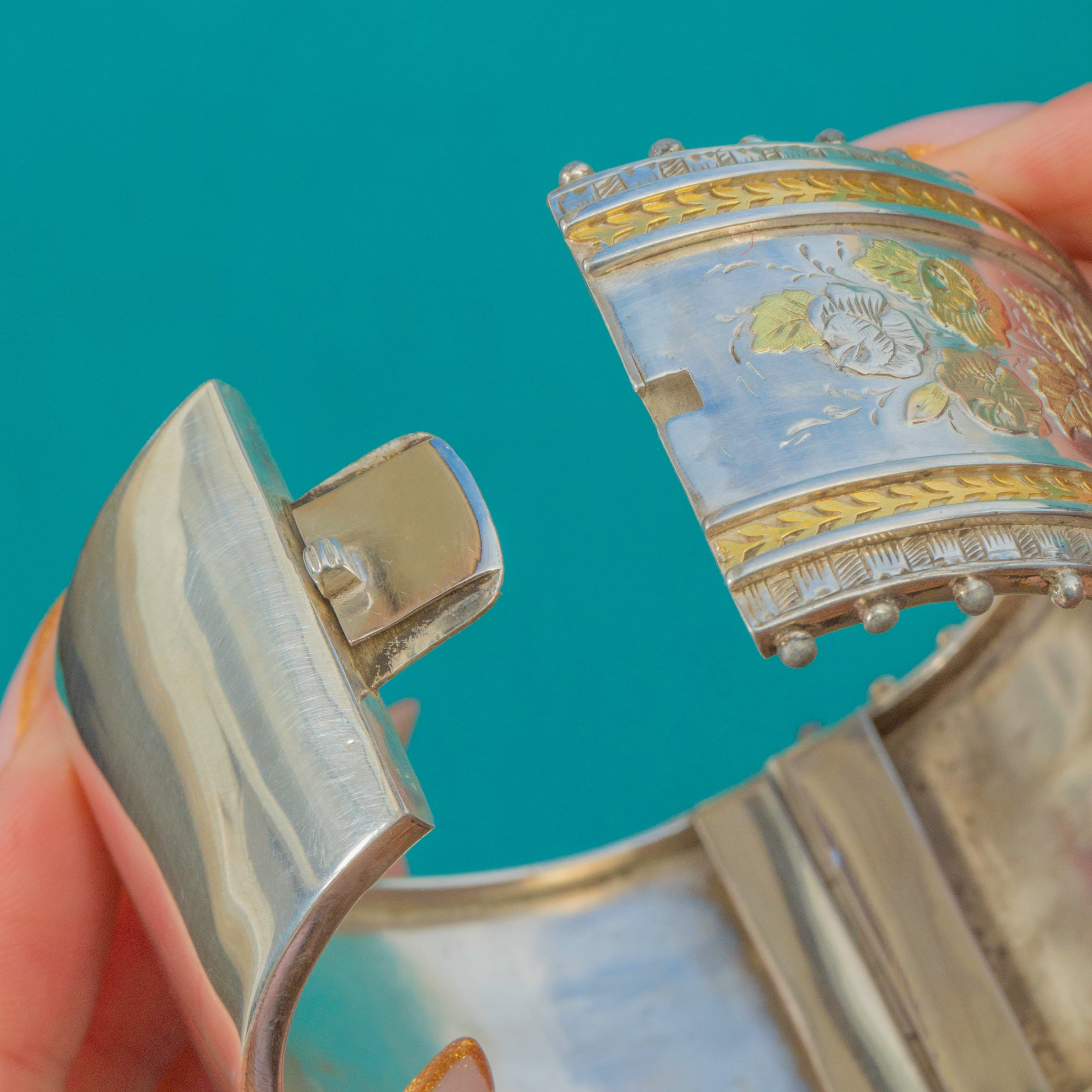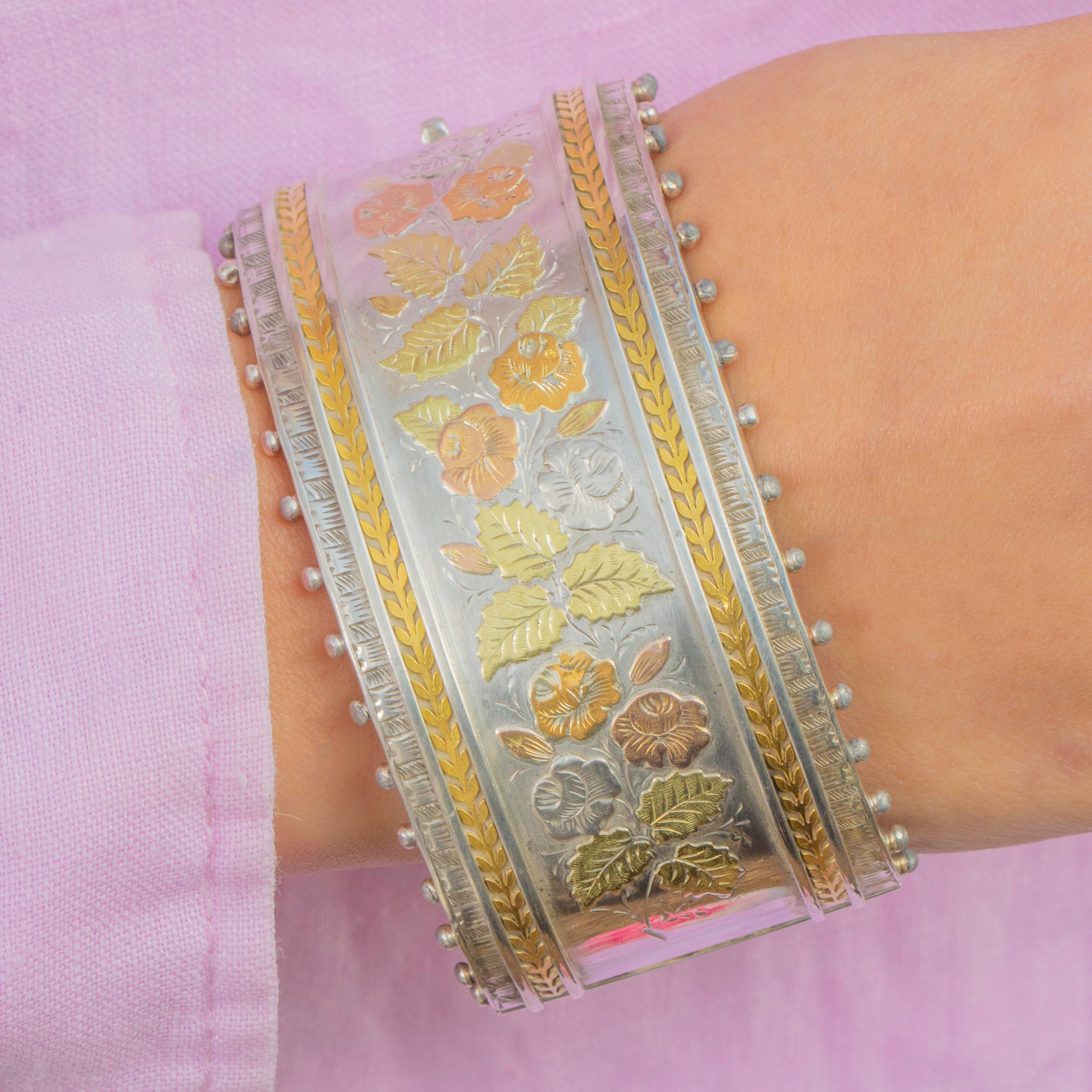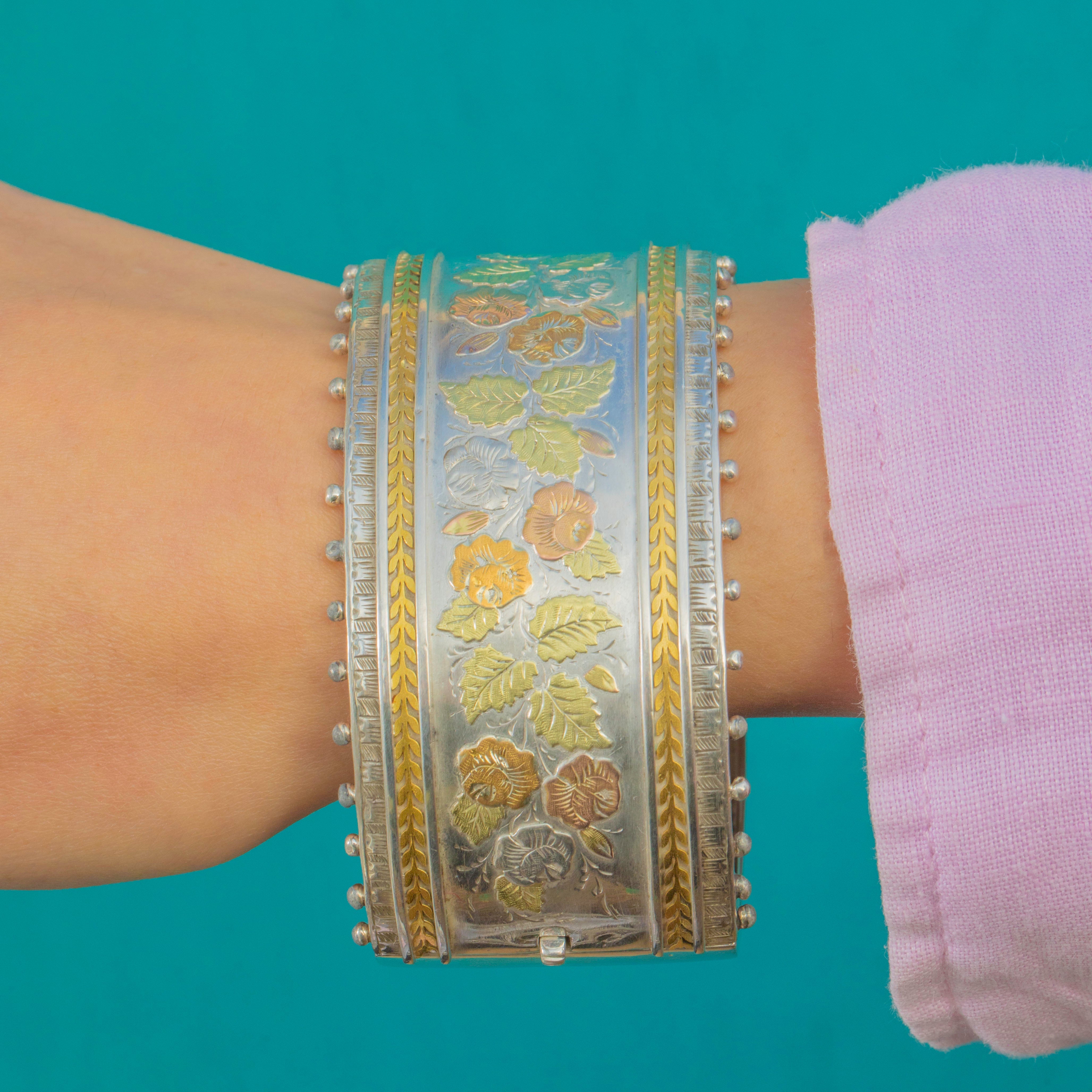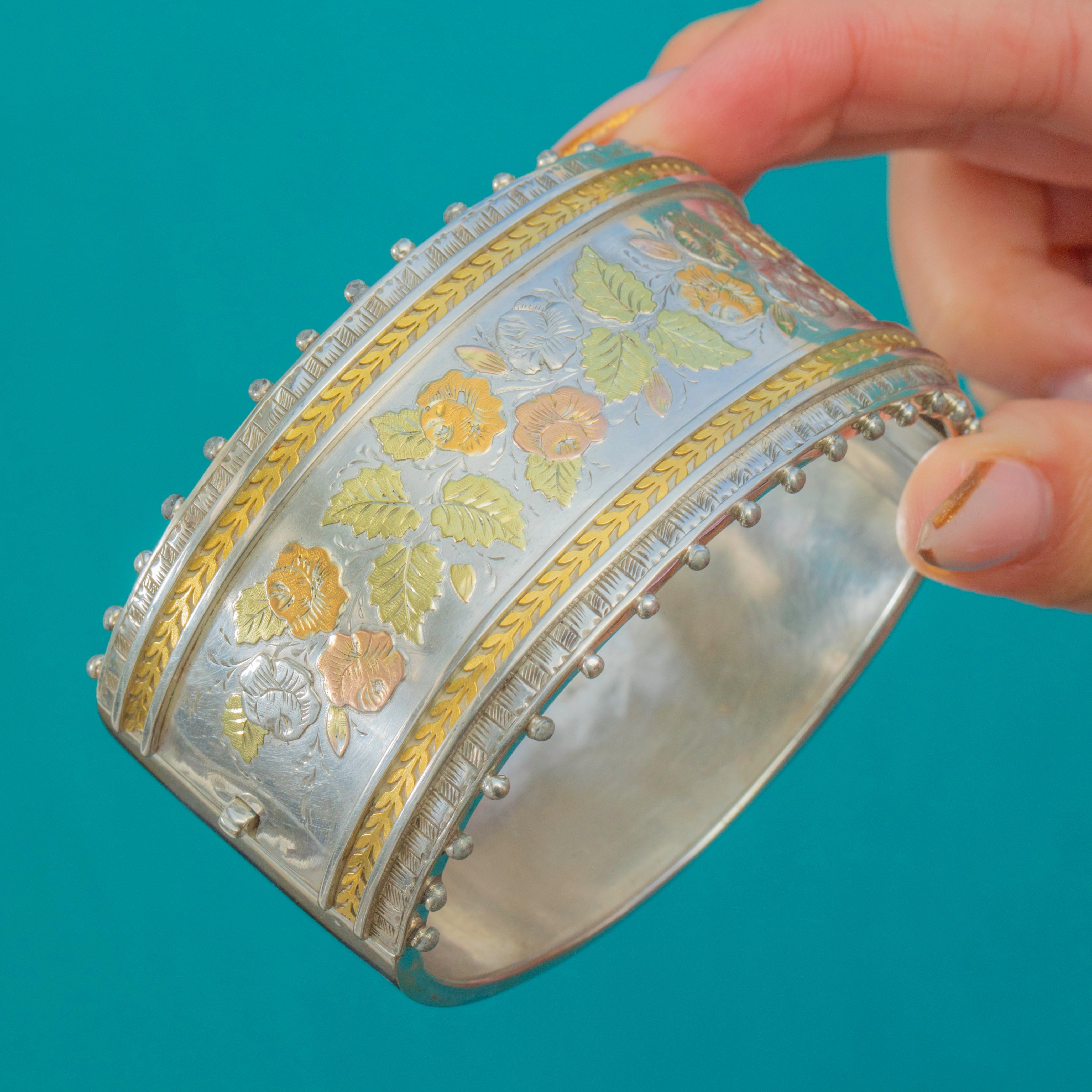 Victorian Aesthetic Sterling Silver Bangle 9ct Gold Flowers & Leaves