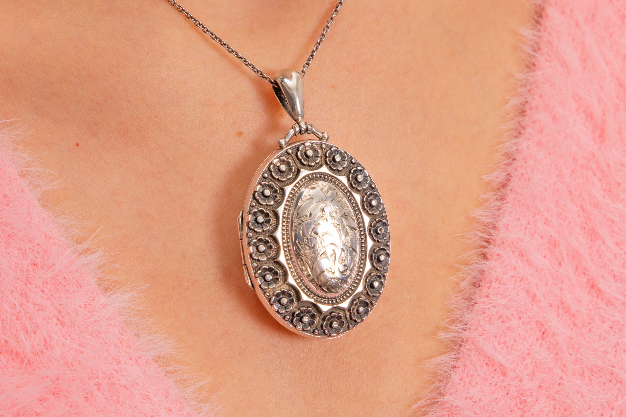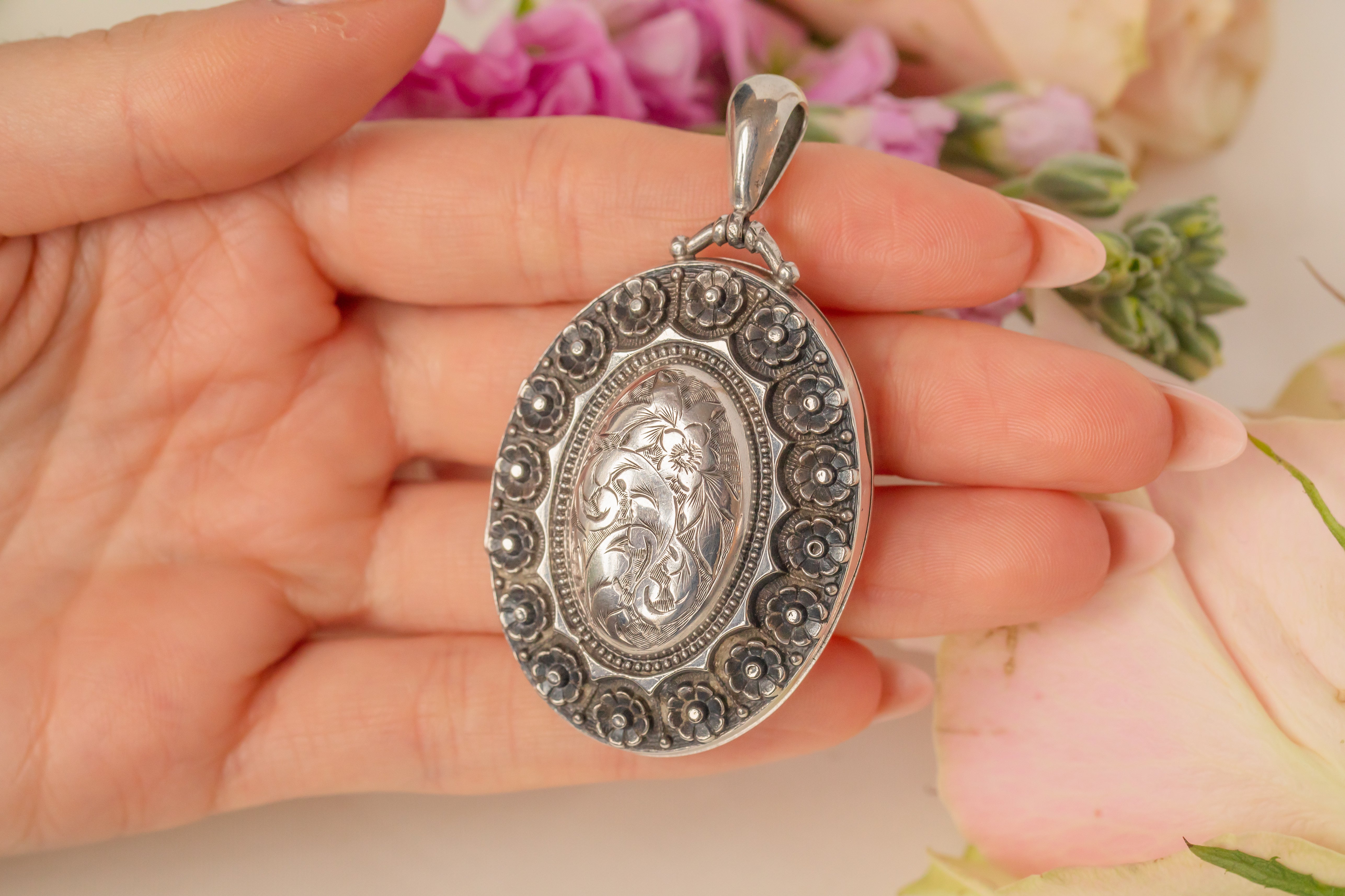 VERY GOOD: This Victorian Aesthetic Sterling Silver flower locket is in very good antique condition. The embossed flower border has accrued a notable patina, allowing the details to pop! All the engravings are crisp and clear and her back is glossy. The back has some small dings and light surface wear, however, it reflects light beautifully drawing all attention away. Her full set of hallmarks are clear to the naked eye. Although she doesn't fully seal when shut, she closes with an all-important click, so you can insert photographs with confidence, knowing they will stay safe! The large bale allows you to suspend this Victorian Aesthetic locket from a chain of your choice.