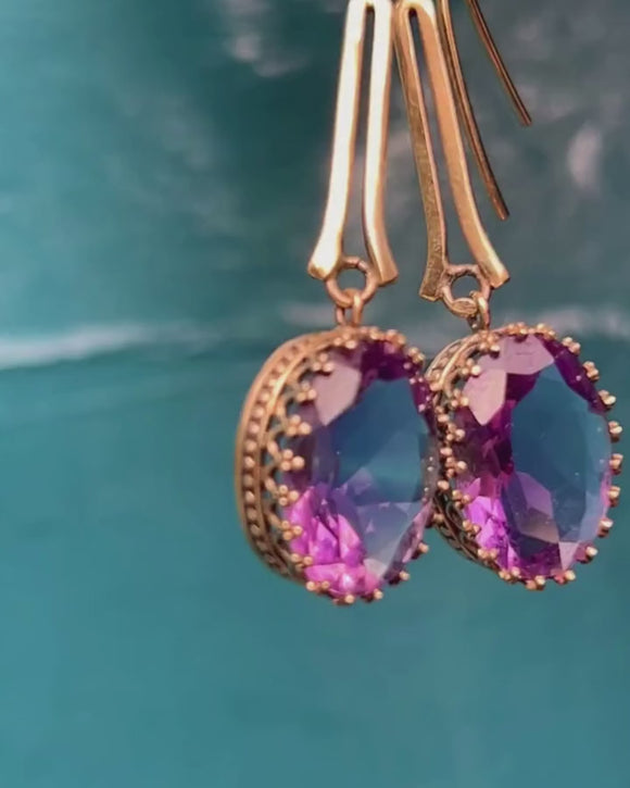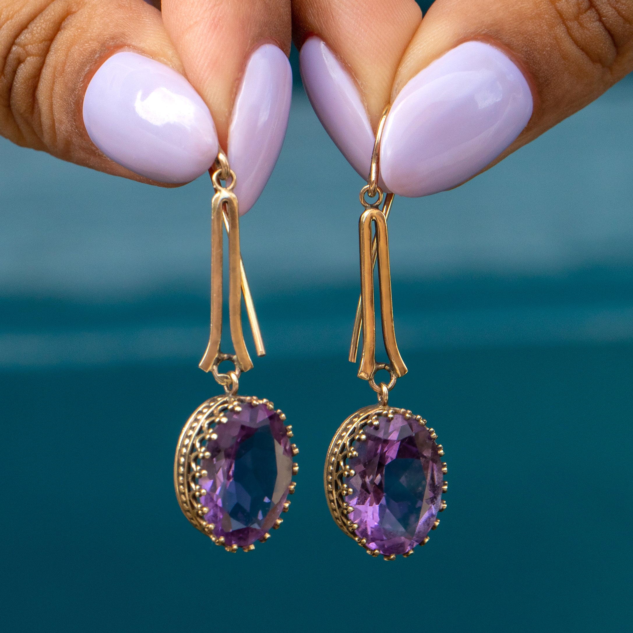 Orchid hues dance across the perfectly geometric facets of each Amethyst gem, elegantly swaying from a 9ct Gold lozenge drop. Simply pop these Victorian earrings in and they'll take you from day to night with ease!