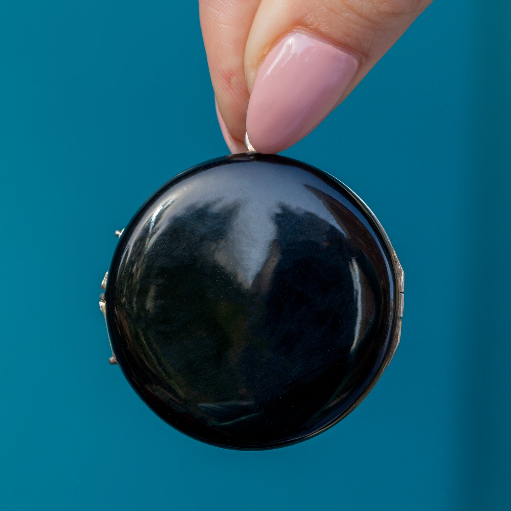 VERY GOOD. This Victorian black Enamel Pearl round locket is in very good condition! The black Enamel covers both the front and back, and although there is some age-related wear on either side, she has lovely reflective qualities. The Pearl is secure and adds a lovely shimmering accent. One original frame remains inside the locket, but we feel she could still hold two photographs inside if cut to the correct size. The doors shut with a firm click allowing you to wear this antique Enamel locket the utmost confidence!