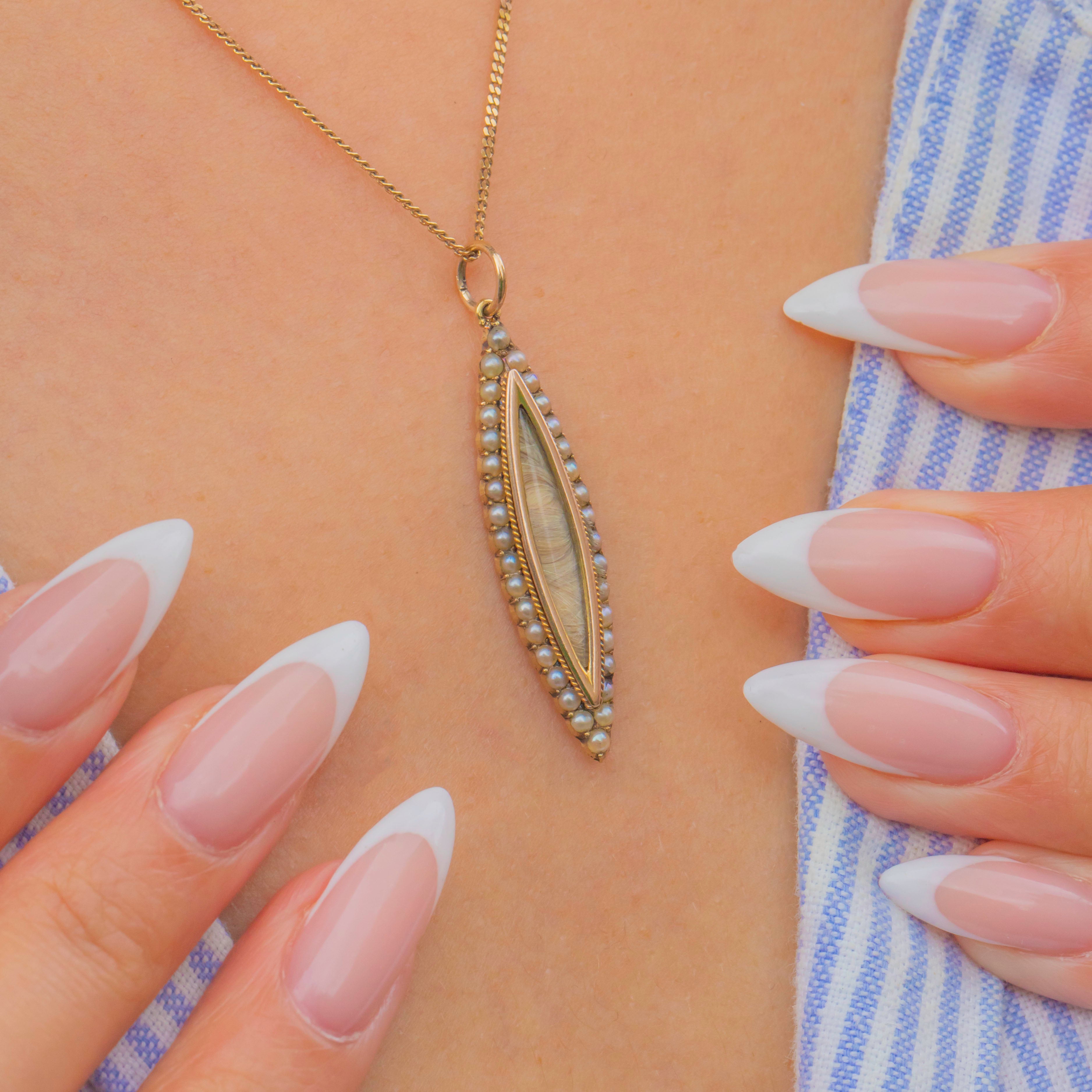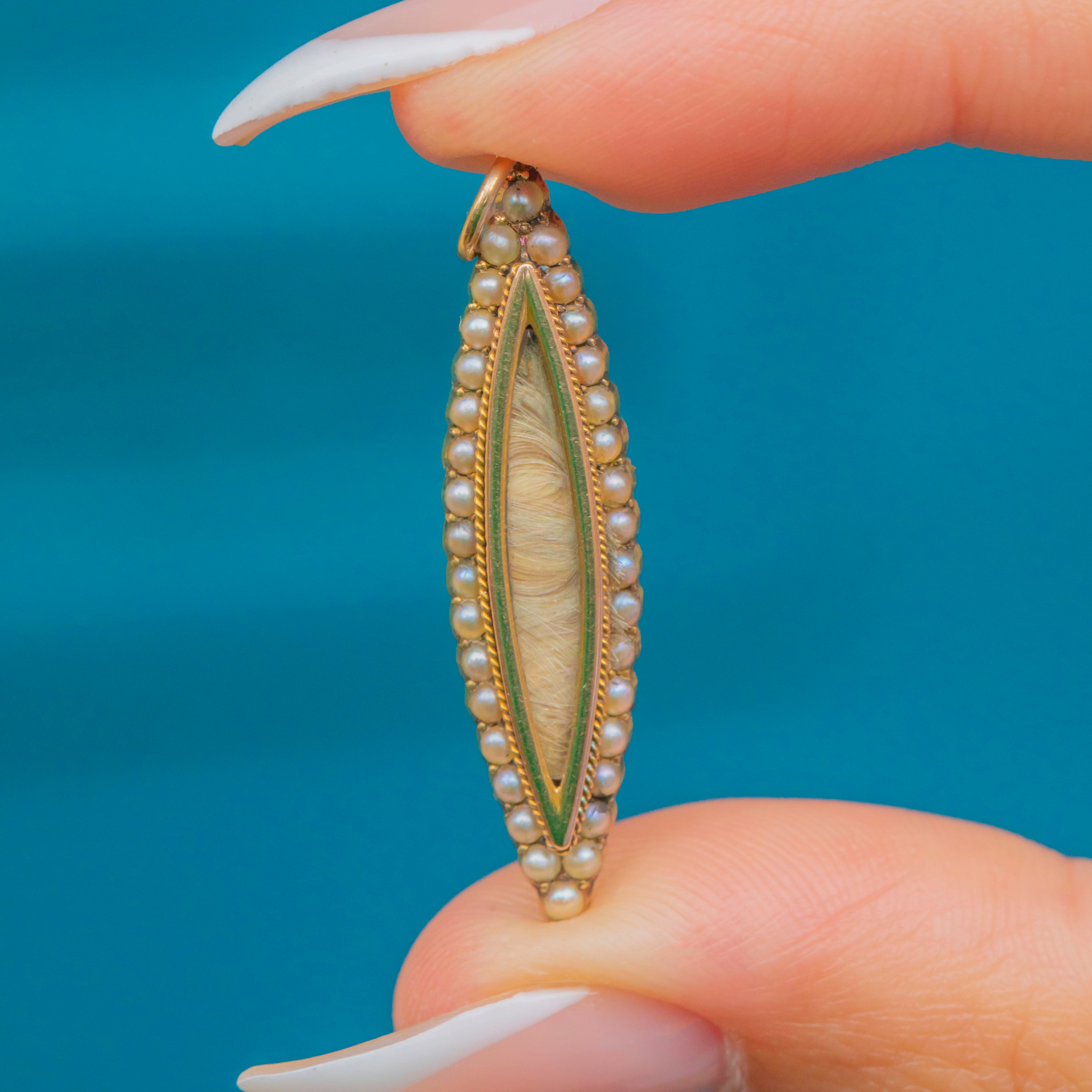 EXCELLENT: Light surface wear and fine scratches consistent with age; no dents or splits noted. The navette frame remains true with crisp edges and the 18ct jump ring is secure. Central hair compartment is intact and can be opened to remove the blonde hair if desired.