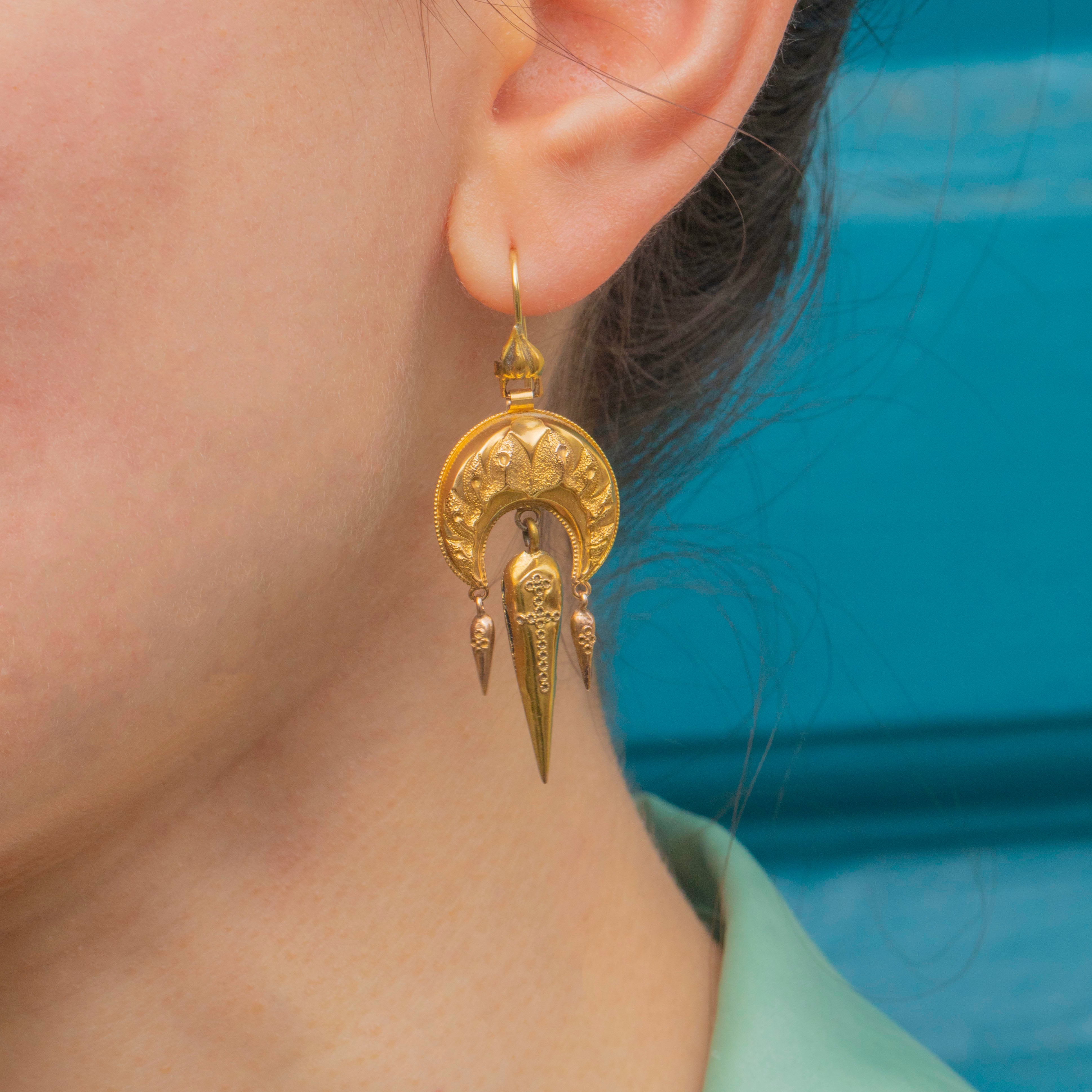 Victorian Etruscan Revival 15ct Gold Fancy Drop Earrings
