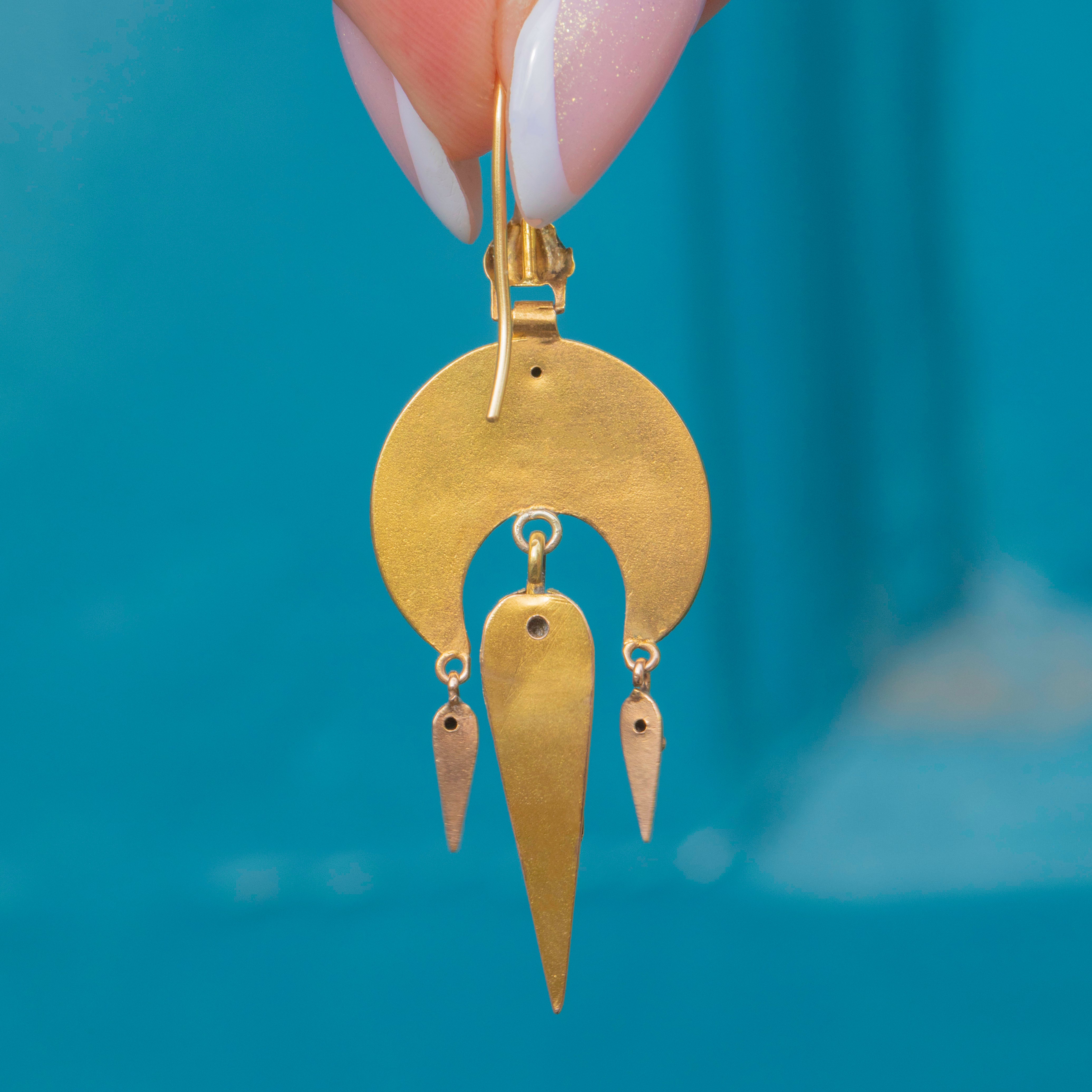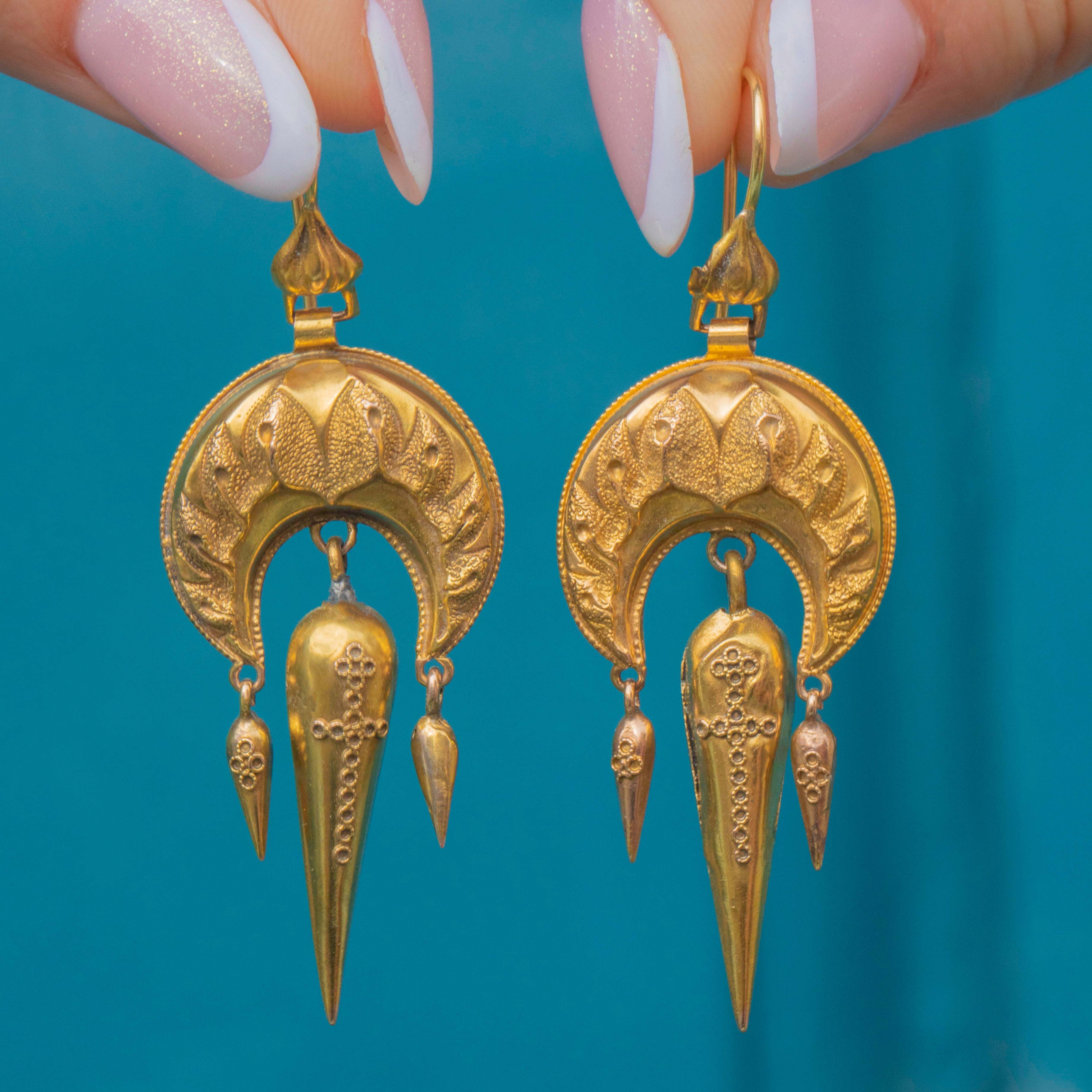GOOD-VERY GOOD: These Victorian Etruscan revival 15ct Gold fancy drop earrings are in great condition, especially when considering their grand age! The Gold is bright and the details have been well preserved for the most part, with only one of the smaller torpedo drops missing the cannetille details. Each component is hollow making the earrings lightweight and comfortable to wear. However, this does mean that they have sustained some dings over the years, most notably to one of the large torpedo drops where the solder joint has also split in one area. However, as the earrings are brimming with intricate details, this wear doesn't detract from their overall impact and, treated and worn with care, they will continue to delight for many more years to come! The hooks are long and slender and securely affixed, so these standout antique Etruscan revival Gold earrings can be worn with comfort and confidence!