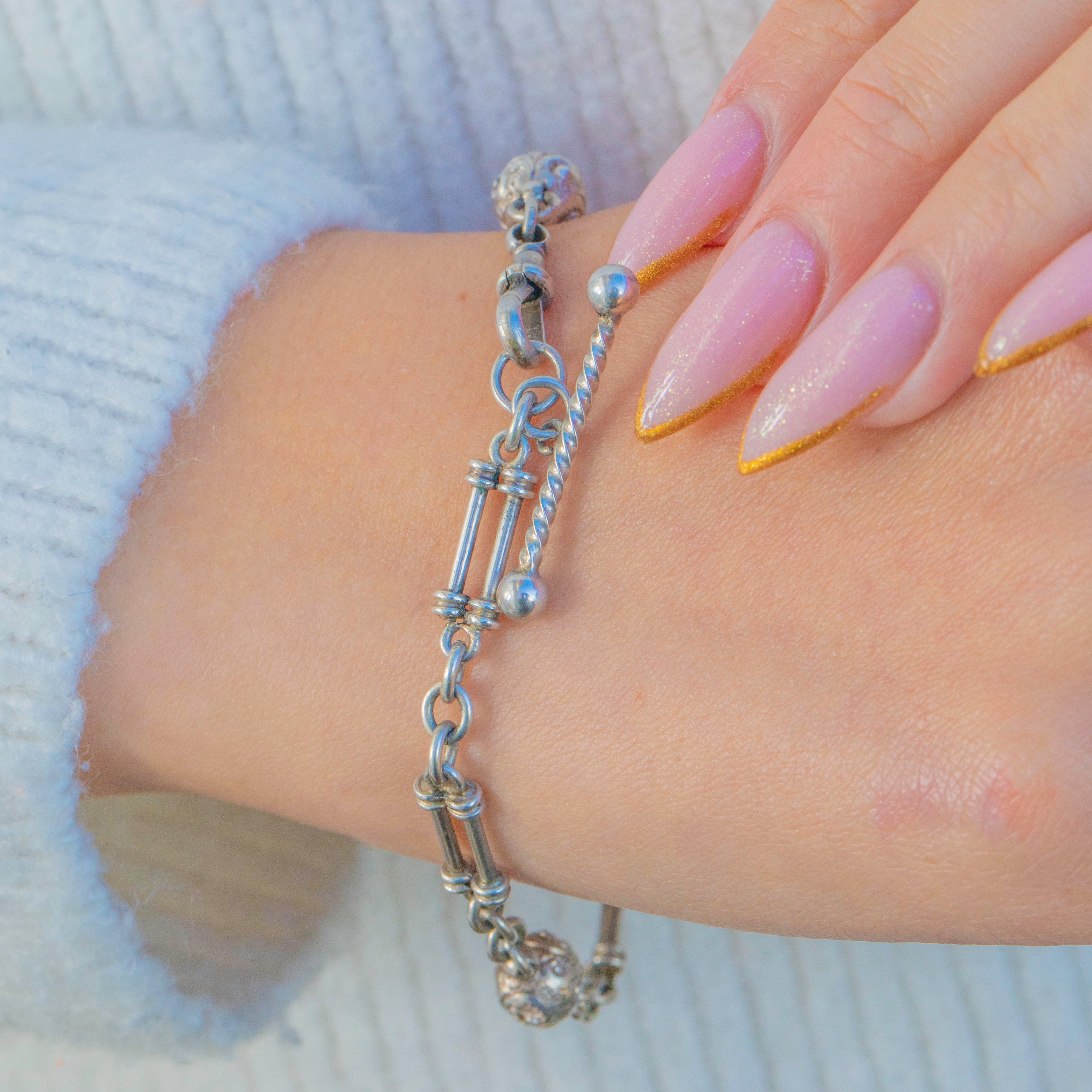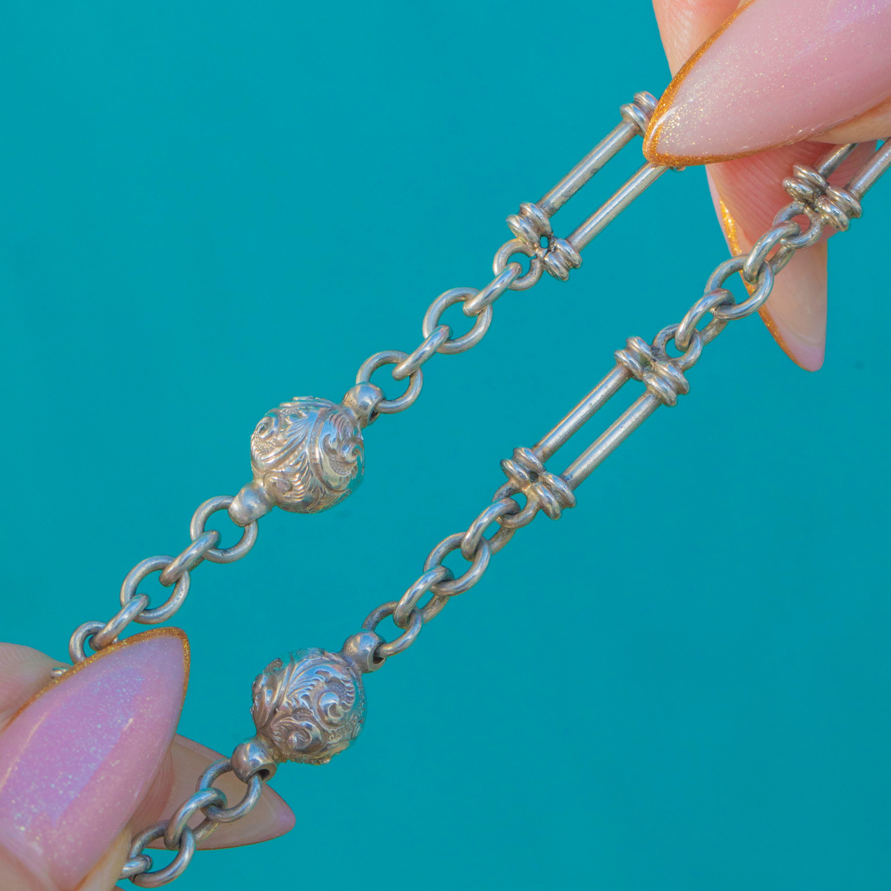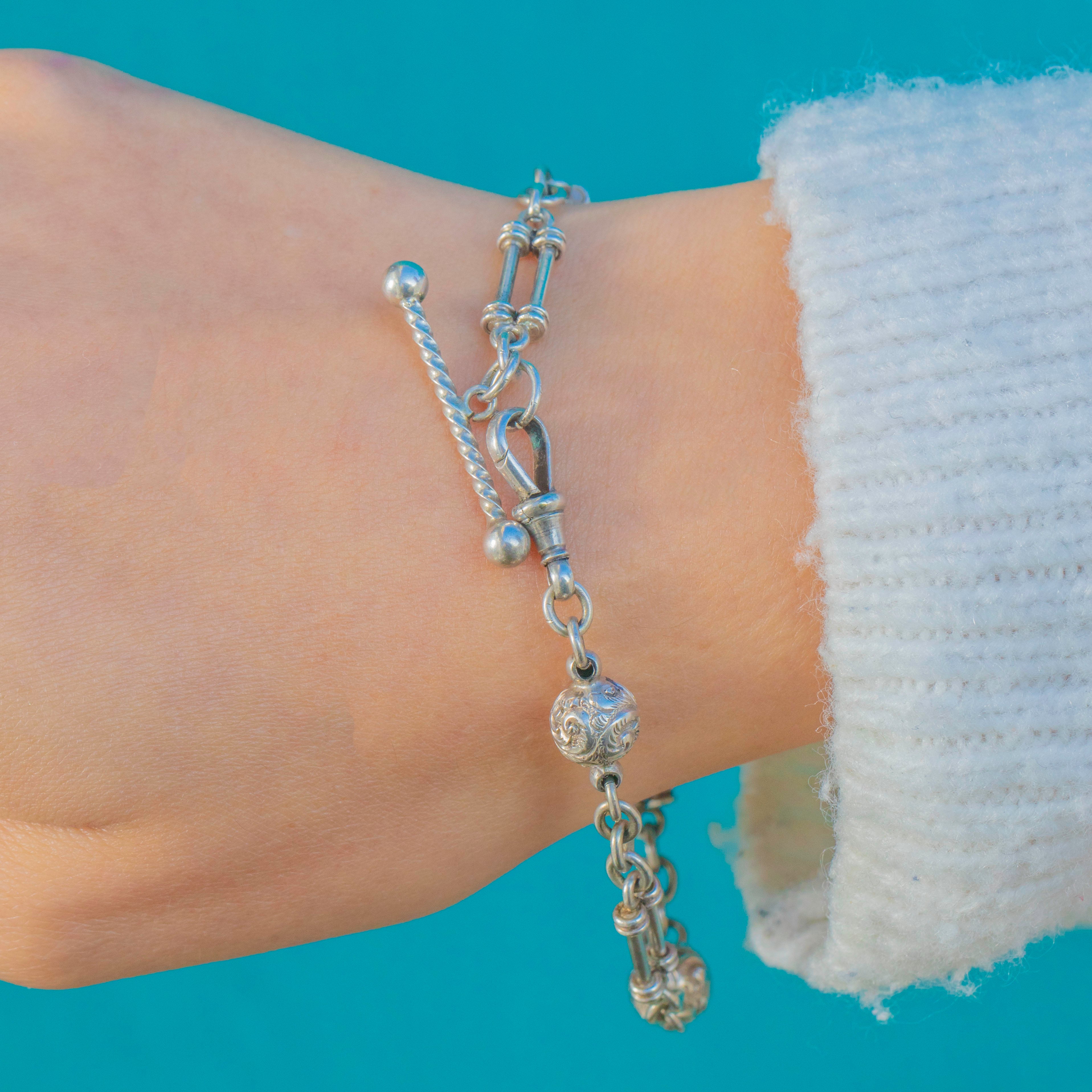 This charming Victorian Silver Albertina chain bracelet features ornate ball spacers and classic double-bar links, creating that elegant, slightly decorative look so loved in 19th-century pocket-watch jewellery. Light and wearable with lovely detail, it retains its original T-bar and dog clip—ideal for wearing as a bracelet, attaching charms, or styling as part of a layered wrist stack.