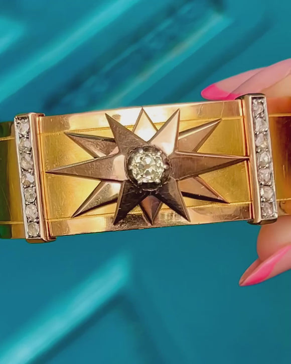 VERY GOOD. An excellent Victorian French 18ct Gold old-cut Diamond star cuff bangle is in excellent condition! The Gold has a rich saturation throughout and has held its form well, it remains a robust piece that can be worn regularly with confidence. There is some surface wear on the back of the bangle, with some very light imperfections / surface scratches to note, but this isn't immediately noticeable and does not distract from the overall impact of the piece.