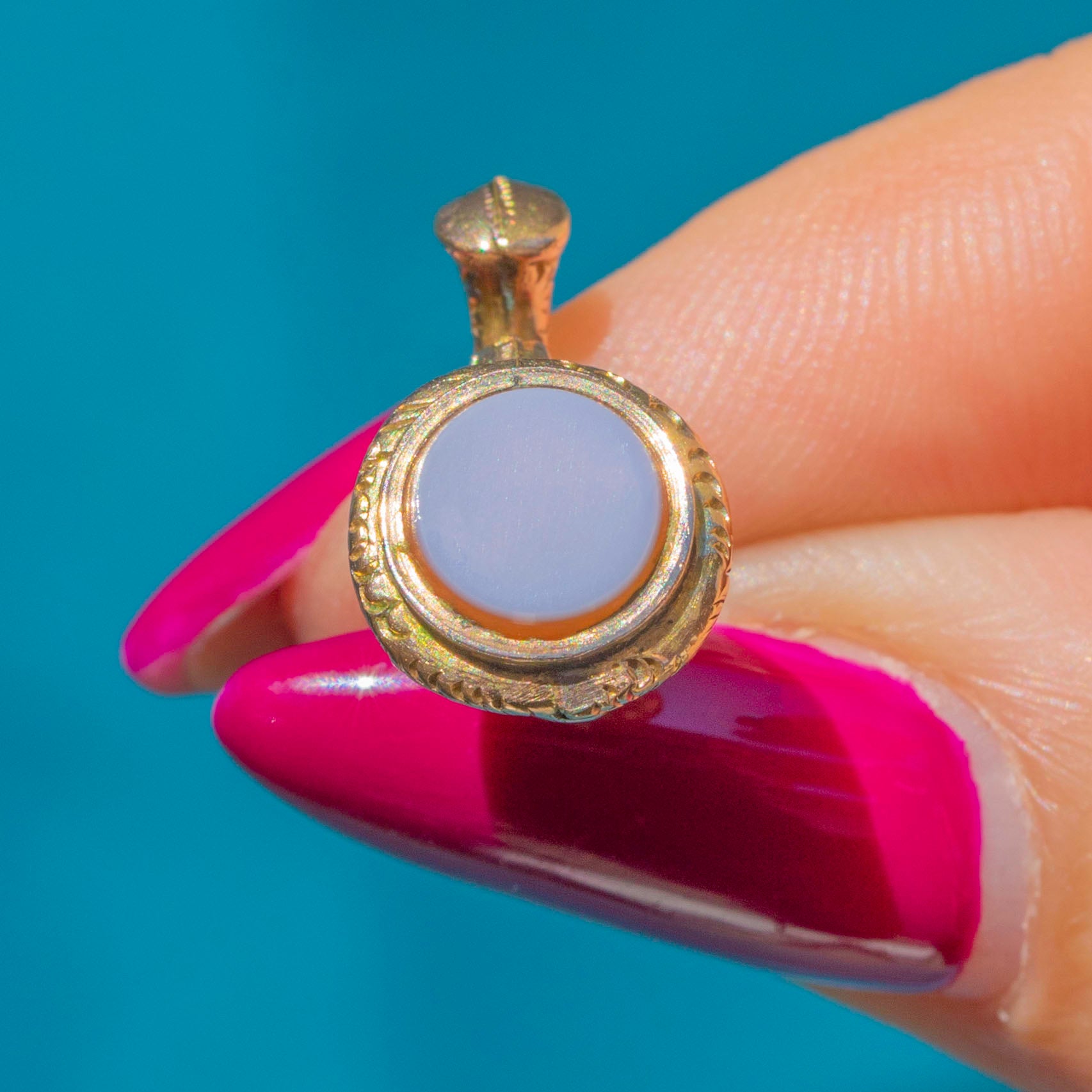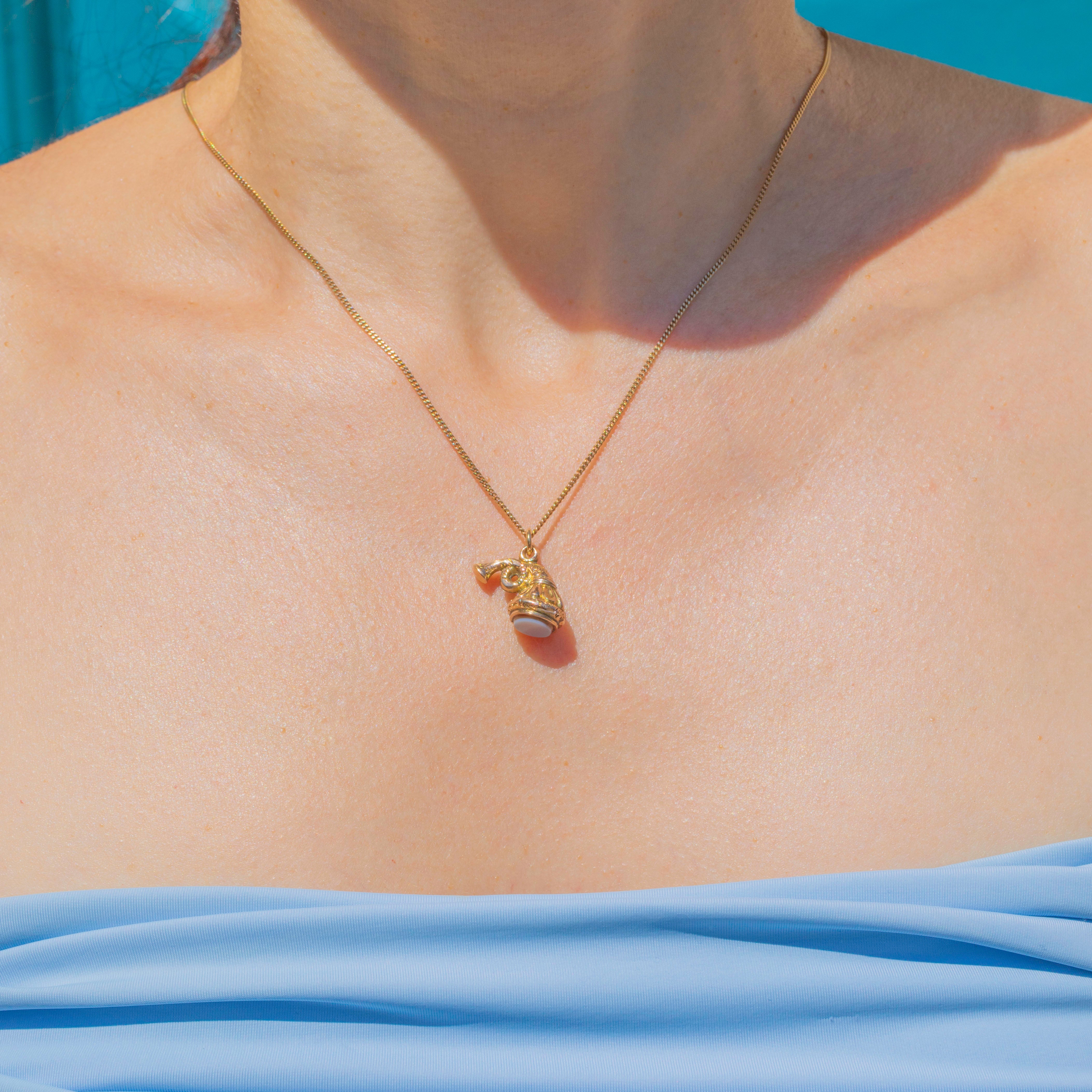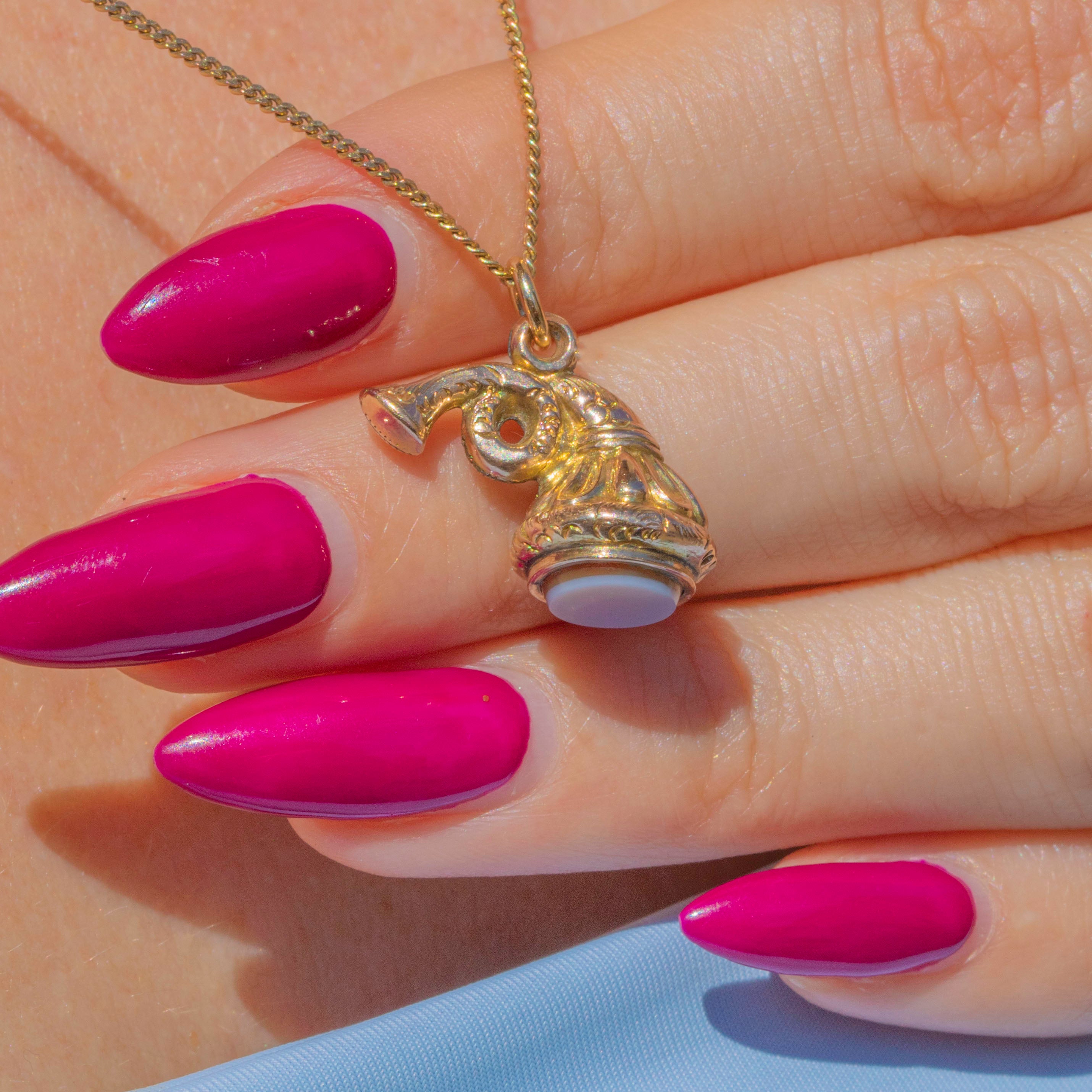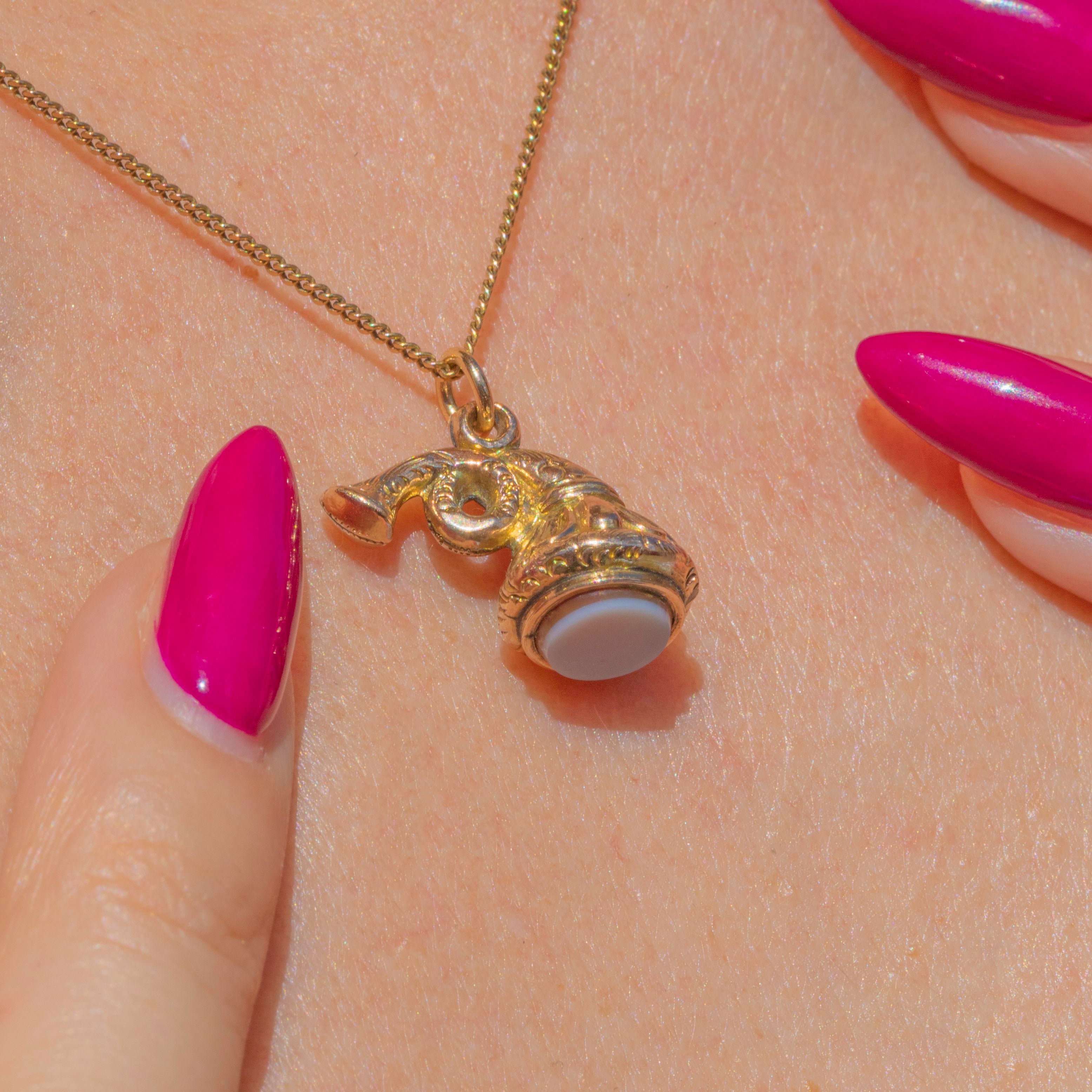 This ornately formed antique cornucopia charm boasts a glossy 9ct Gold exterior with finely engraved details covering its entirety, and displays a smooth slab of Sardonyx at its base.