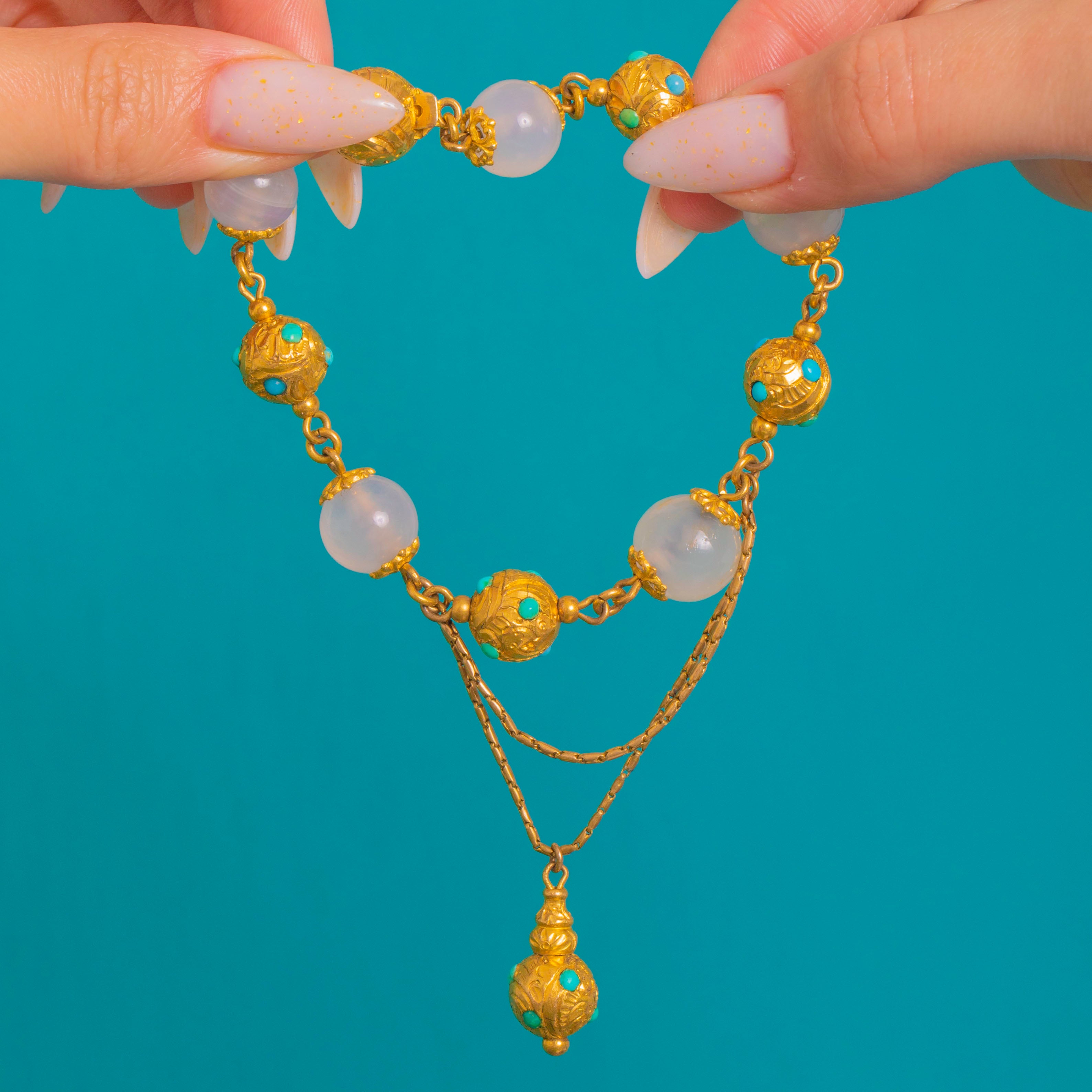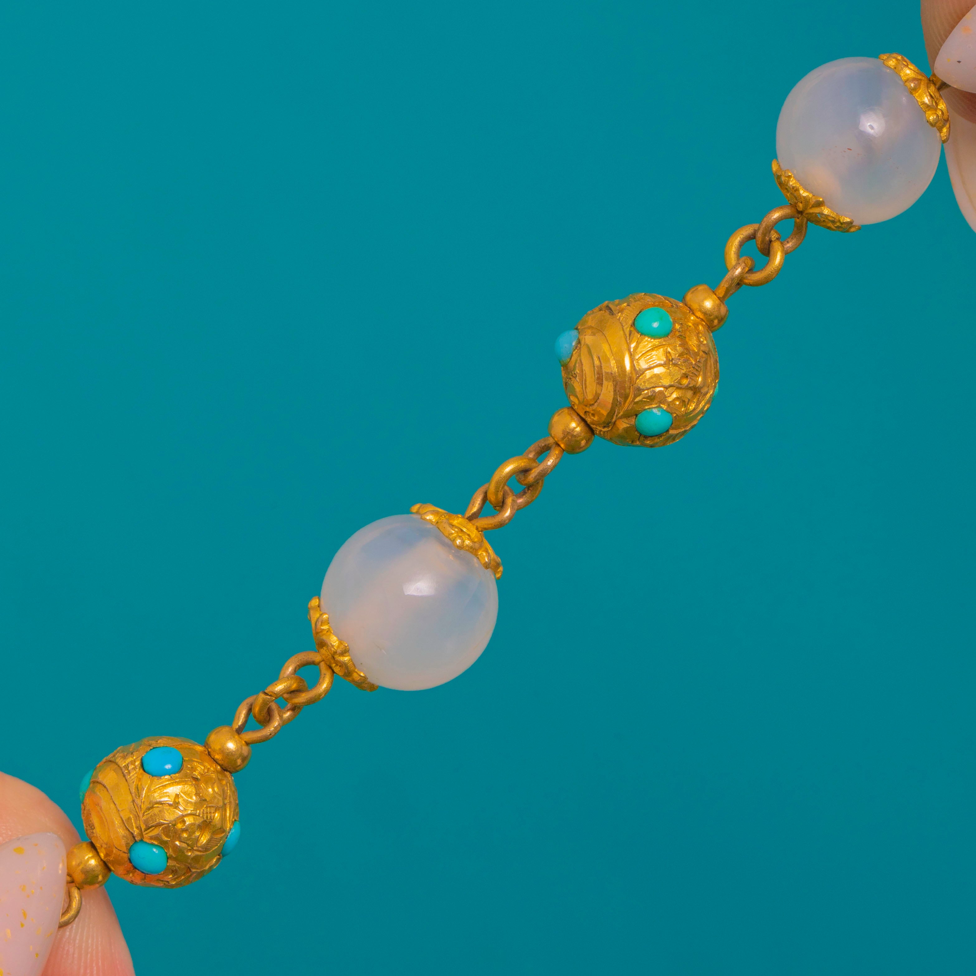 Sumptuously detailed and irresistibly tactile, this Victorian Gold gilt bracelet embodies the romance of Etruscan Revival design. Alternating ornate chased globes with luminous, milky Chalcedony spheres, each golden orb is embellished with rope-twist and granule accents and dotted with bright Turquoise cabochons for a lively hit of colour. The articulated construction gives beautiful movement, culminating in a charming acorn-like terminal drop.