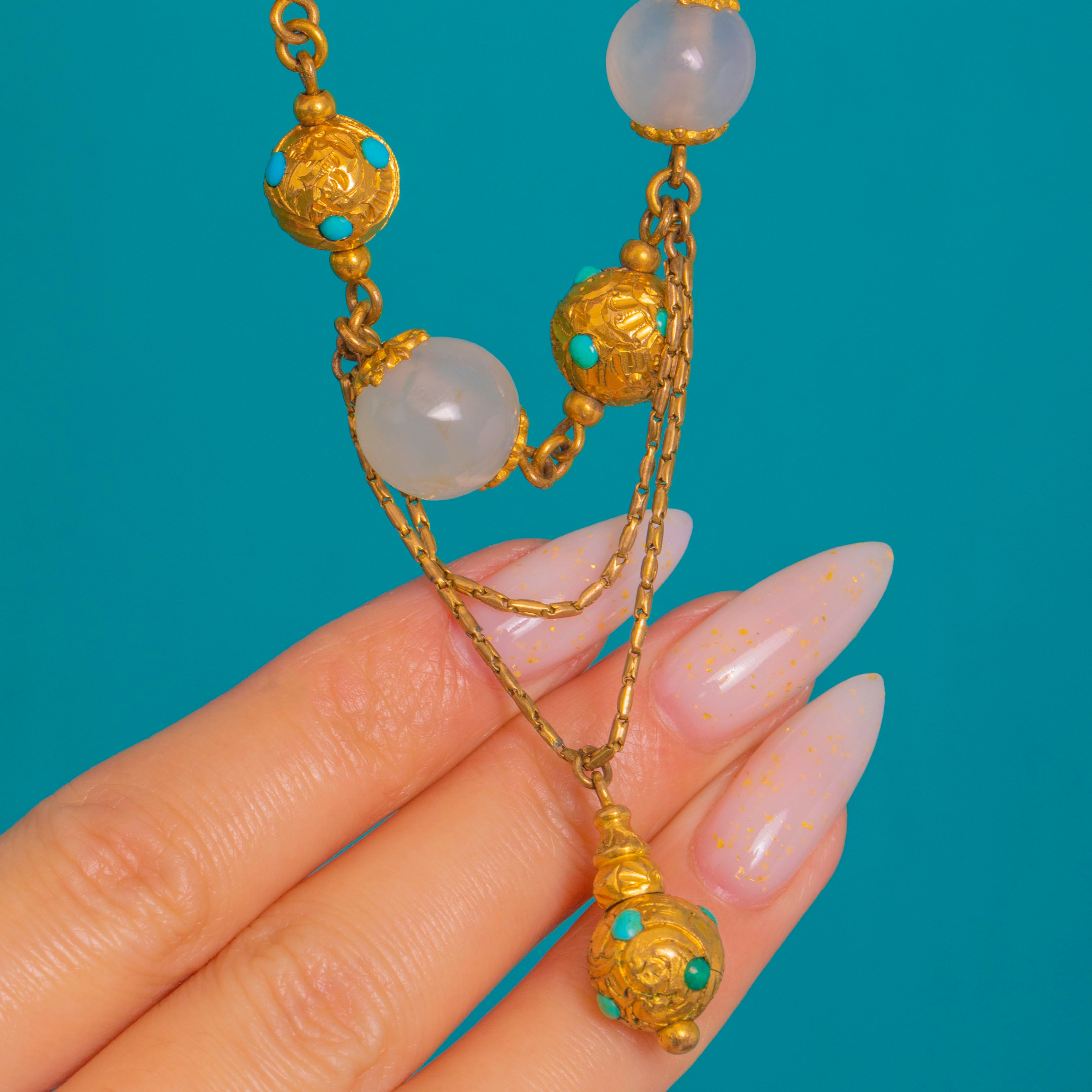 EXCELLENT: Chalcedony beads are bright and smooth with no obvious chips, and Turquoise cabochons are secure with minimal surface wear. The gilt metal shows a pleasing, even patina with crisp chased detail and secure links throughout. No visible repairs or alterations.