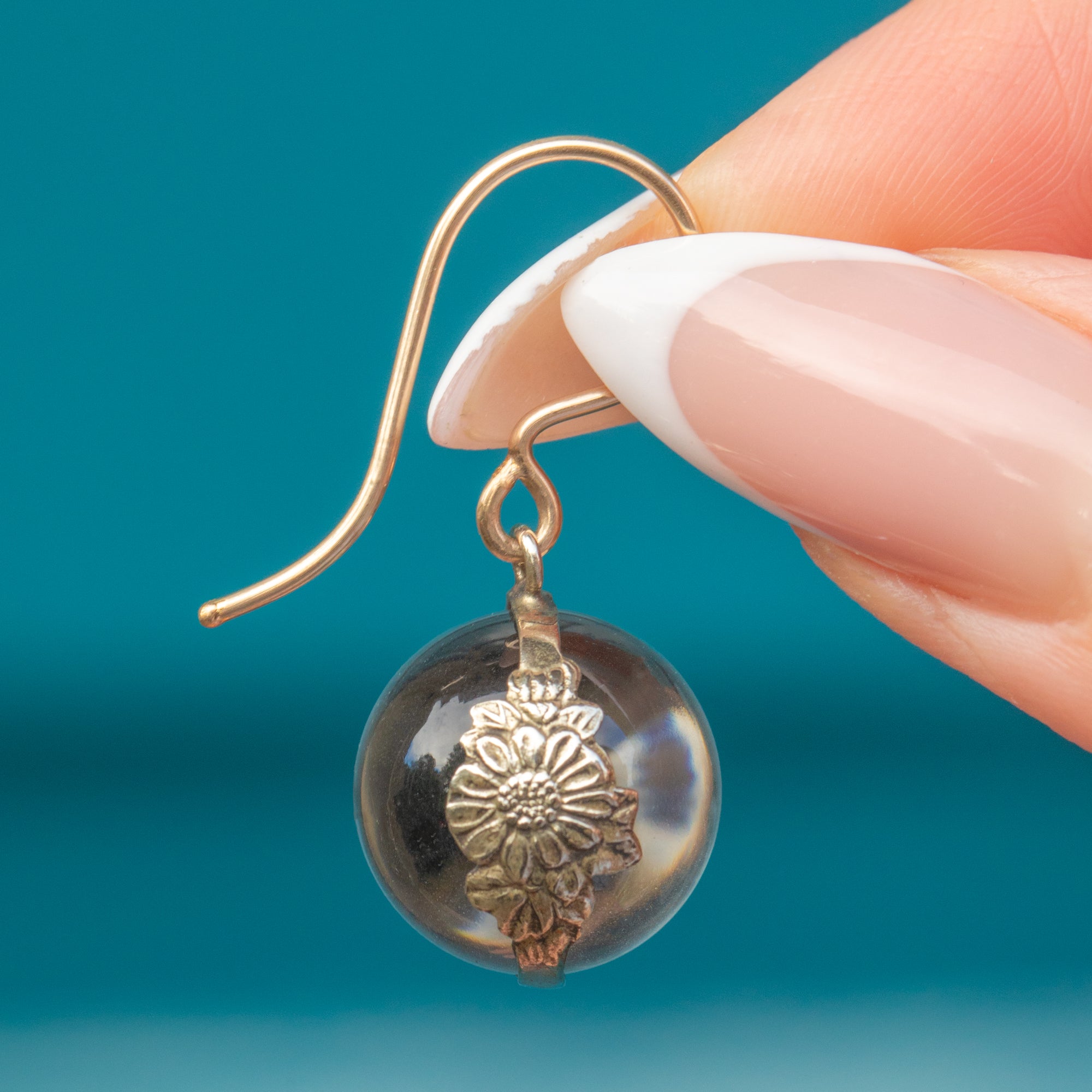 A rare pair of Victorian “Pools of Light” earrings, featuring clear Rock Crystal orbs that seem to glow with an inner light when they catch the light. These magical crystals are framed in delicate Silver floral mounts and suspended from 9ct Gold hooks for comfortable wear.