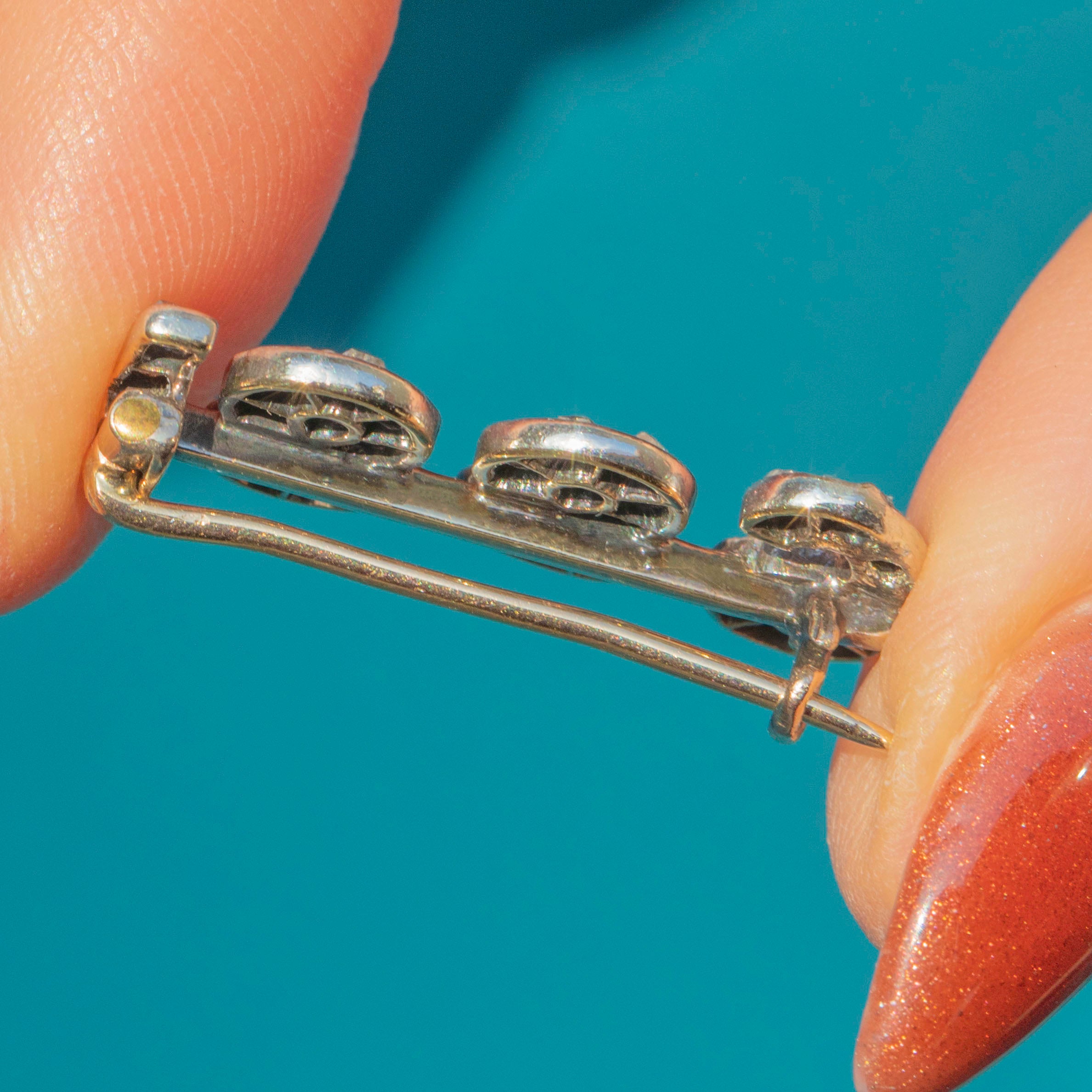VERY GOOD: This Victorian rose-cut Diamond 1889 brooch is in very good condition. Her rose-cut Diamonds are radiant and set securely within their settings. There are some signs of wear to the Silver settings commensurate with age, however, this does not affect her functionality. With her 9ct Gold pin in perfect working order, this Victorian brooch is a must-have!