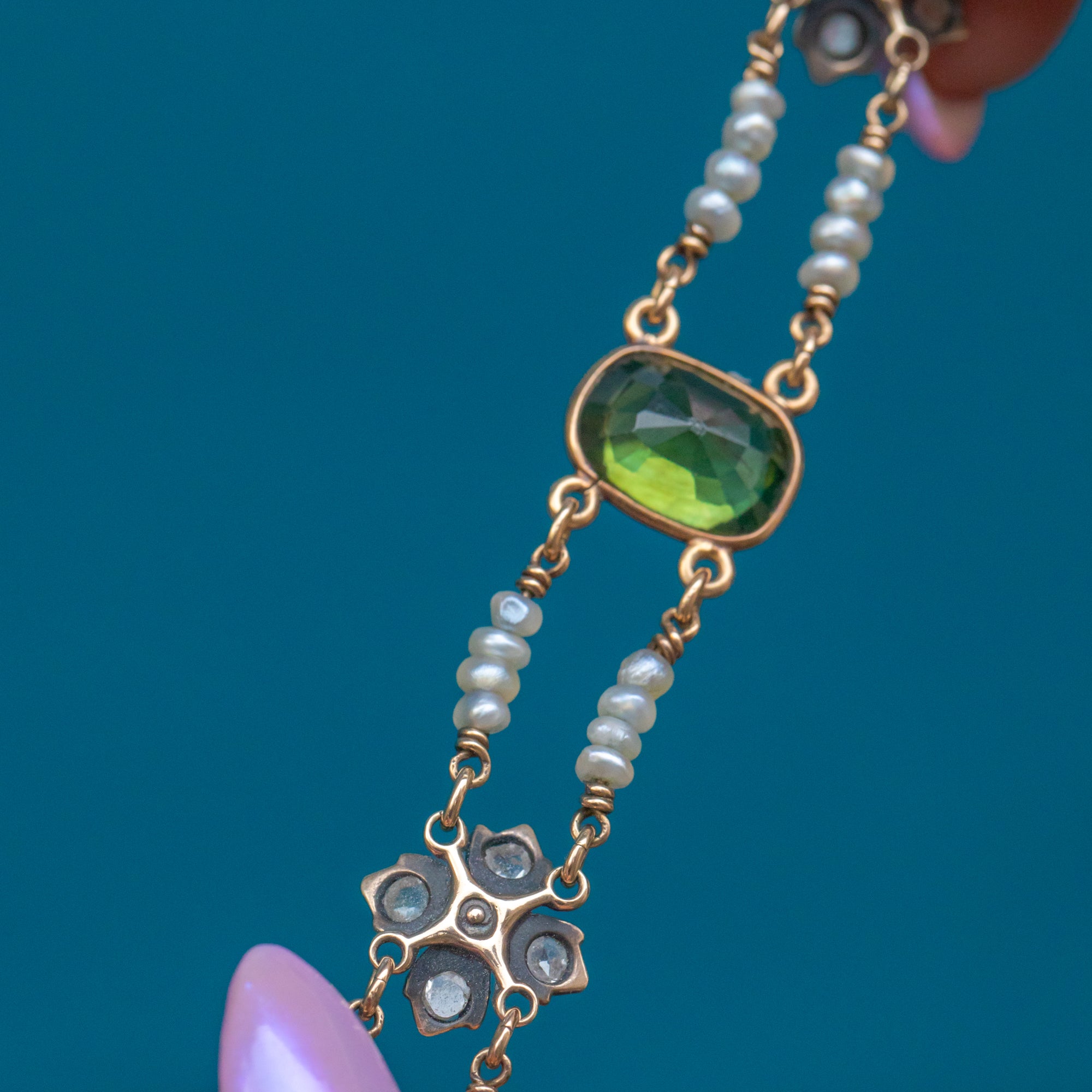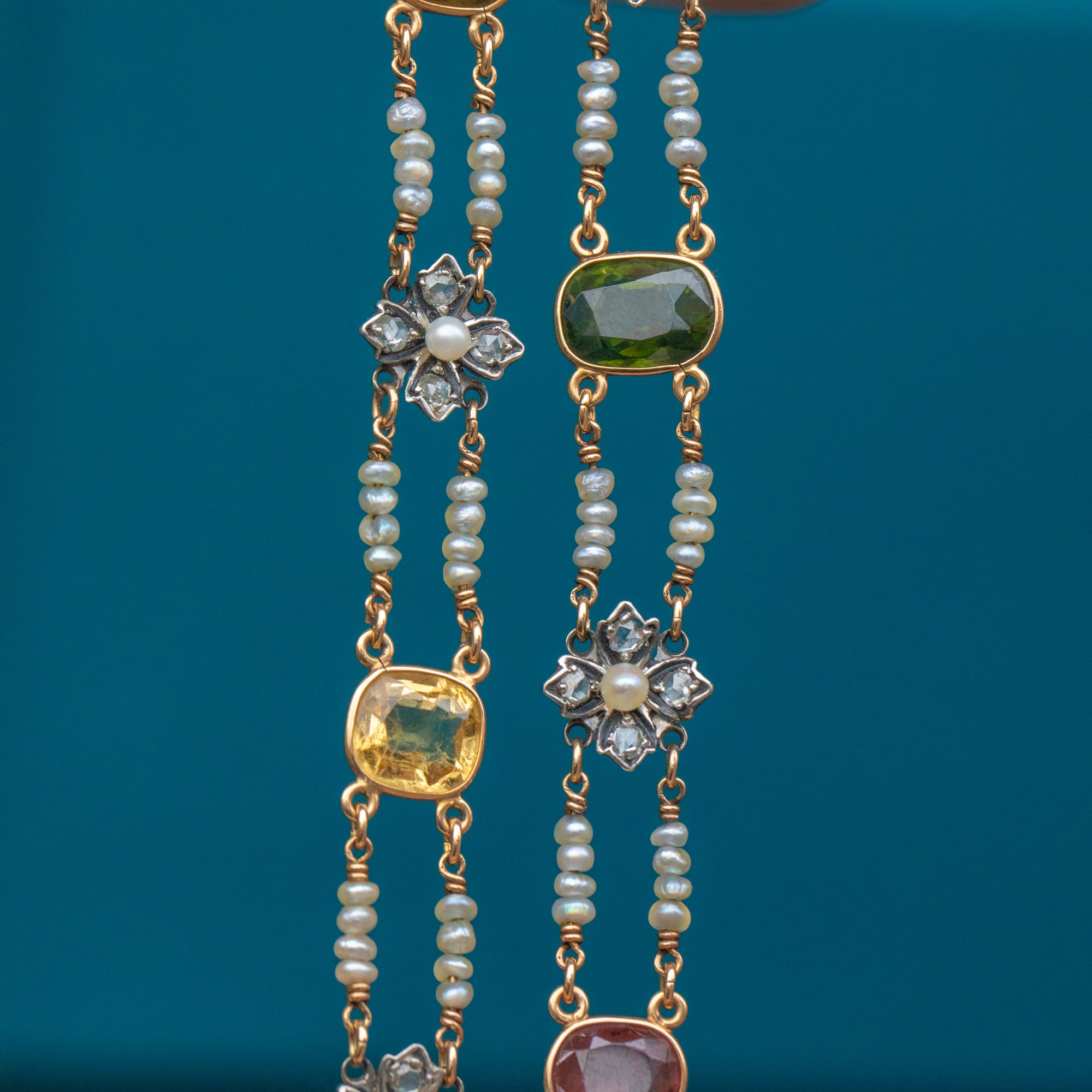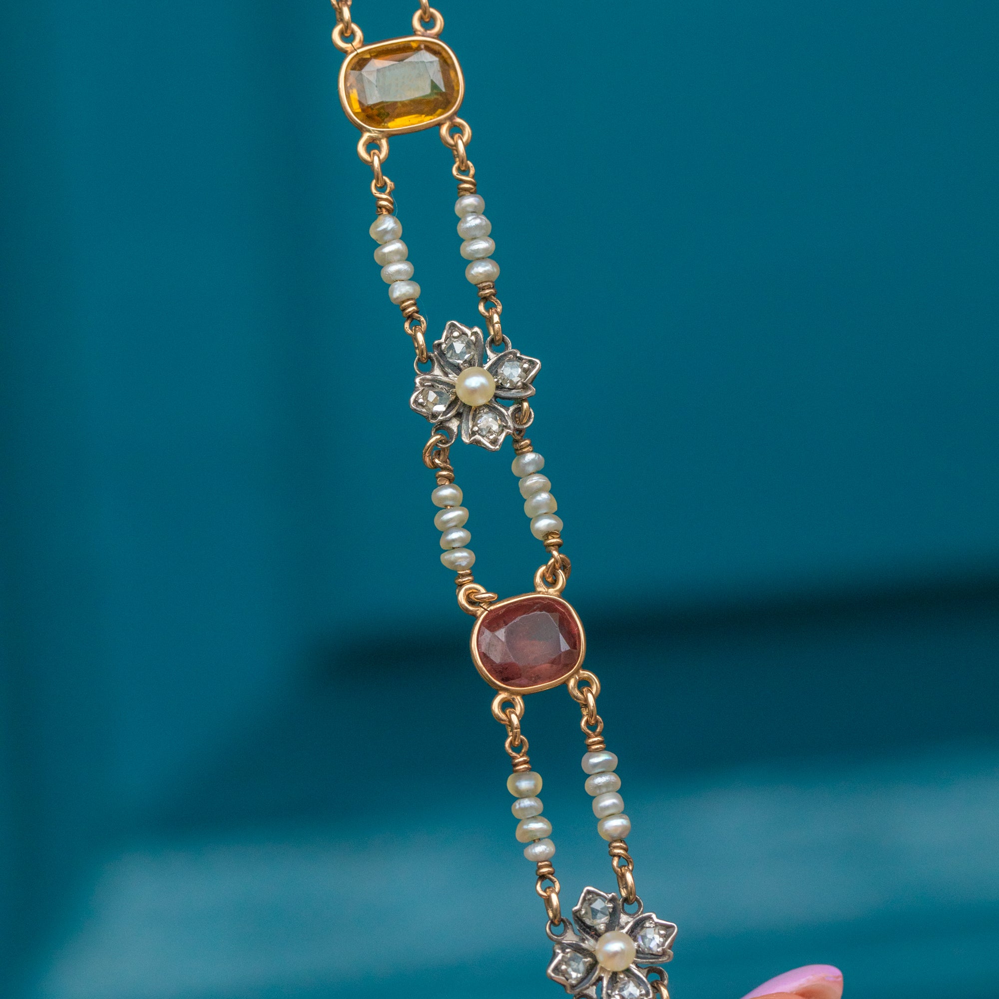 The necklace has been handcrafted from 18ct Gold, with smooth bezel set gems & rose-cut Diamond set flowers and Pearls aplenty, she is certainly a rare heirloom!