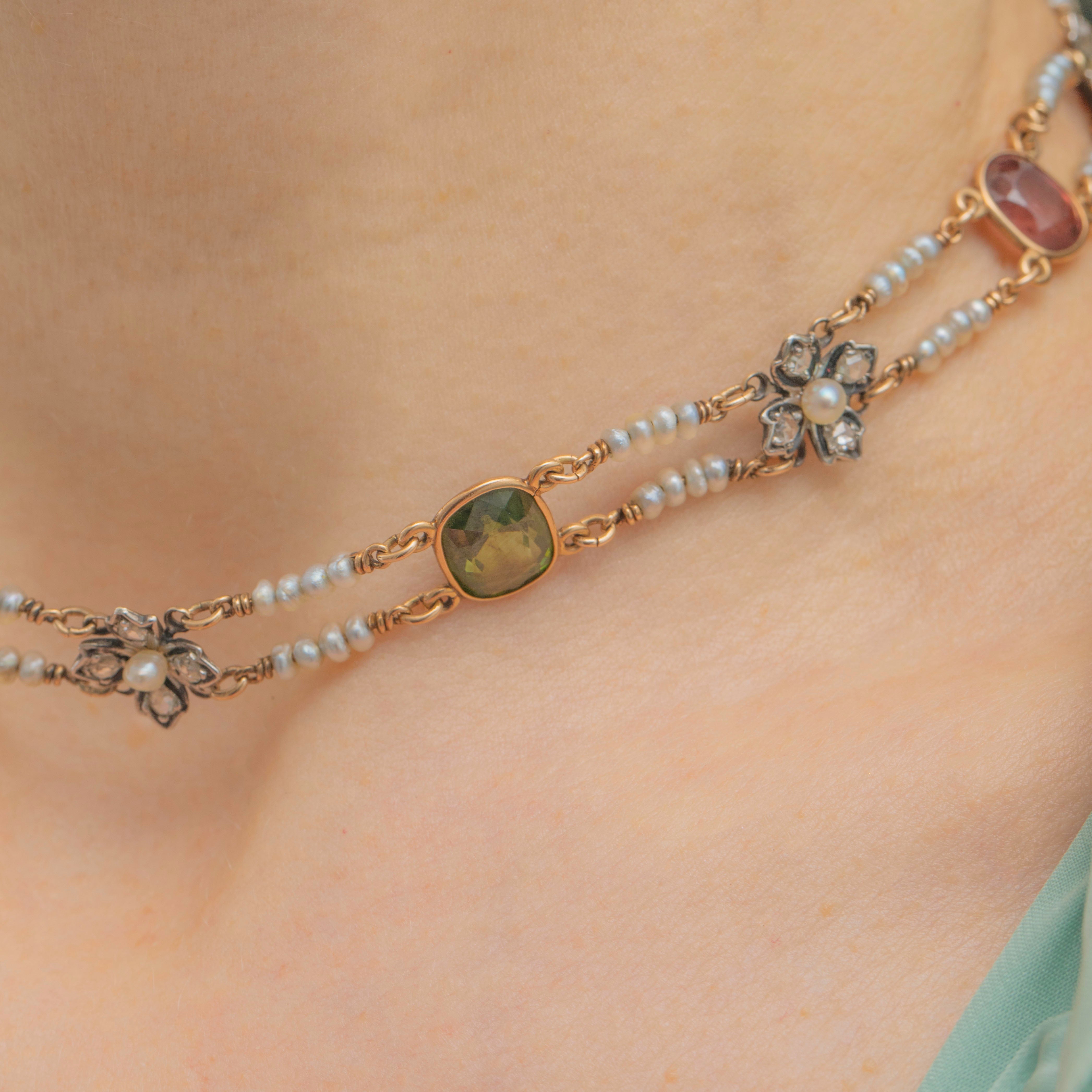 This antique Victorian Seed Pearl Harlequin multi-gemstone necklace features a cacophony of gems...from Tourmalines, Golden Topaz, multi-coloured natural Garnets and a perfect peach-coloured Imperial Topaz.
