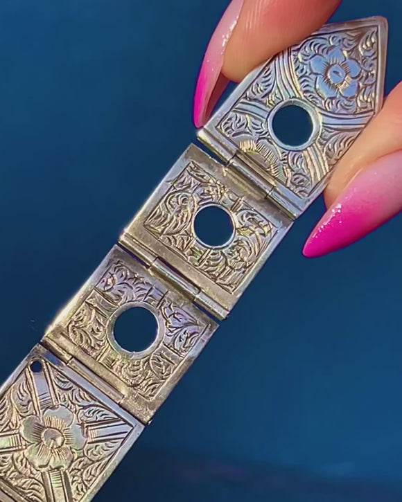 Ornate and beautifully detailed, this Victorian Sterling Silver buckle bracelet captures the romance of the era in richly hand-engraved foliate motifs. Its articulated panels flow around the wrist, culminating in a bold buckle-style centre that’s both decorative and functional—an enduring Victorian symbol of love and protection.
