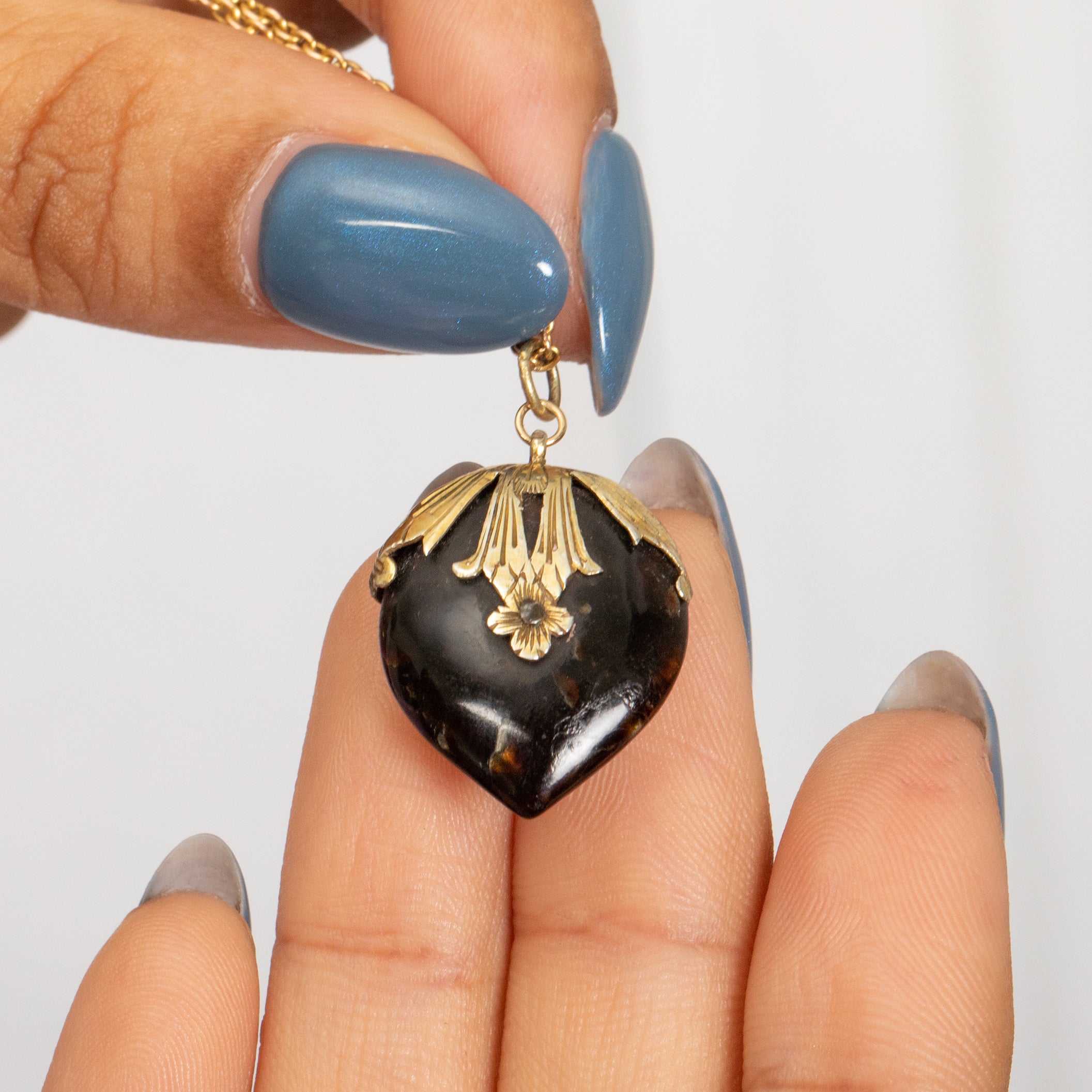 This Victorian Silver Gilt Piqué heart pendant is a striking piece! The dark chocolate tones of the skillfully hand-carved Piqué are beautifully complimented by 18ct Gold gilded floral details, creating a mesmerising pendant for your collection.