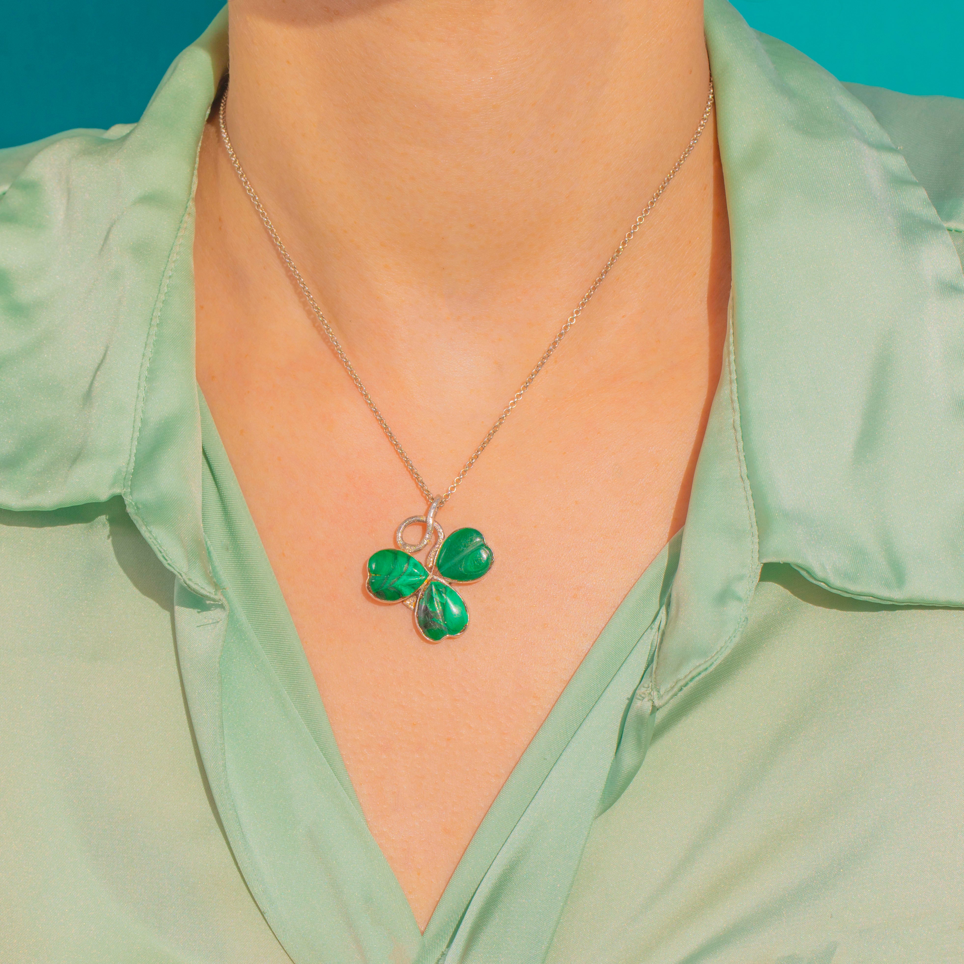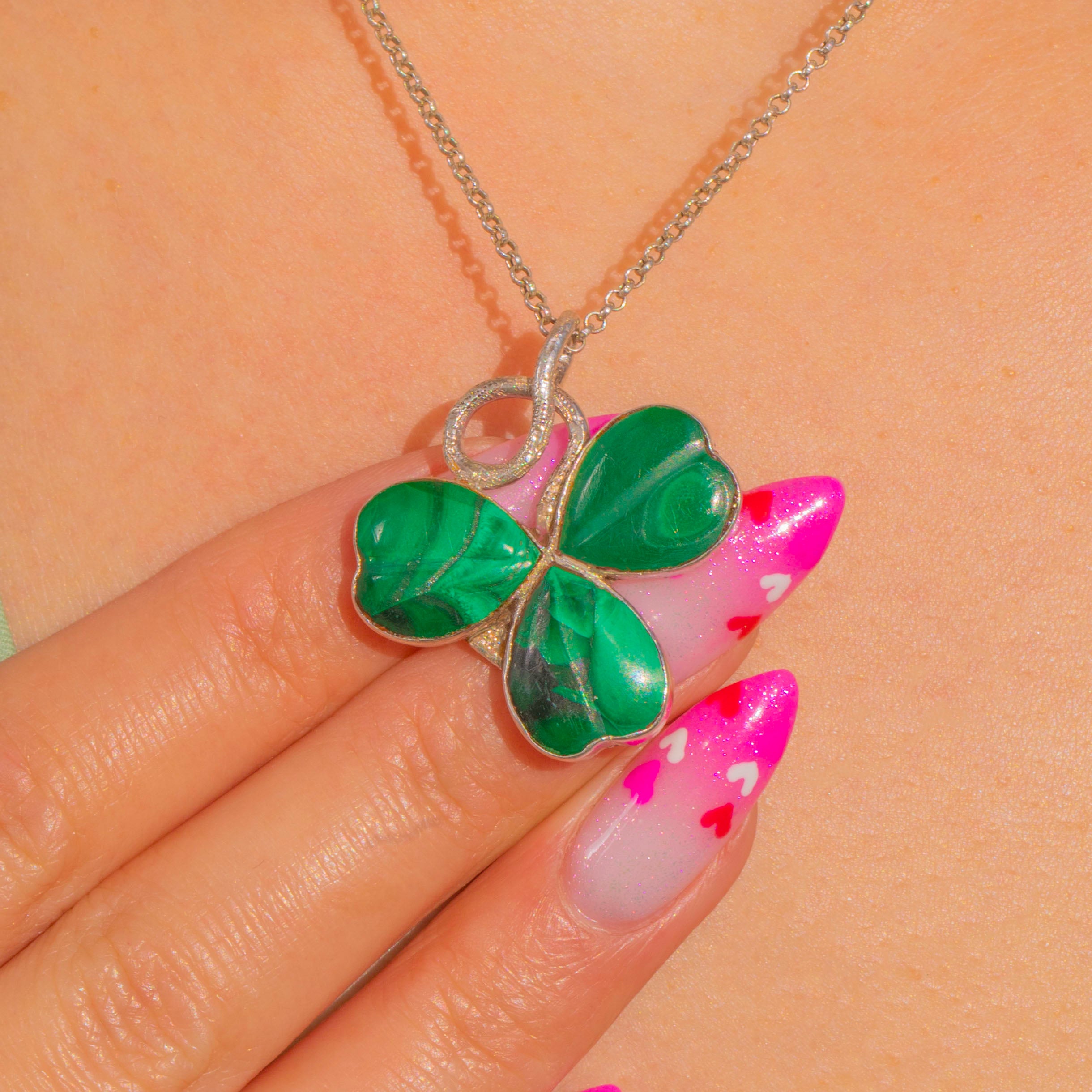 A charming Victorian clover pendant crafted in cool Sterling Silver and set with sumptuous green Malachite. Four heart-shaped cabochons form the classic lucky motif, each neatly bezel-set and meeting at the centre for a beautifully balanced silhouette.