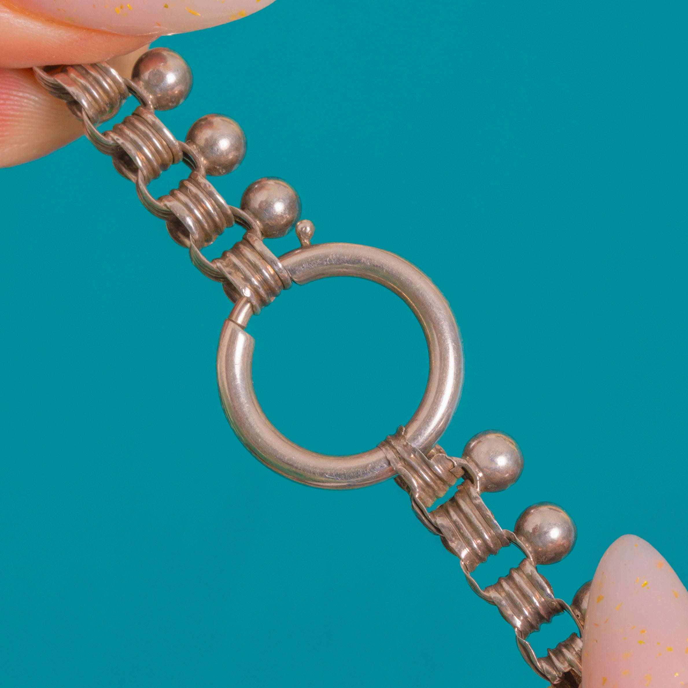 The large bolt-ring acts as both clasp and focal point—ideal for adding a cherished locket or pendant, and striking worn solo. The Silver surface shows a soft, even patina that highlights the detailing and underscores its 19th-century allure.