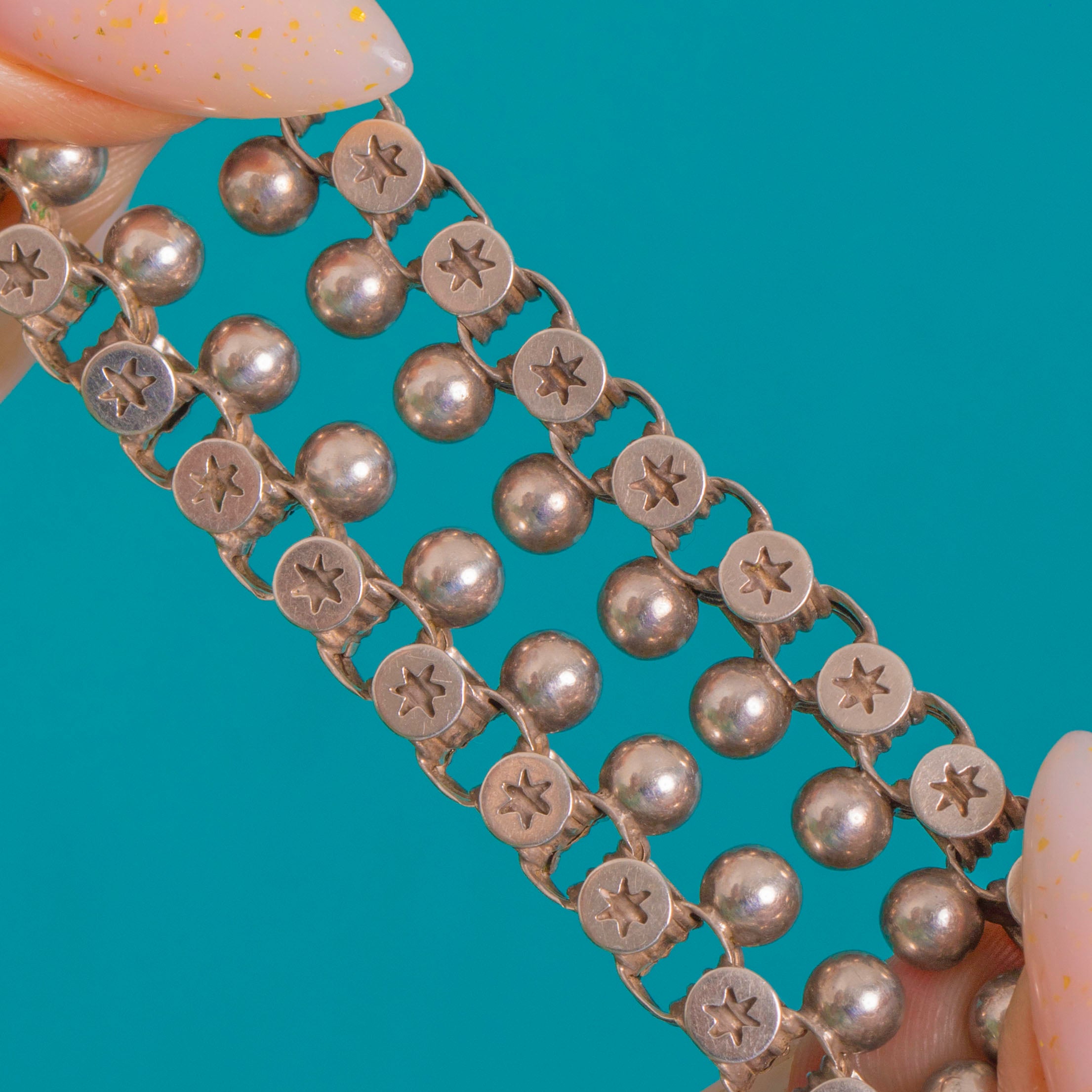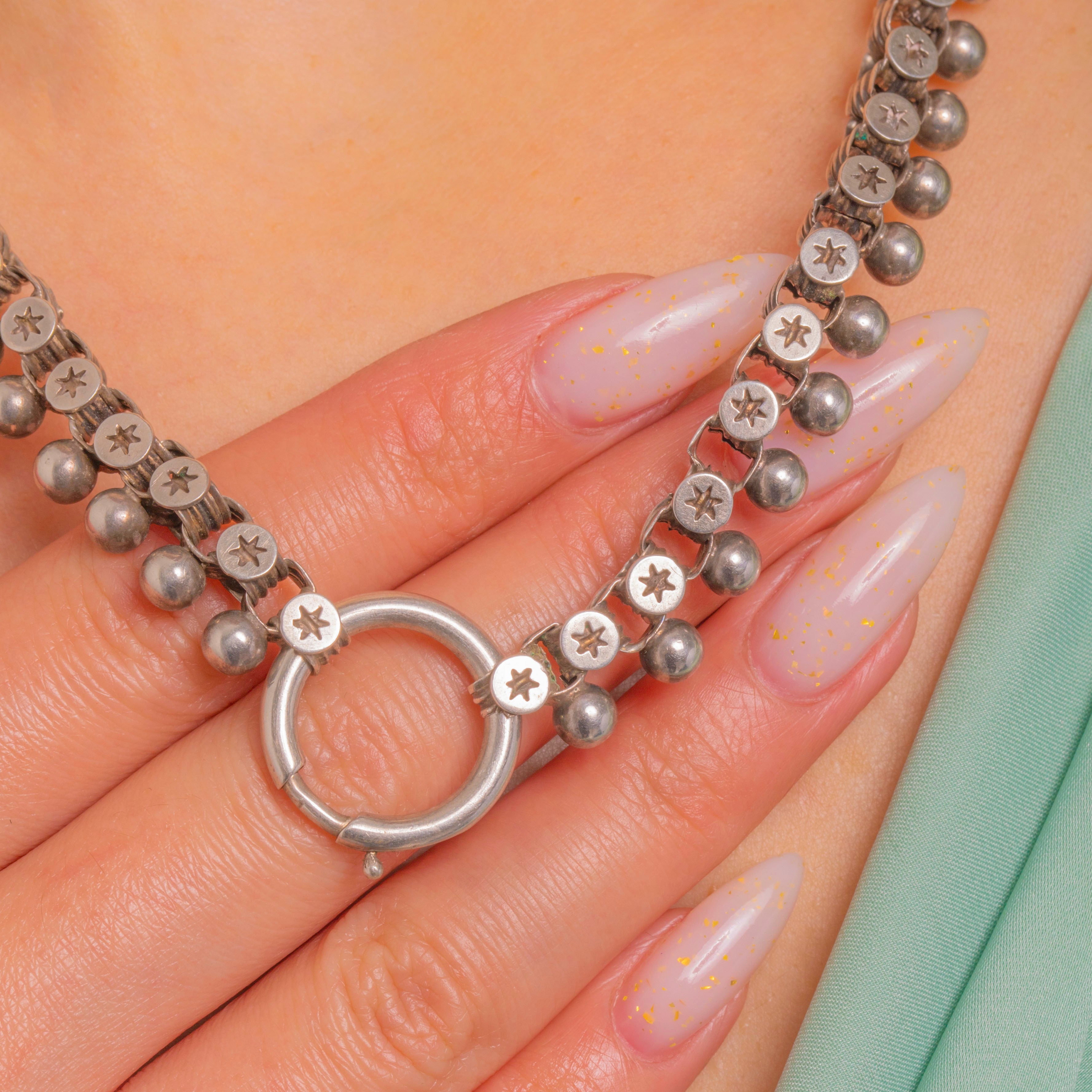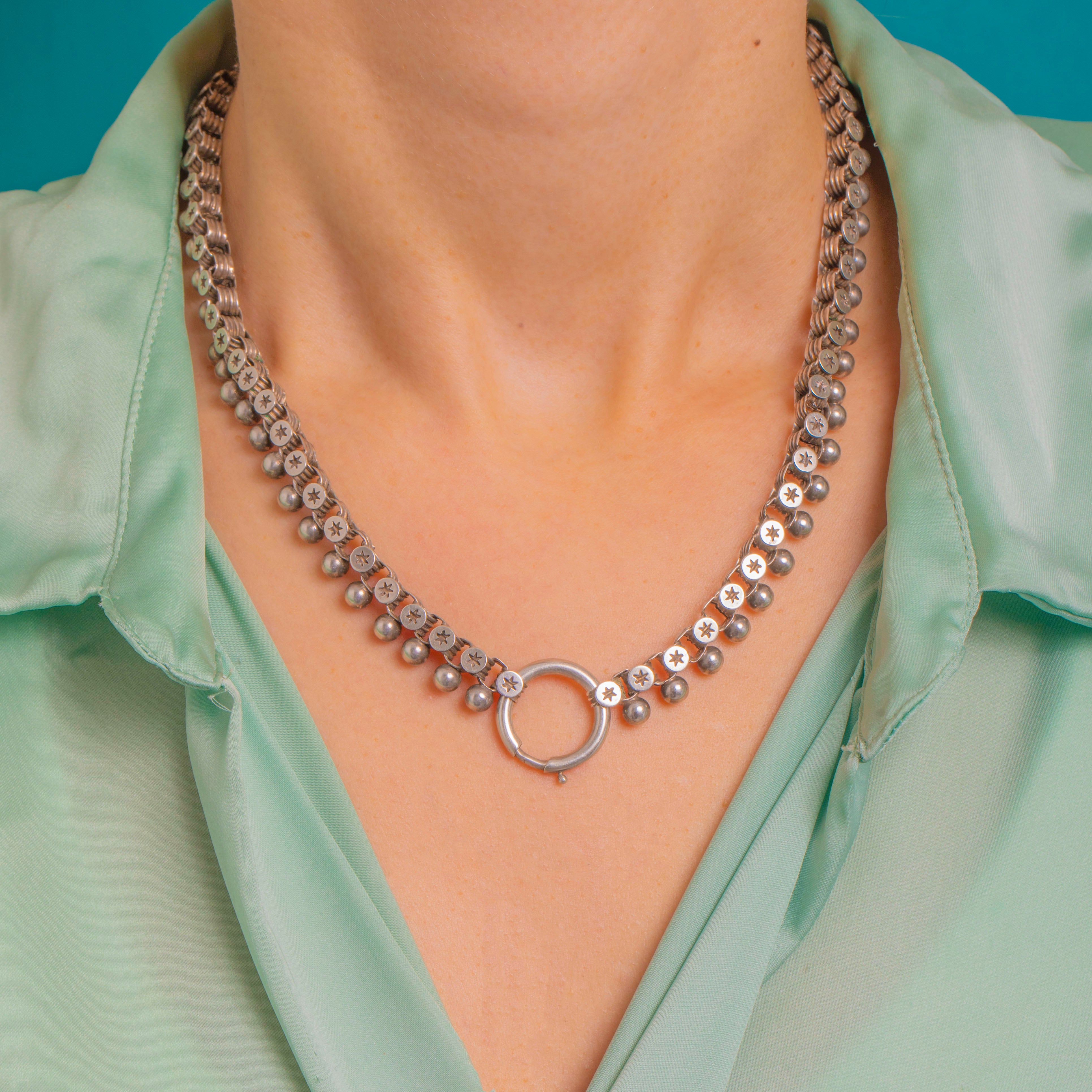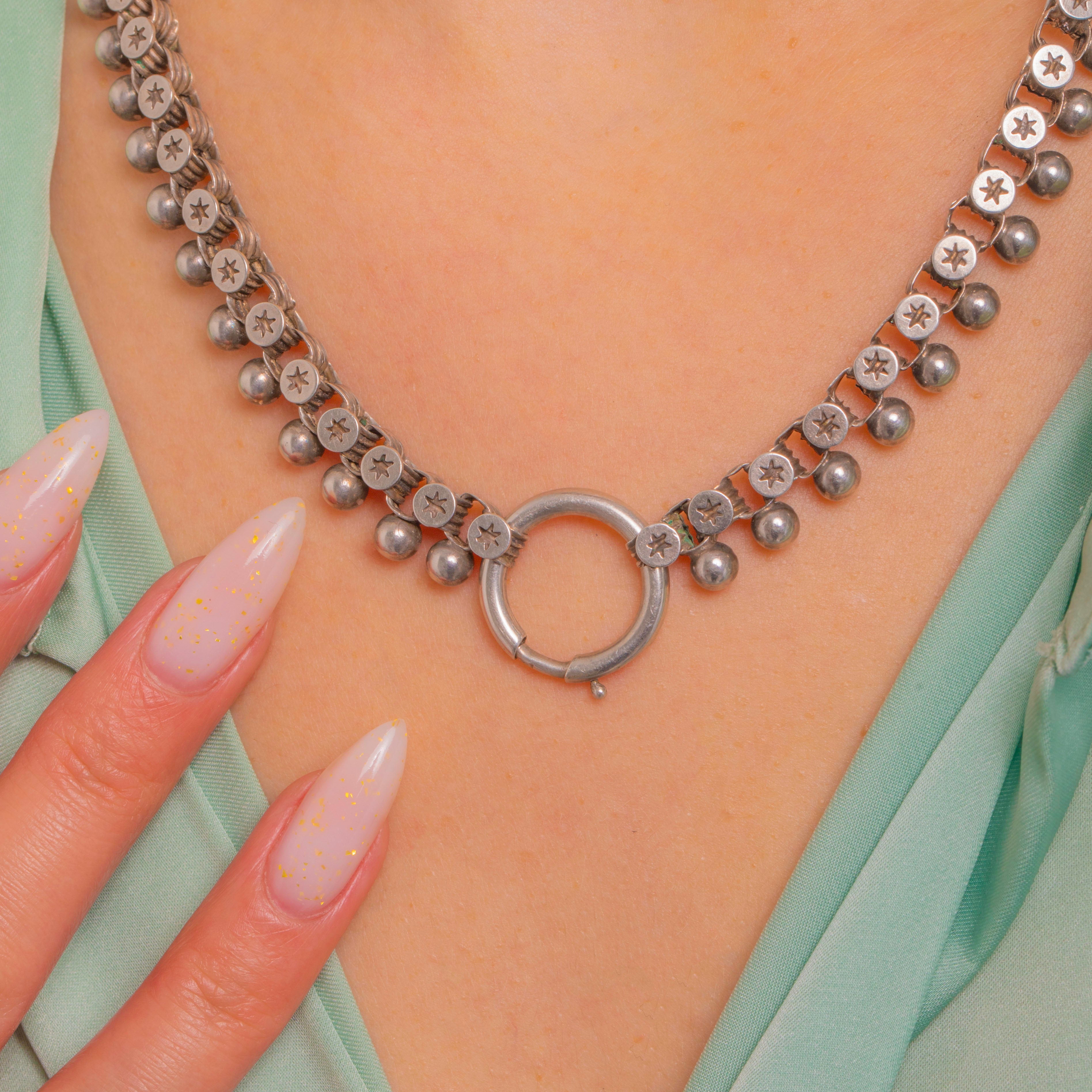 A bold Victorian book-chain collar with rhythmic presence, this necklace is composed of articulated links with pierced star motifs and finished with a continuous fringe of smooth beads. The broad, structured construction sits close to the neck, giving a refined yet statement silhouette with elegant movement.