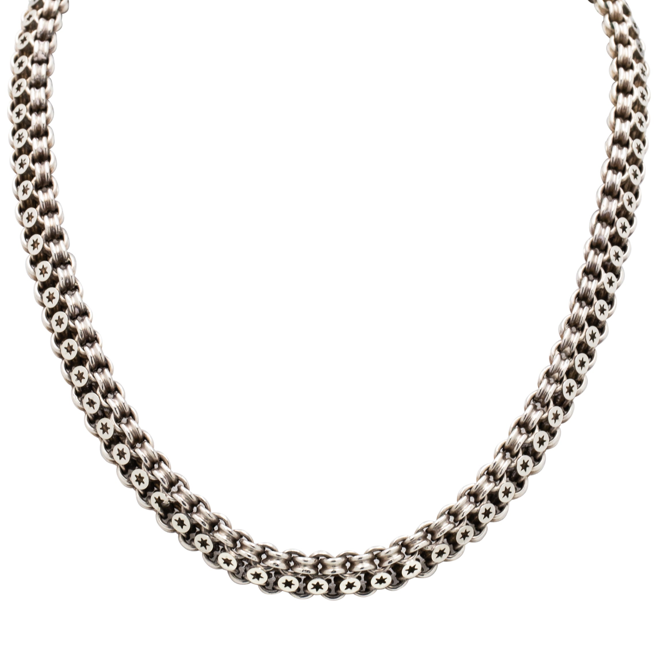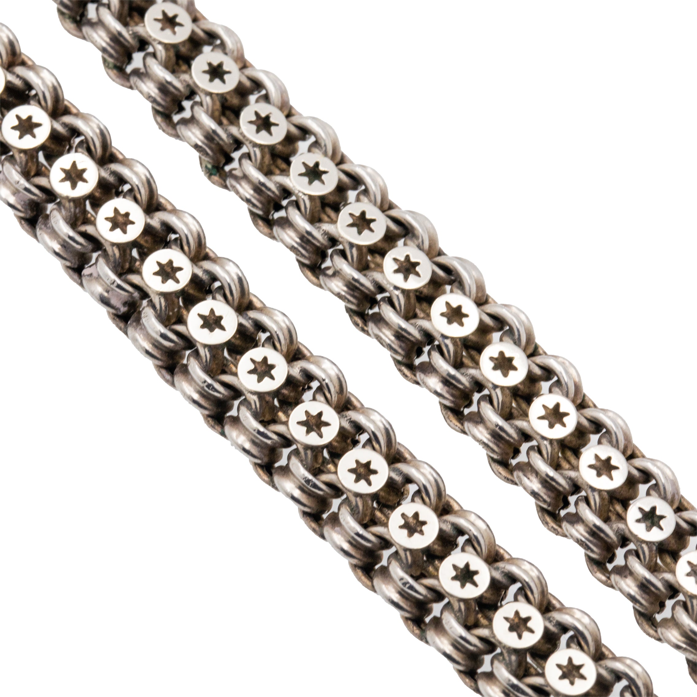 EXCELLENT. This Victorian Silver star book chain necklace is in perfect condition! The pierced star links are uniform and the epitome of Victorian glam with the bordering links also uniform and secure. Joined together they all have a lovely fluidity. The bolt-ring needs a little nudge to shut but still works well and it is the ideal feature piece sitting at the front. With a soft patina within the details, this antique Silver chain is bursting with antique charm.