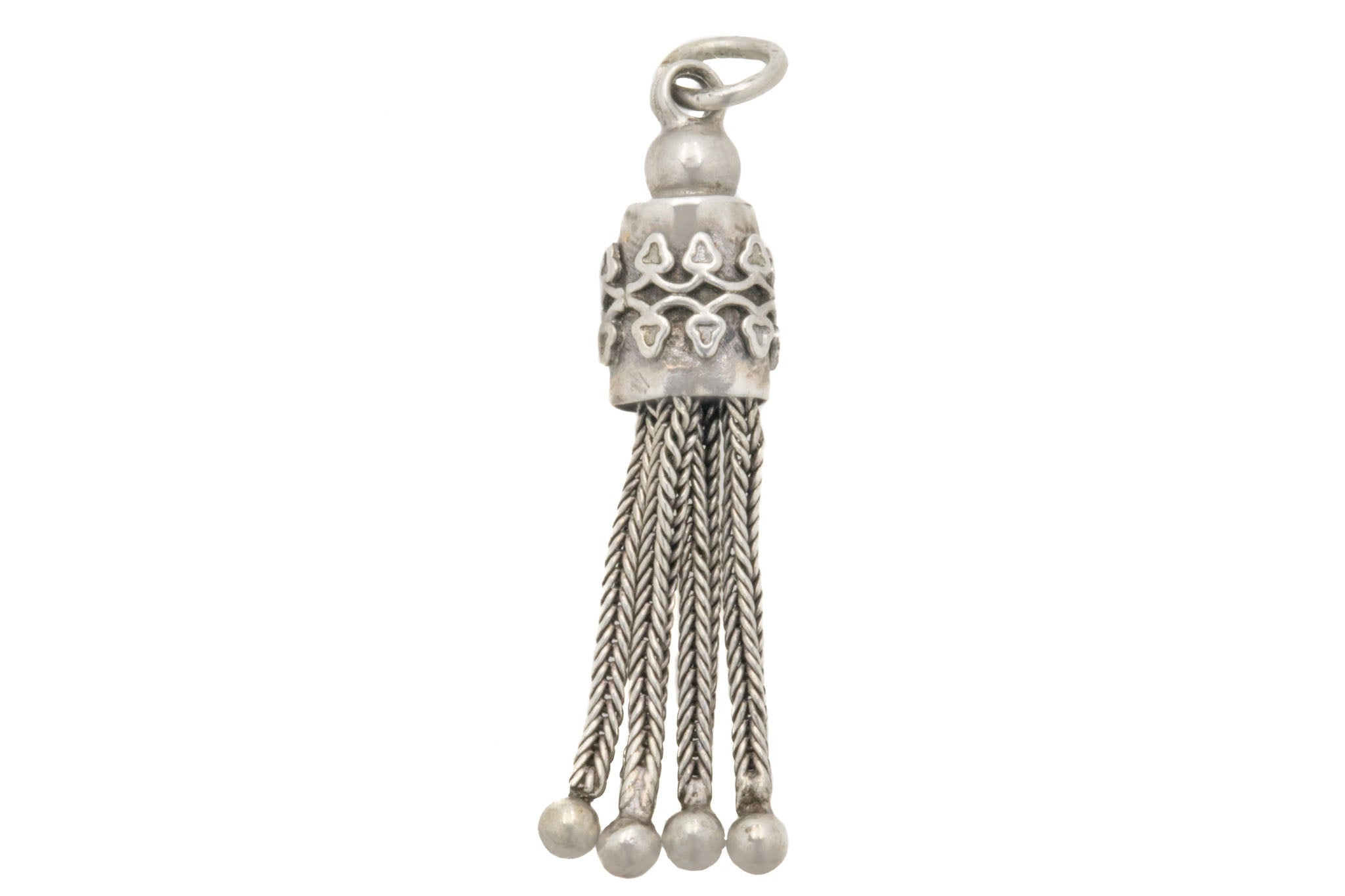 VERY GOOD. This Victorian Silver tassel pendant is in very good condition! Each tassel is firmly affixed to her dome and the wire has remained tightly woven. There is a ding to one of the balls at the end but due to her continual movement, it is barely noticeable! The ornate detailing is securely soldered onto her dome and has a moody patina around all of her grooves. Complete with a jump ring you can wear this antique tassel pendant with the utmost confidence!