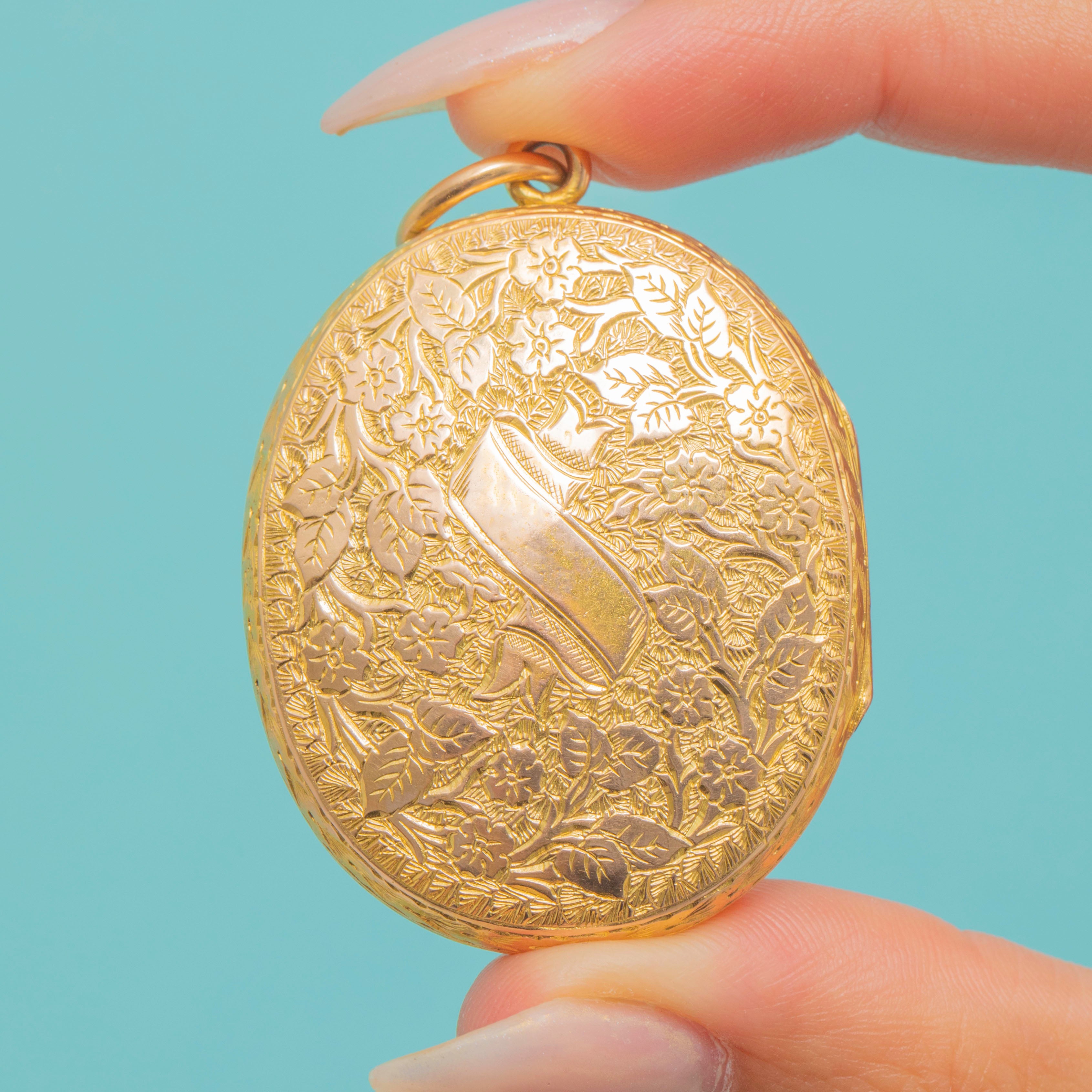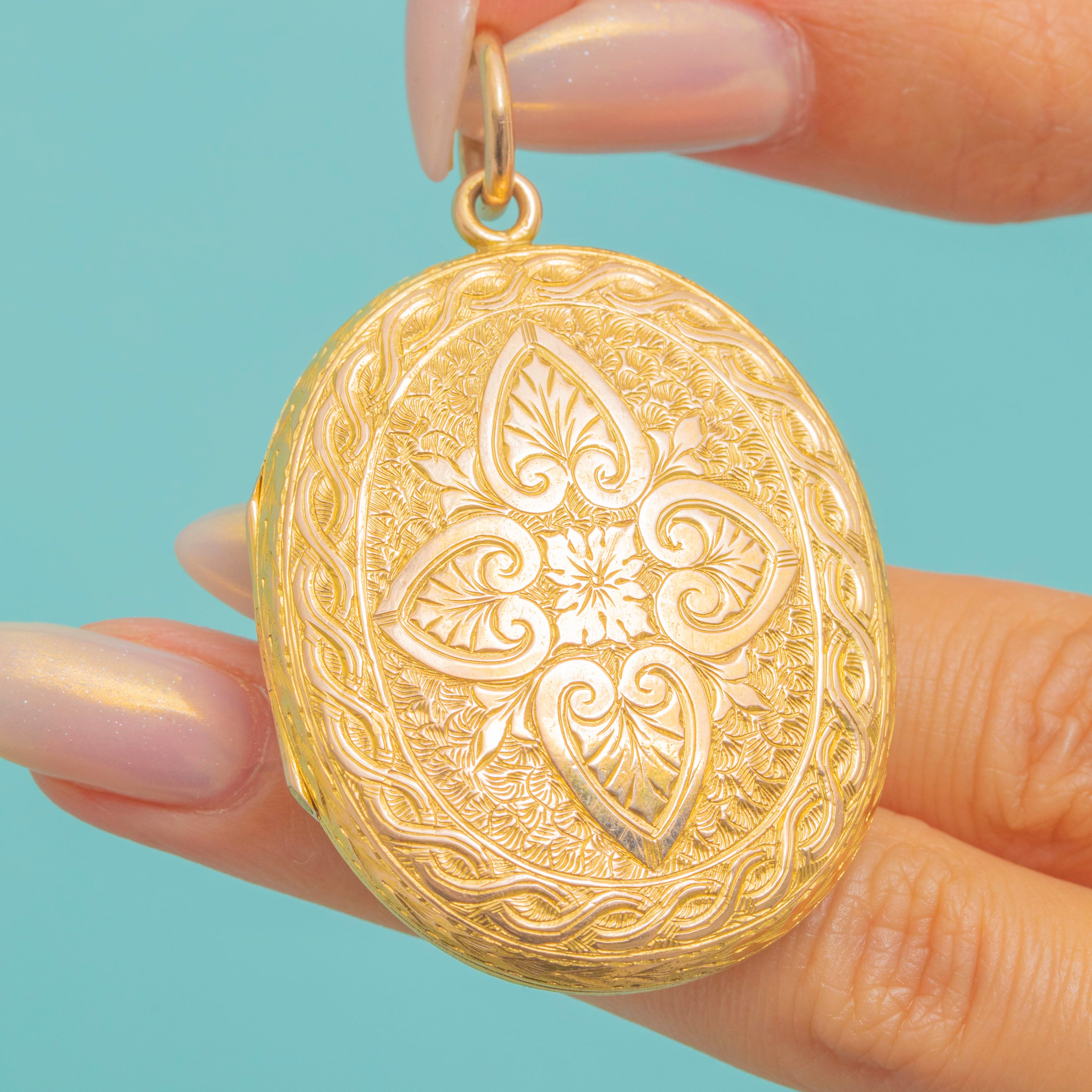 This is a large, solid 15ct Gold Victorian oval locket with richly detailed engraving. The front is worked with foliate scrolls arranged around a central flowerhead, framed by a plaited border. The reverse is densely engraved with flowers and leaves around a shaped cartouche.
