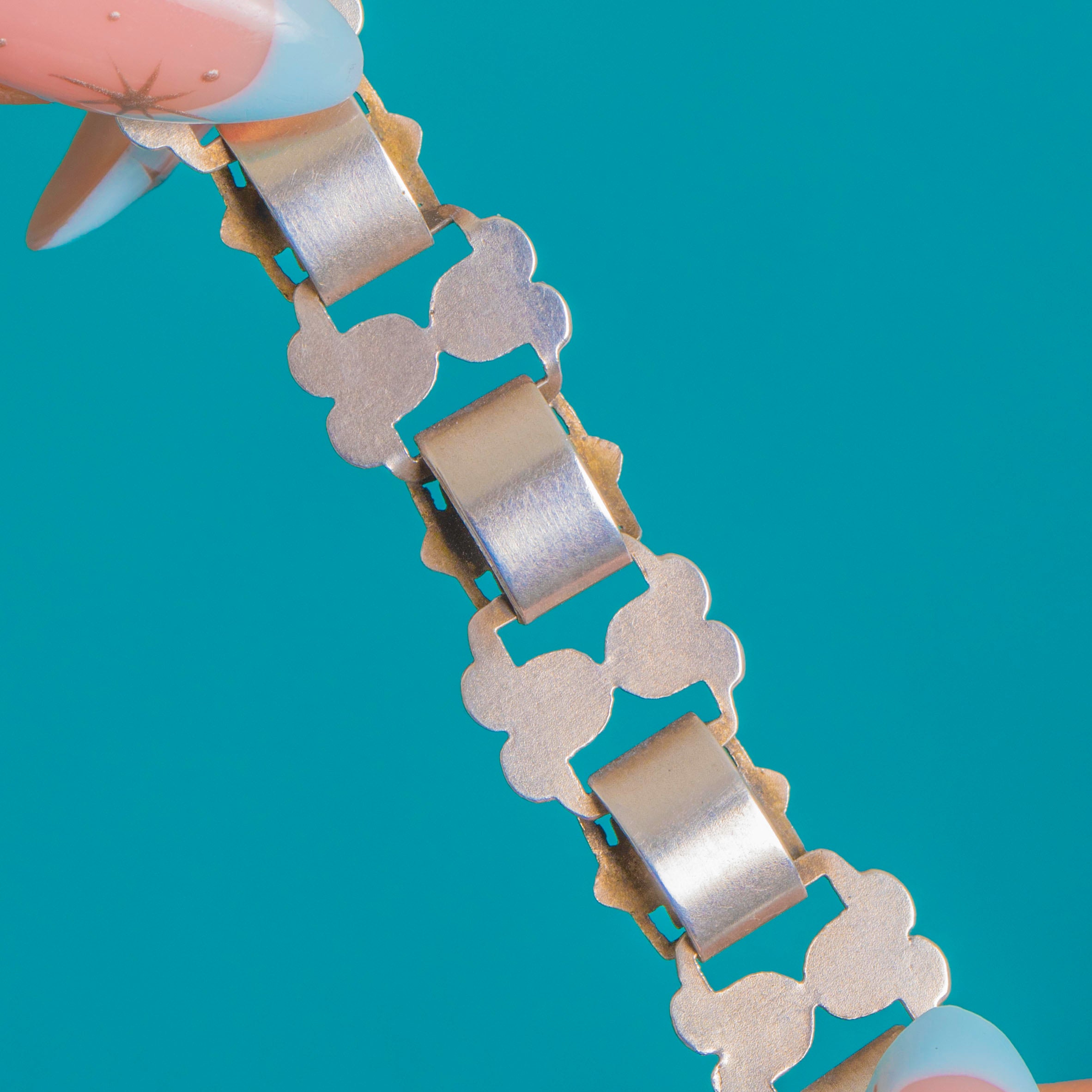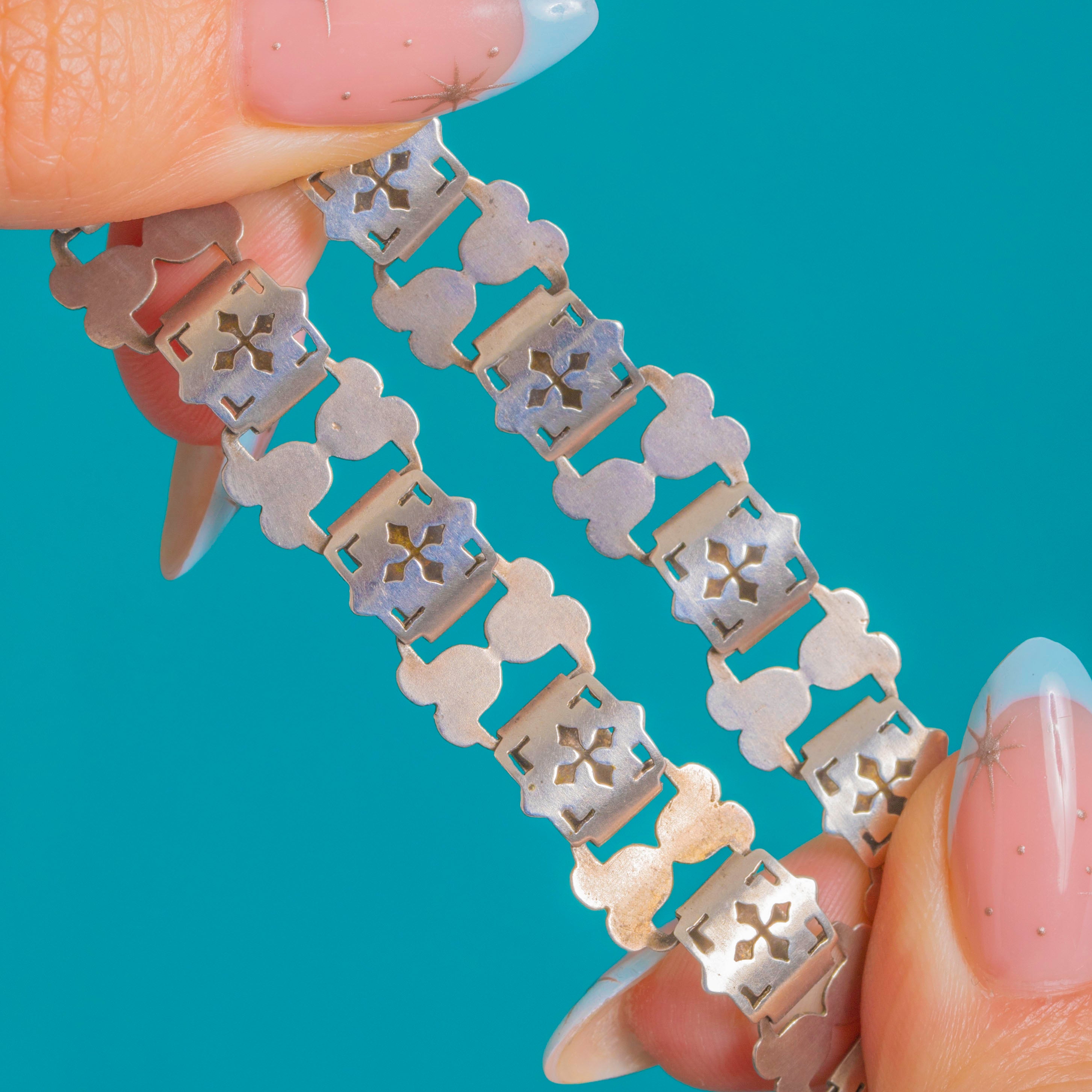EXCELLENT: The Silver shows only light surface wear and a gentle patina commensurate with age, with the pierced motifs remaining crisp and well-defined. The articulated links are secure and the oversized bolt-ring clasp operates smoothly. No visible repairs or alterations.