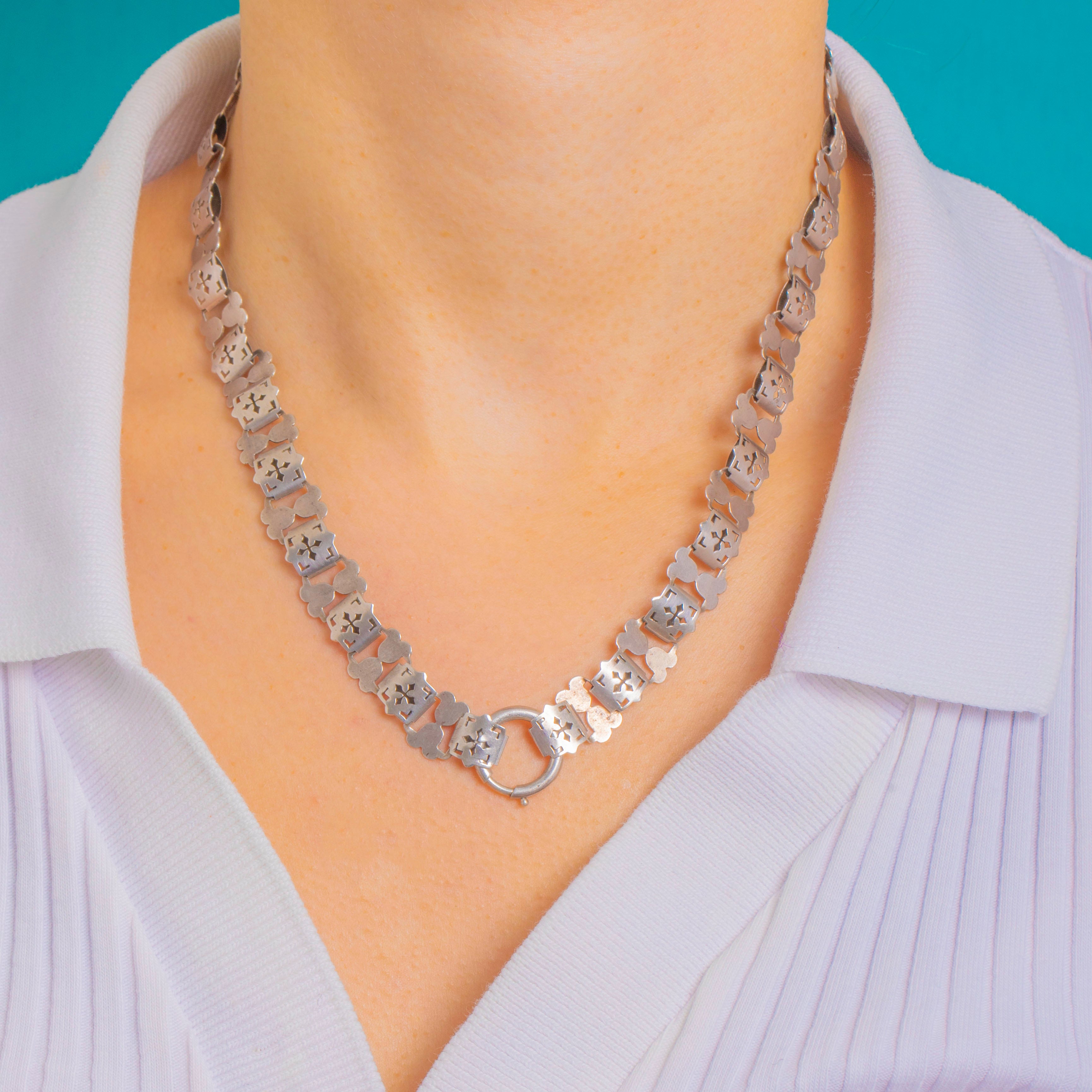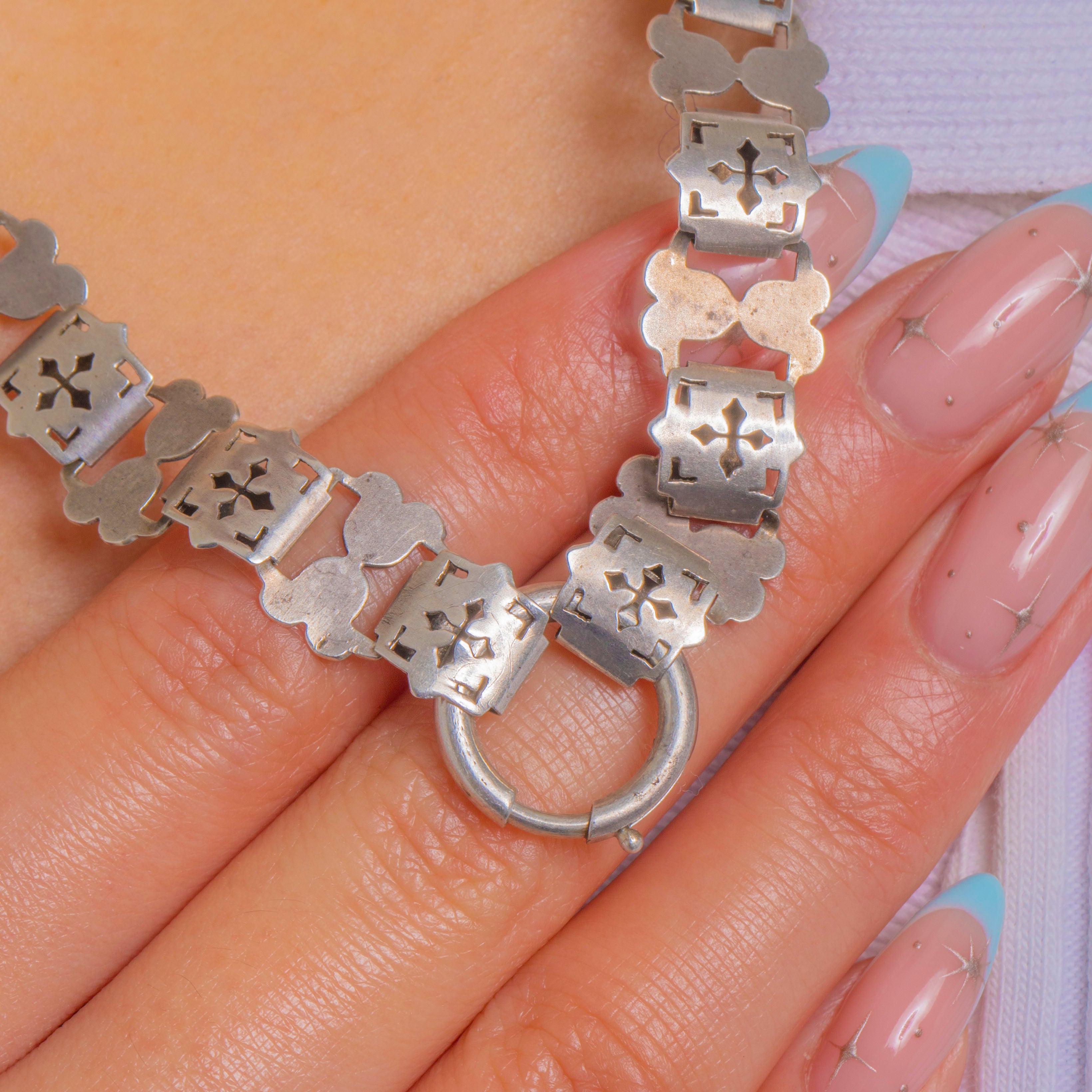 Sculptural and elegant, this Victorian pierced book chain in Sterling Silver is composed of alternating rectangular plaques and petite quatrefoil links. Each plaque is crisply pierced with Gothic-inspired tracery, giving the necklace a striking, graphic rhythm with beautiful negative space and a refined patina.