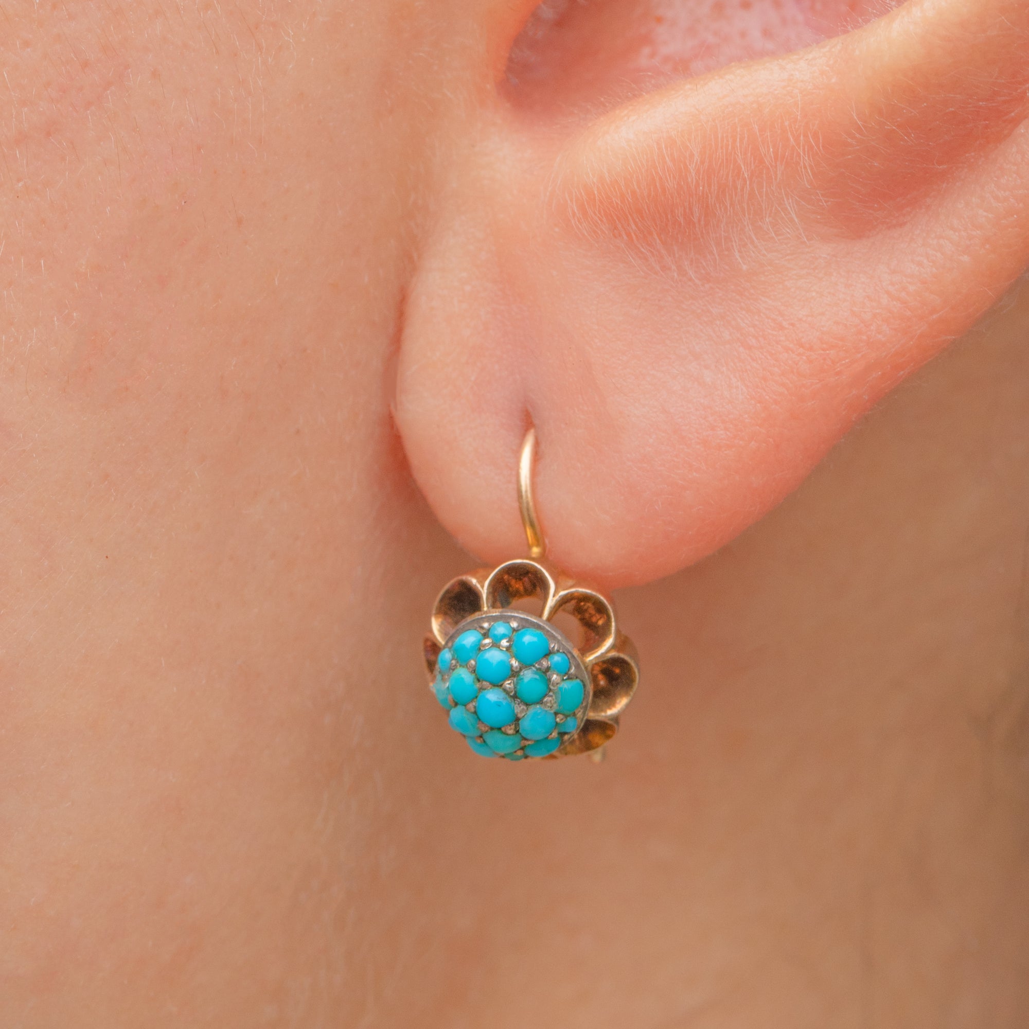 EXCELLENT: The earrings are in superb condition, with all turquoise stones present and undamaged. Gold settings remain bright and well-preserved, showcasing the quality of Victorian craftsmanship.