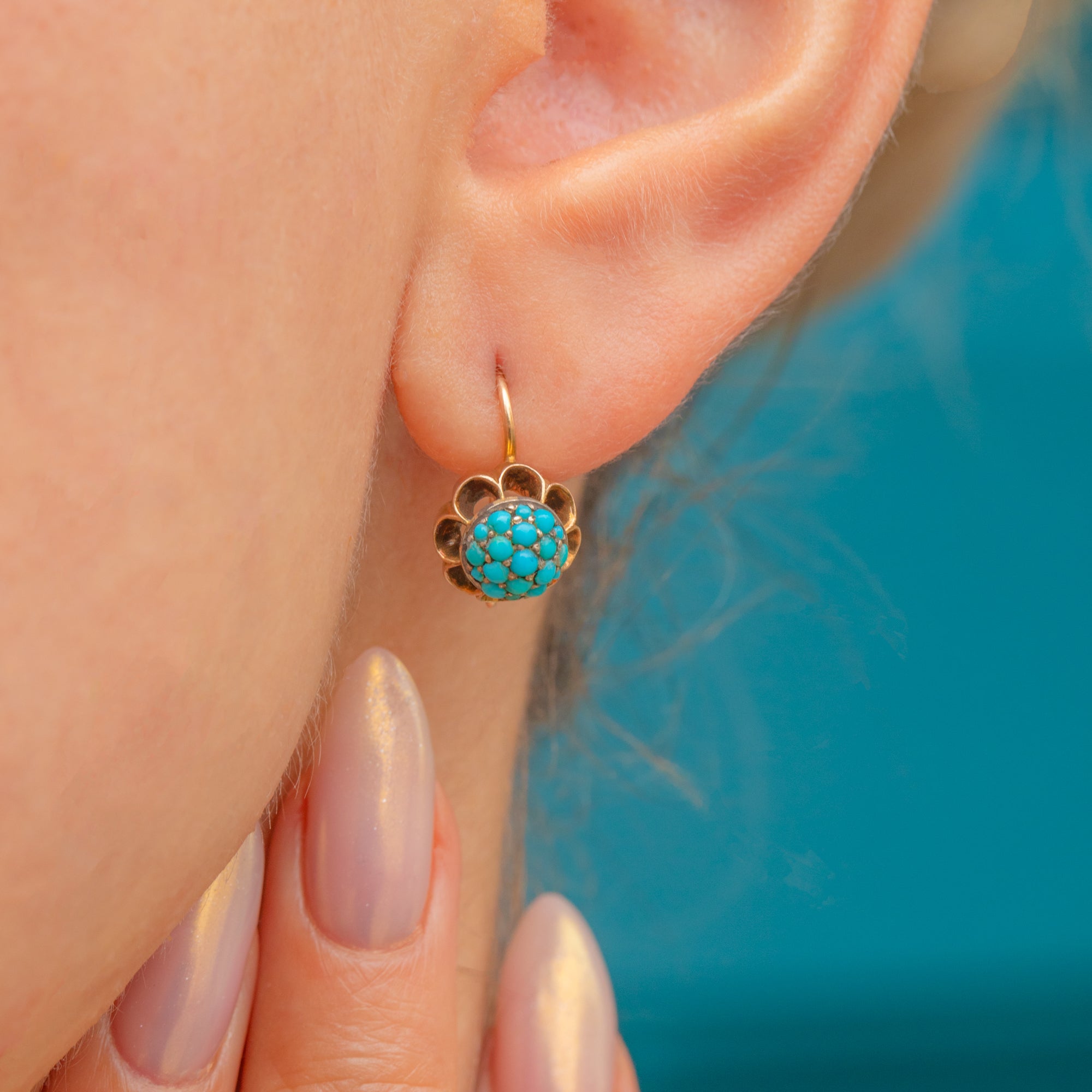 These antique Turquoise bombe earrings are crafted in rich 18ct Gold, featuring delicately graduated Turquoise stones.