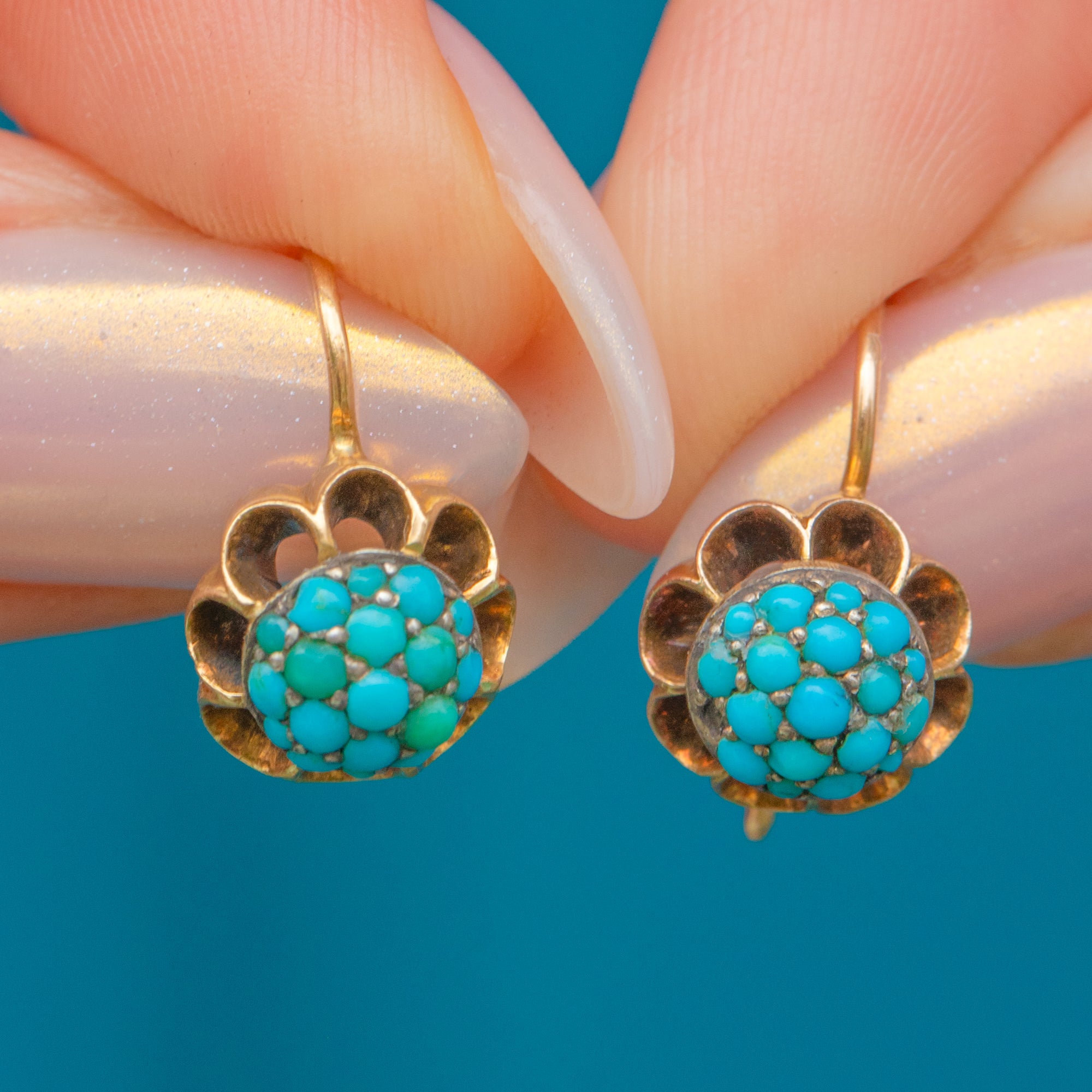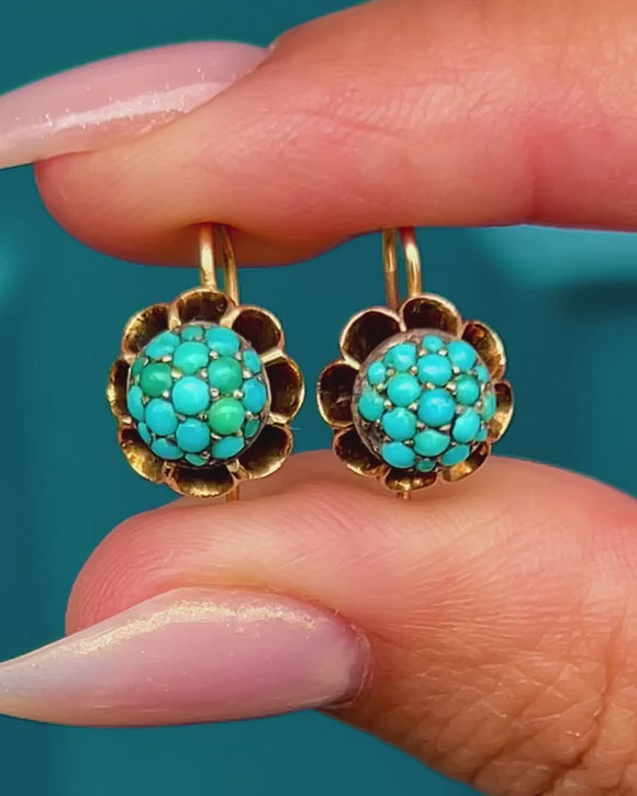 Victorian Turquoise 18ct Gold Cluster Bombe Earrings