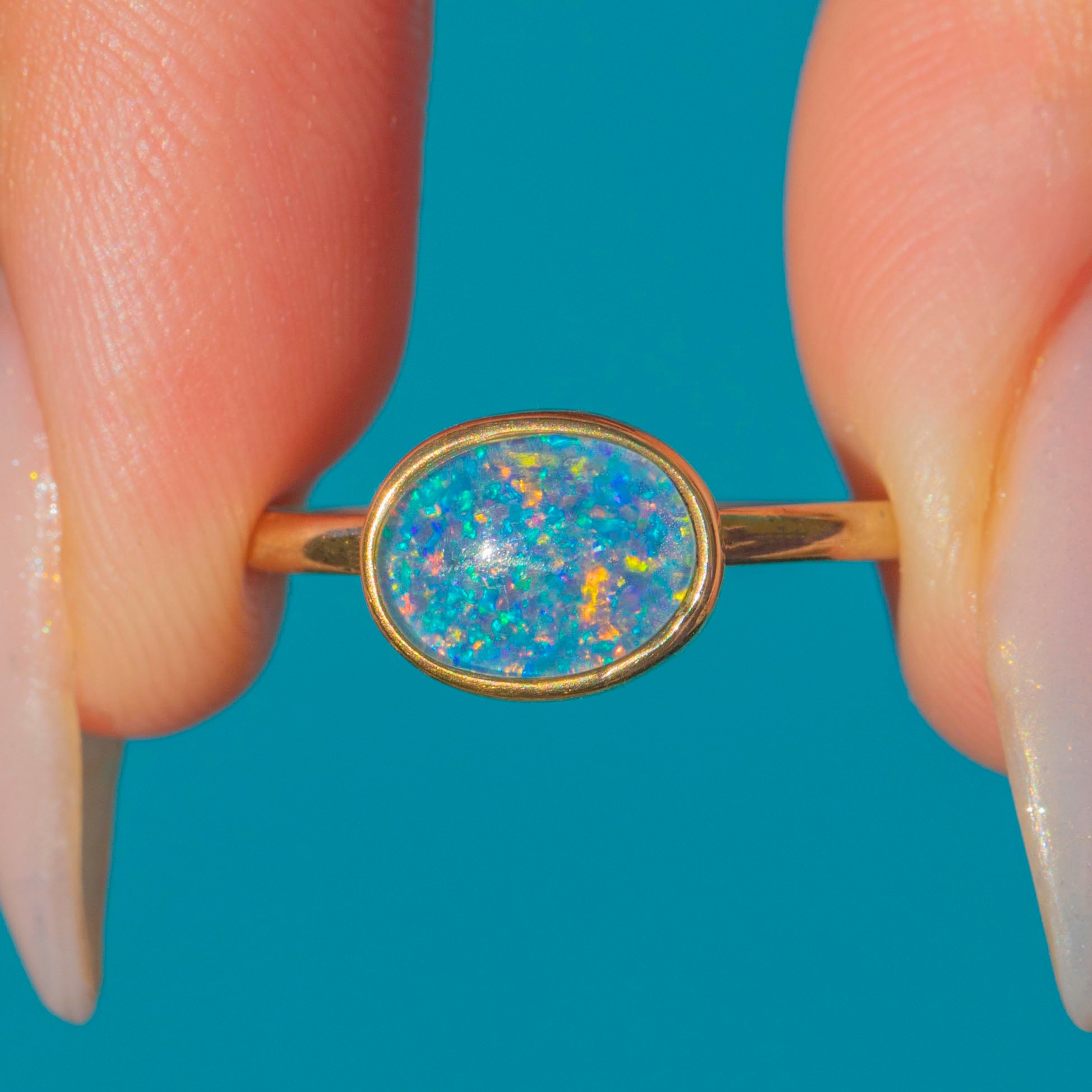 The Opal doublet displays exceptional play-of-colour, with vibrant pinfire flashes that dance in shades of neon green, lilac, orange and yellow. The shifting confetti-like colours give the piece a lively and joyful feel, making it a versatile jewel for everyday wear or special occasions.