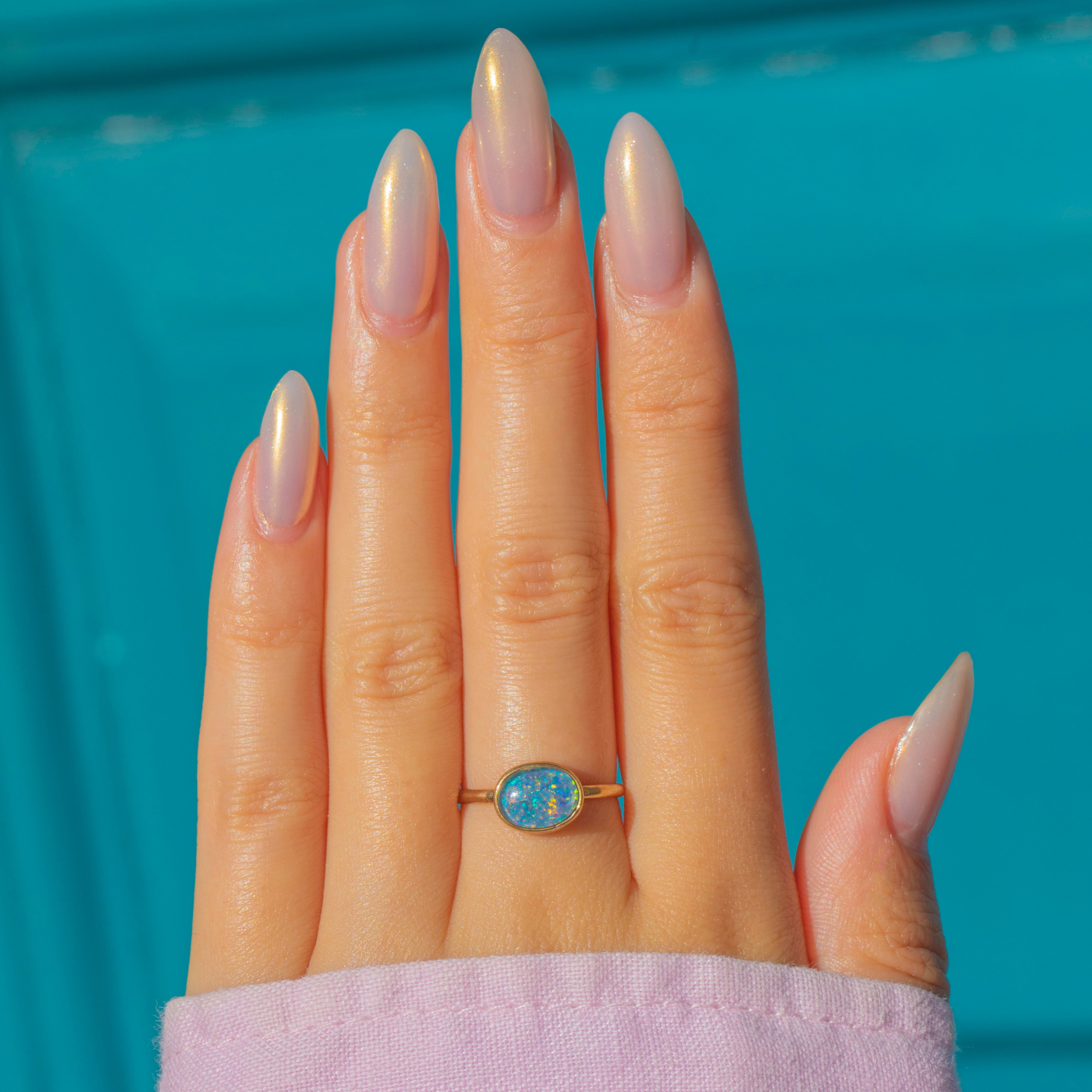 This Vintage Opal doublet ring is crafted in 14ct Yellow Gold and designed in a striking east–west orientation. The simple bezel setting enhances the sleek silhouette, allowing the gemstone to take centre stage. Its minimal yet elegant form makes it easy to stack alongside other rings, while still offering plenty of presence when worn alone.