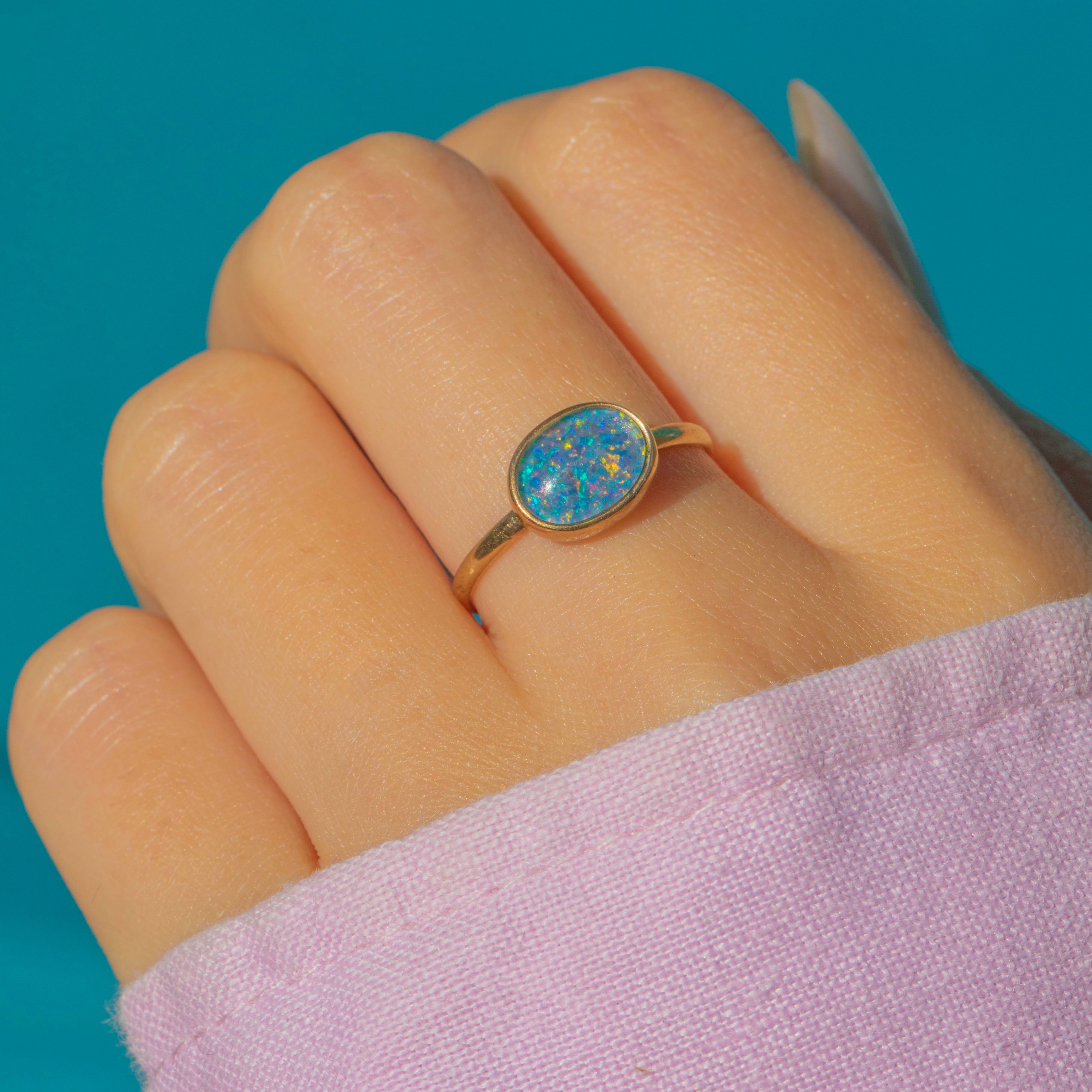 EXCELLENT: The Opal doublet is in superb condition, with vibrant play-of-colour and no chips or abrasions. The Gold is smooth and glossy, and the setting is secure. The ring has been very well cared for and shows only light wear consistent with age.