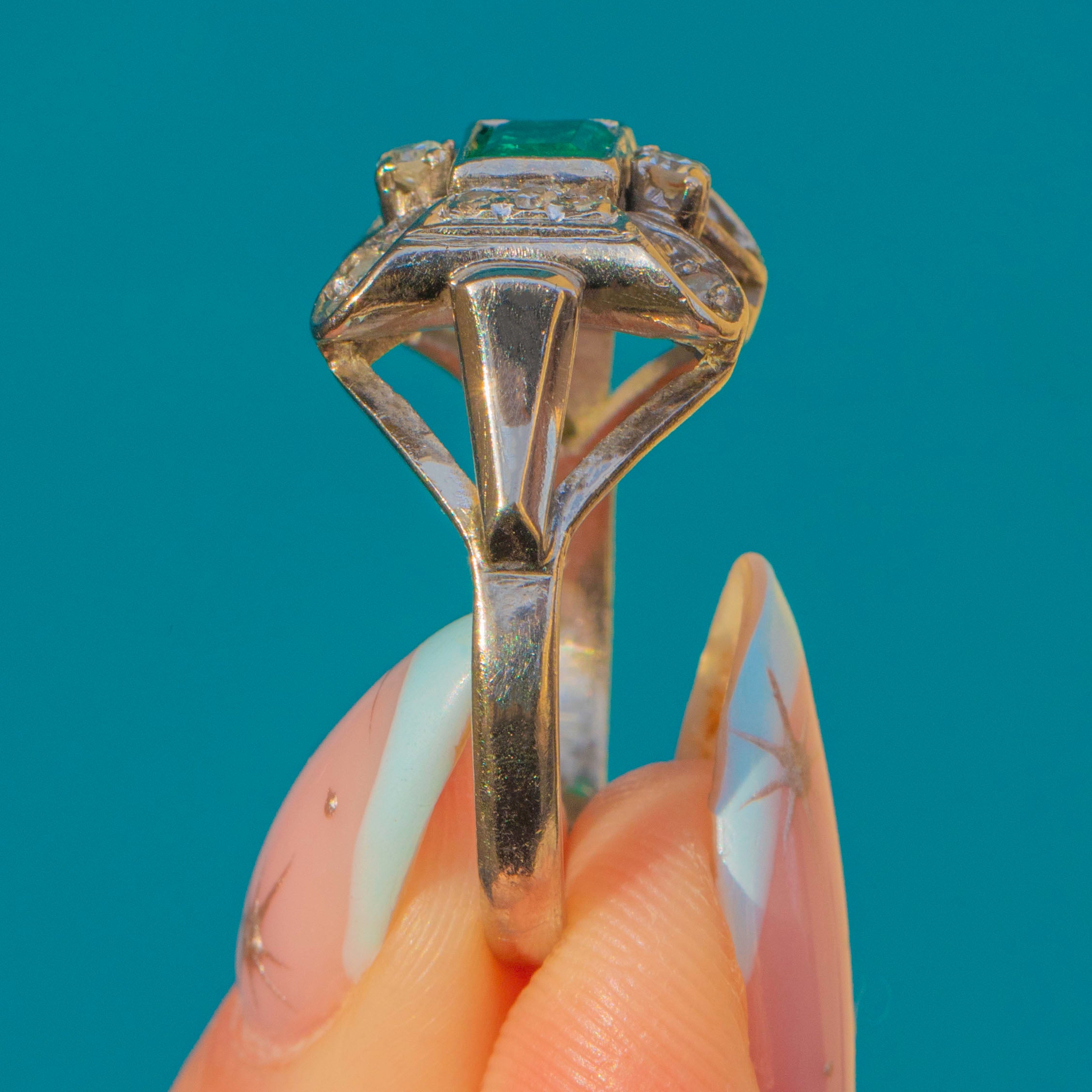 VERY GOOD: The Emerald shows natural inclusions, and the Diamonds are securely set with light wear commensurate with age. The band shows evidence of previous resizing with some minor discolouration, not visible during wear. Overall light surface wear to the metal consistent with careful vintage use.