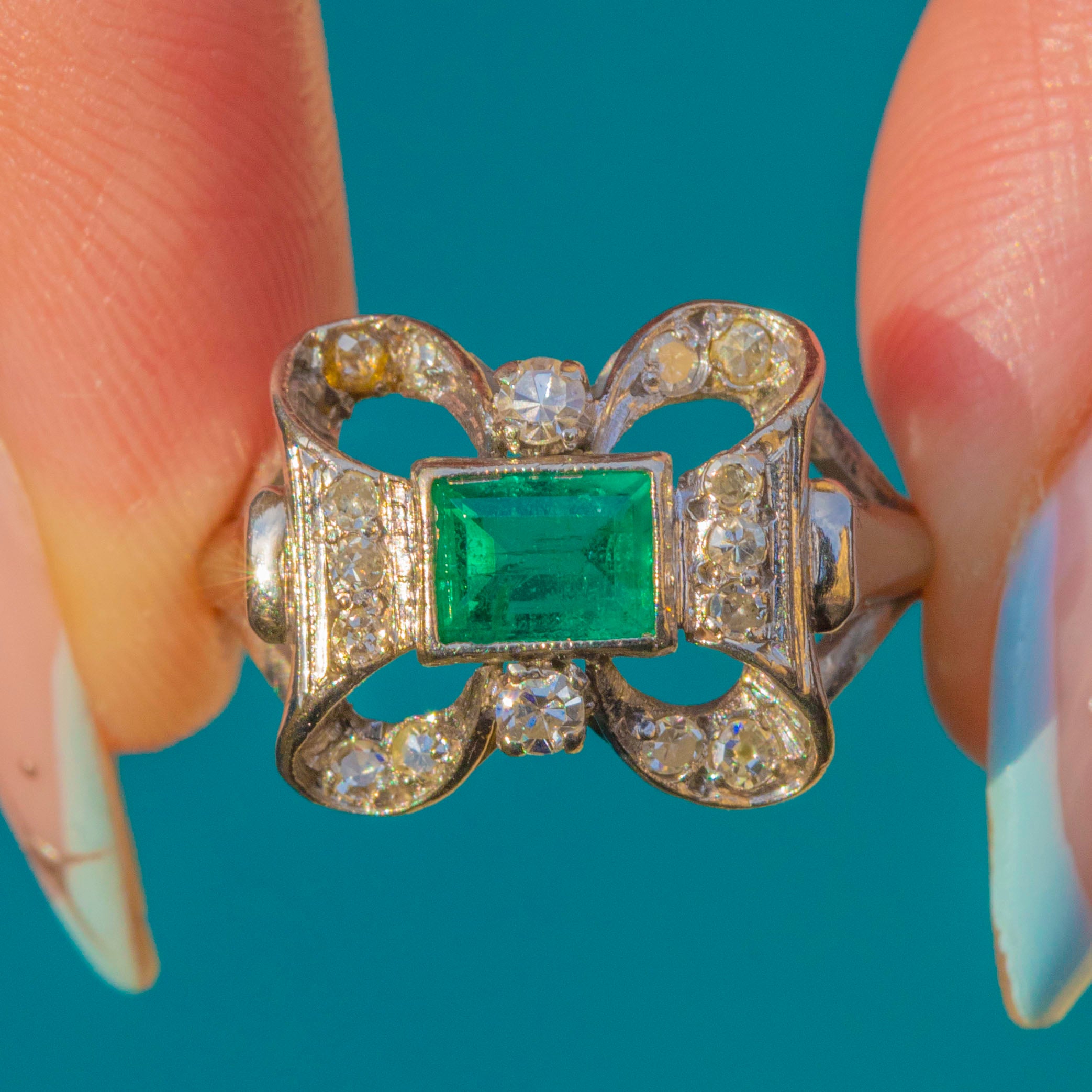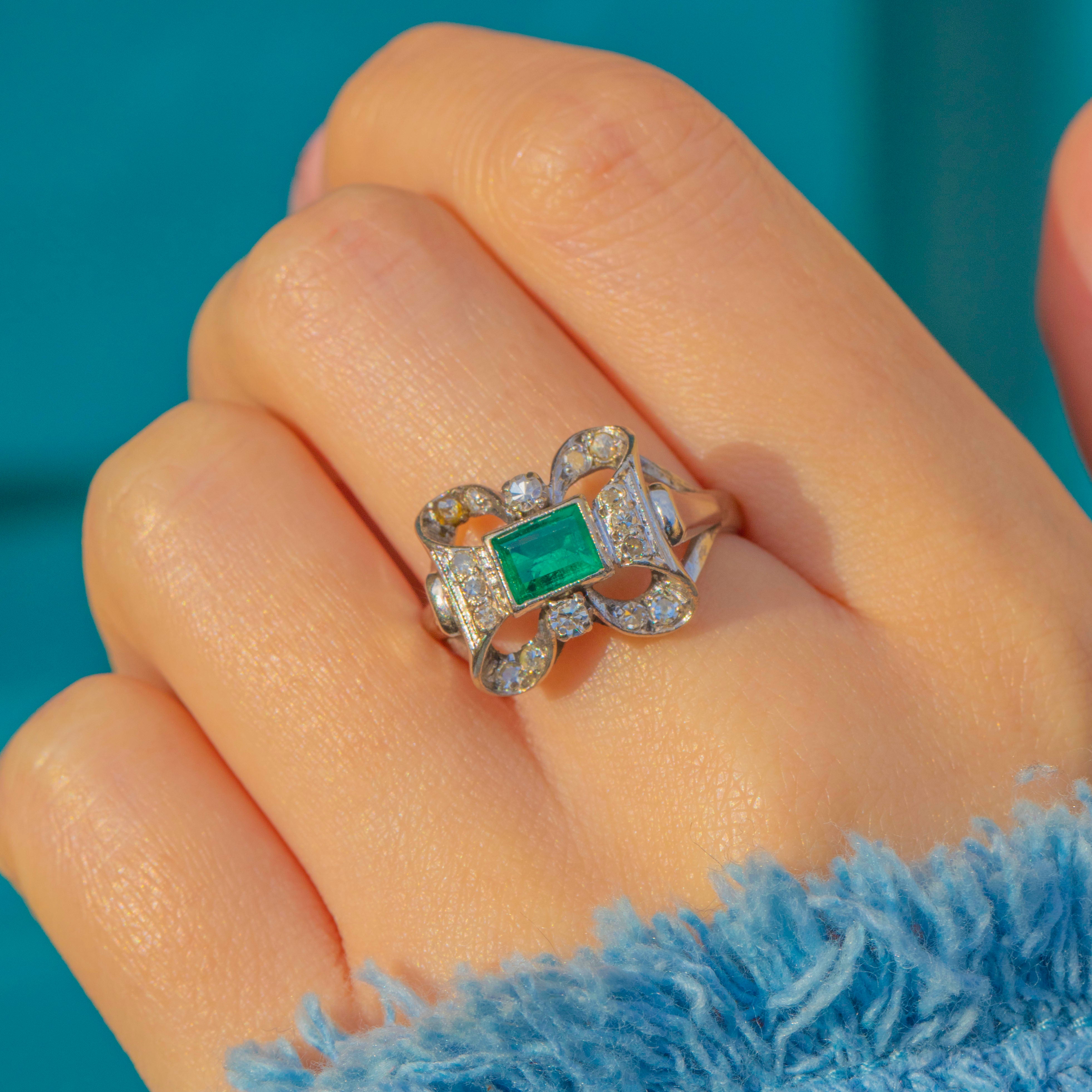 A glamorous mid-century cocktail ring, crafted in 18ct White Gold with a bold architectural bow silhouette. At its heart sits a rectangular step-cut Emerald in a fine milgrained bezel, its vibrant green beautifully framed by pavé-set Diamonds that form an elegant bow-inspired openwork panel.