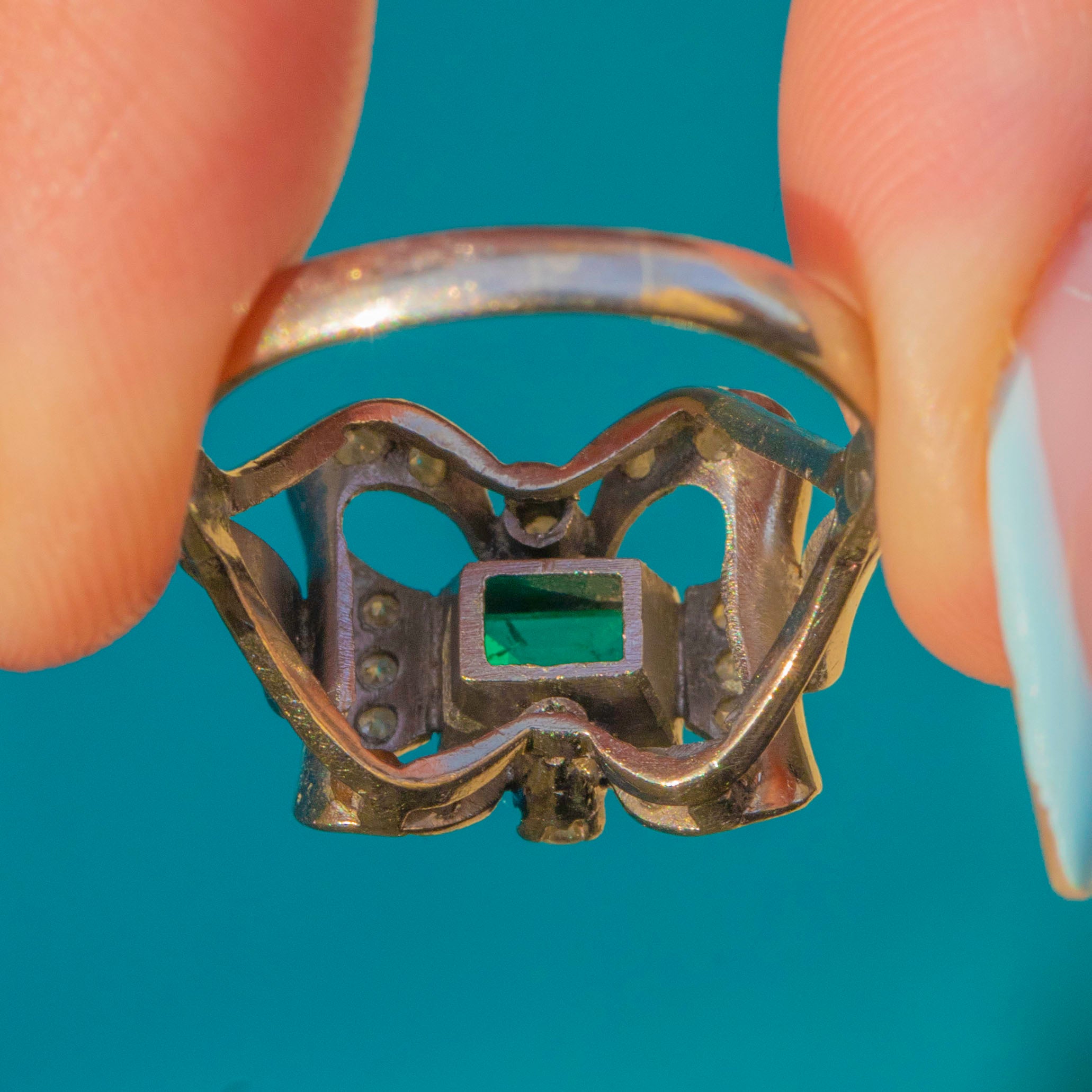 Vintage 18ct White Gold Emerald Diamond Bow Cocktail Ring