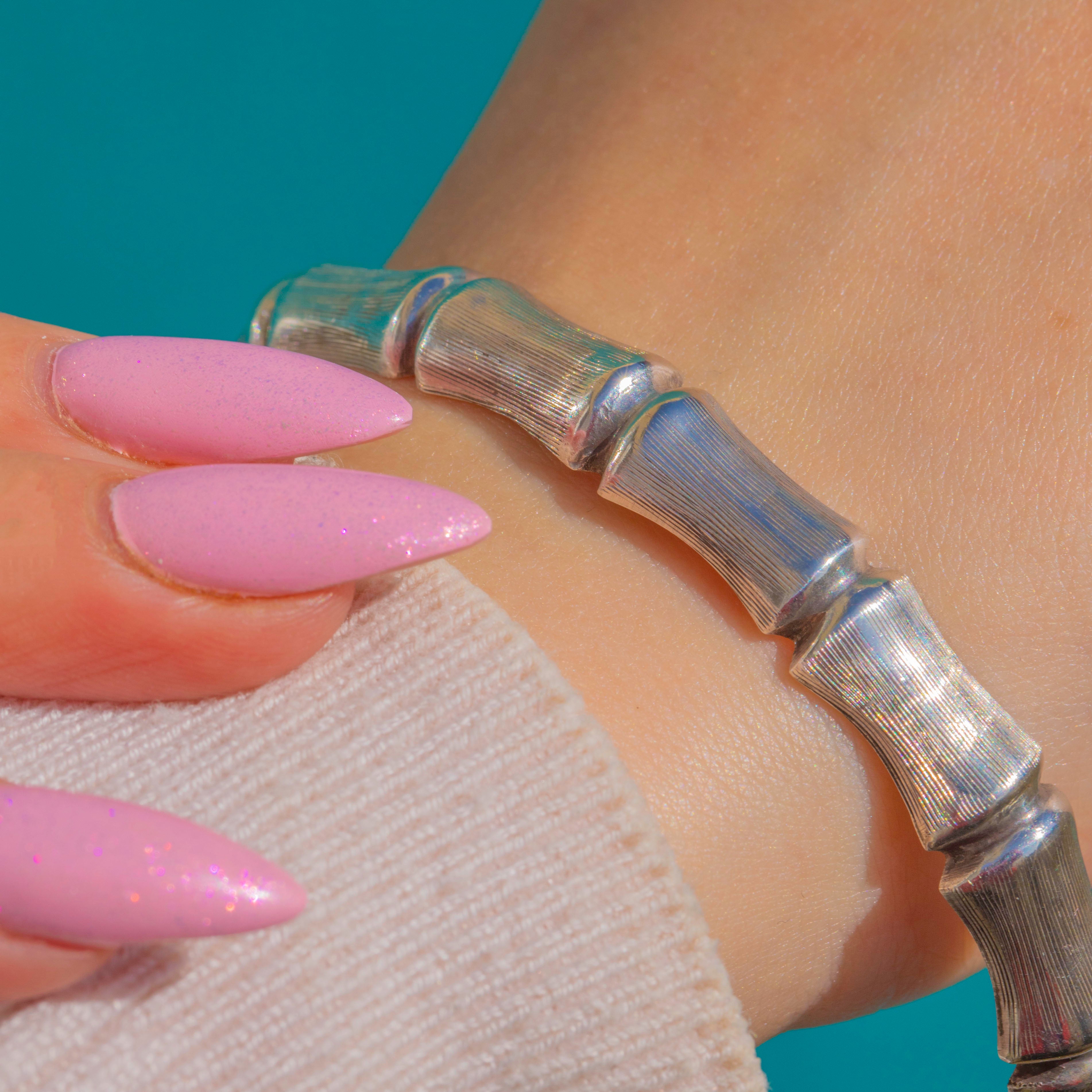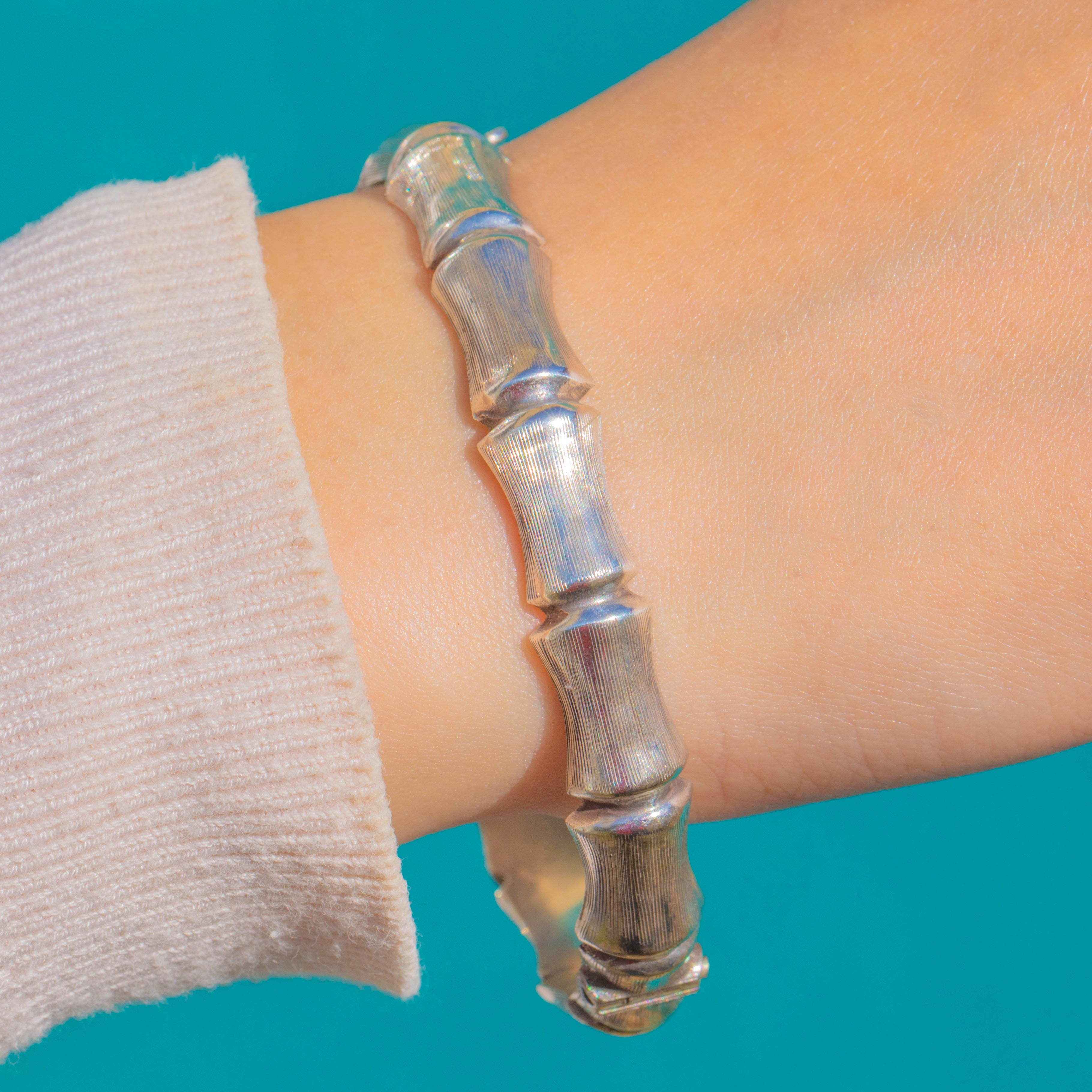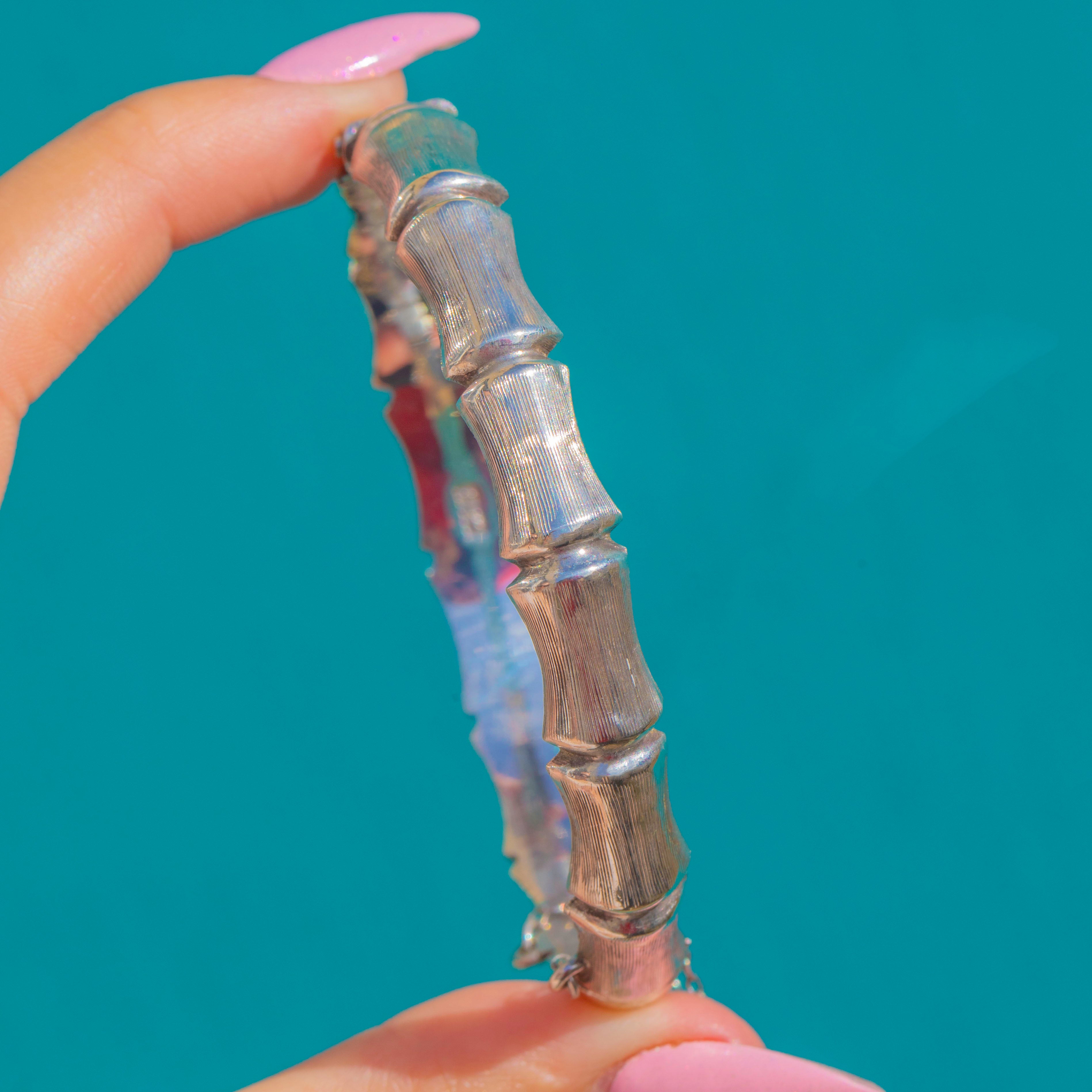 Sculptural and effortlessly chic, this Vintage Sterling Silver bamboo bangle captures the clean lines and organic rhythm of mid-century design. Engine-turned ribbing runs along each tubular segment, punctuated by smooth collars that echo natural bamboo nodes for a bold, tactile look.