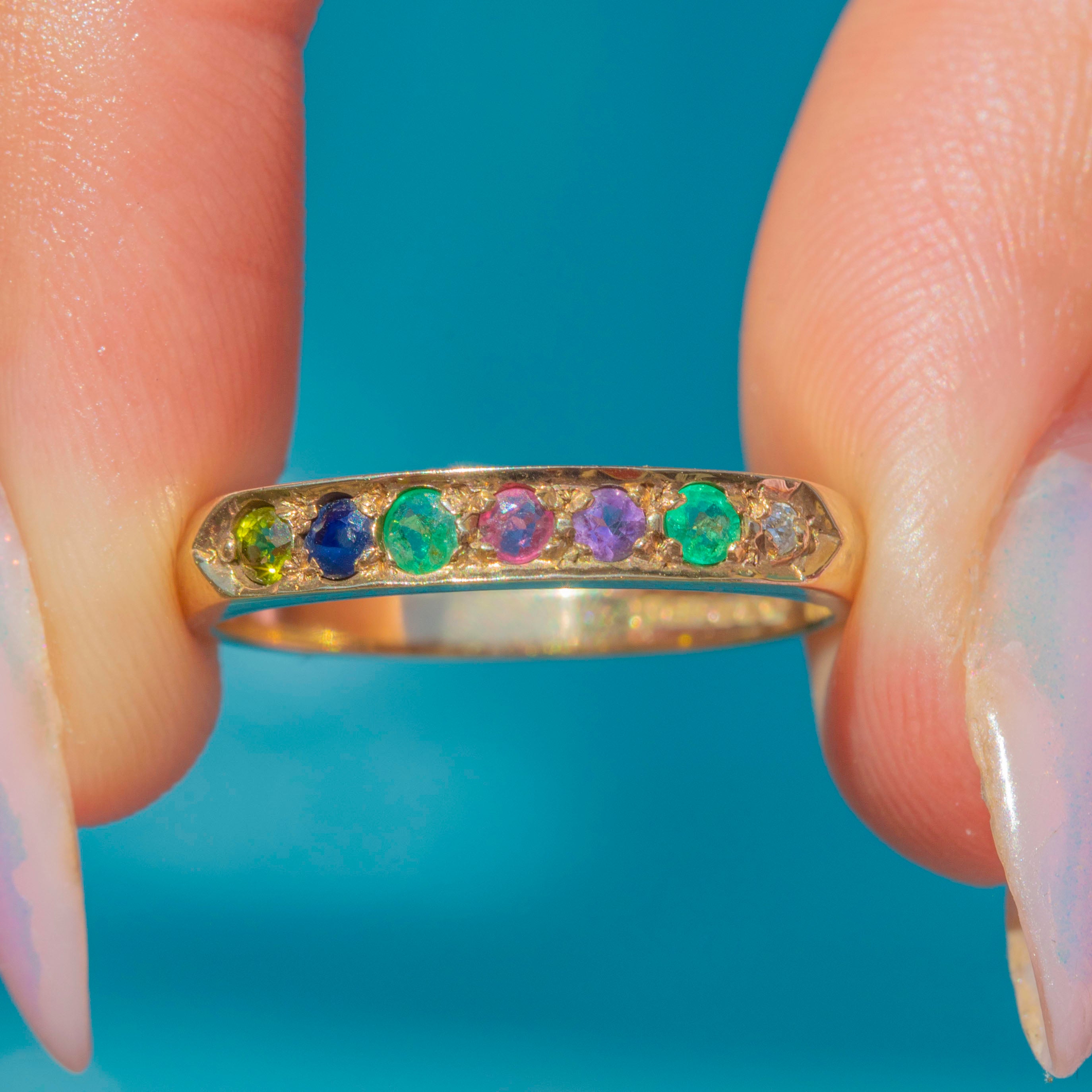 This gorgeous vintage acrostic ring features seven vivacious gemstones twinkling brightly as they sit across your finger, displayed proudly in luxurious 9ct Gold.