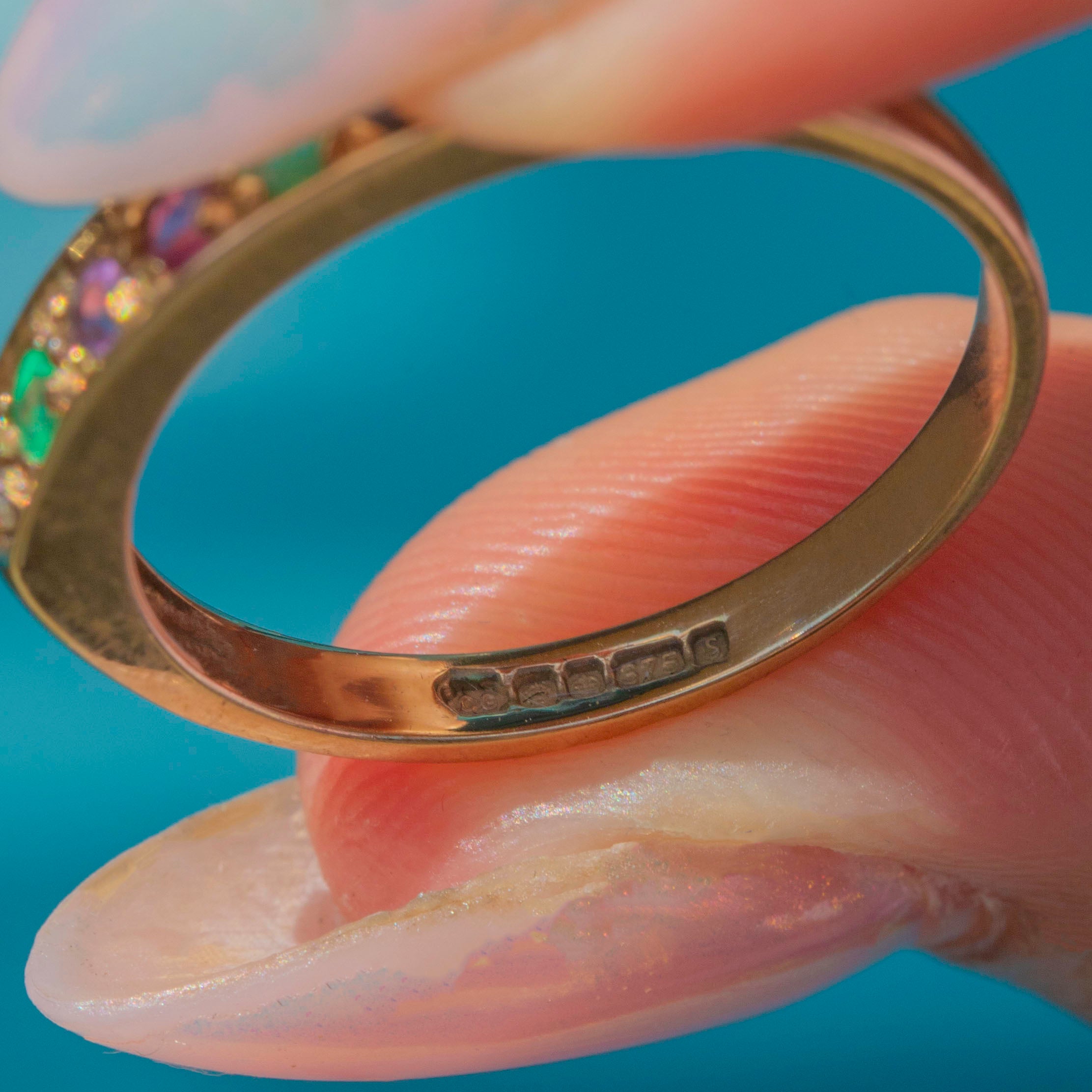 VERY GOOD: The Gold is bright with only minor wear to the back of the band, each setting is fully intact, keeping the gemstones securely held in place. The gemstones are all bright with only minor wear noticeable under close inspection. All in all, a superb piece of vintage jewellery ready to be worn and admired for years to come!