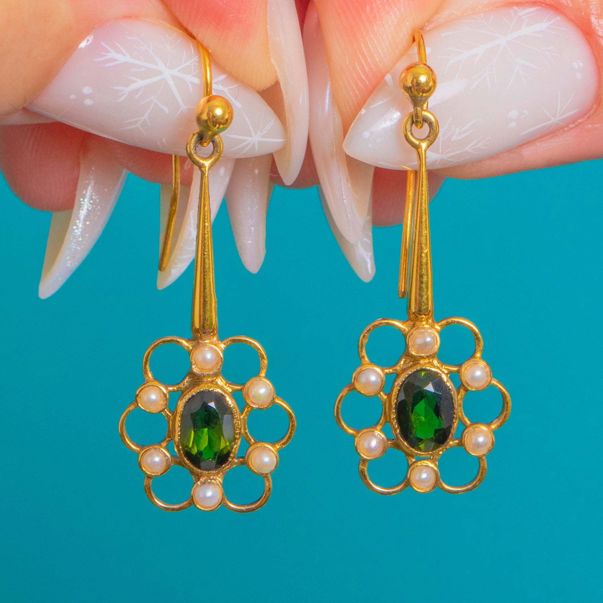 Vintage 9ct Gold Green Tourmaline Pearl Cluster Drop Earrings