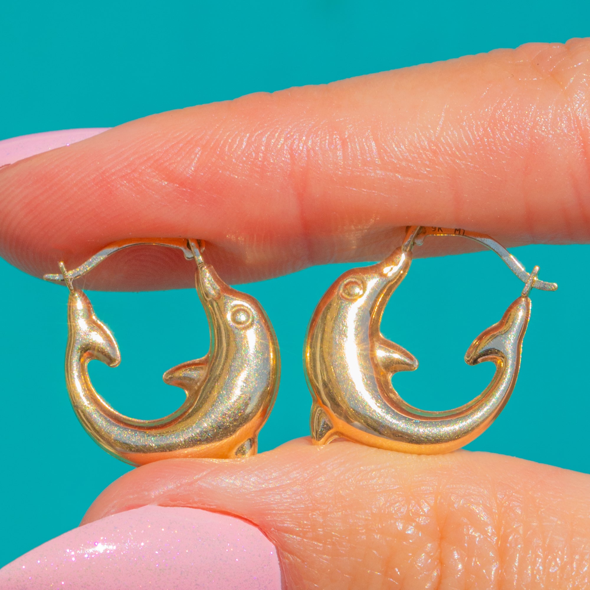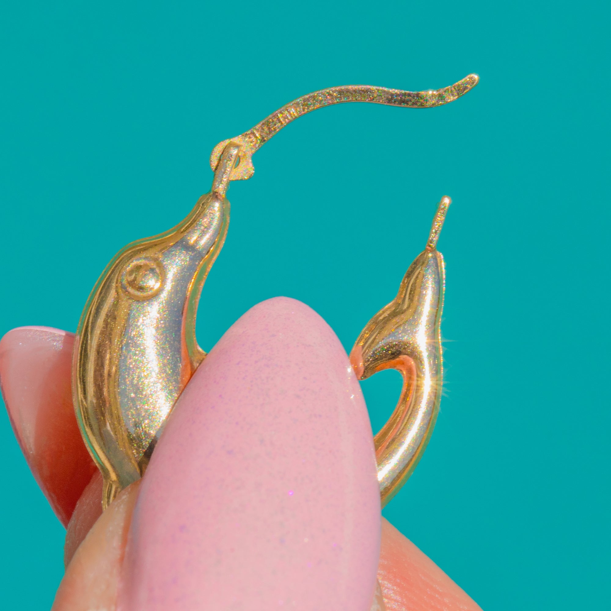 Playful yet polished, these Vintage 9ct Gold dolphin huggie earrings bring a joyful splash of nautical charm to your everyday. Each sculptural dolphin curves fluidly to form a compact hoop, their sleek high-polish surfaces catching the light with every turn.