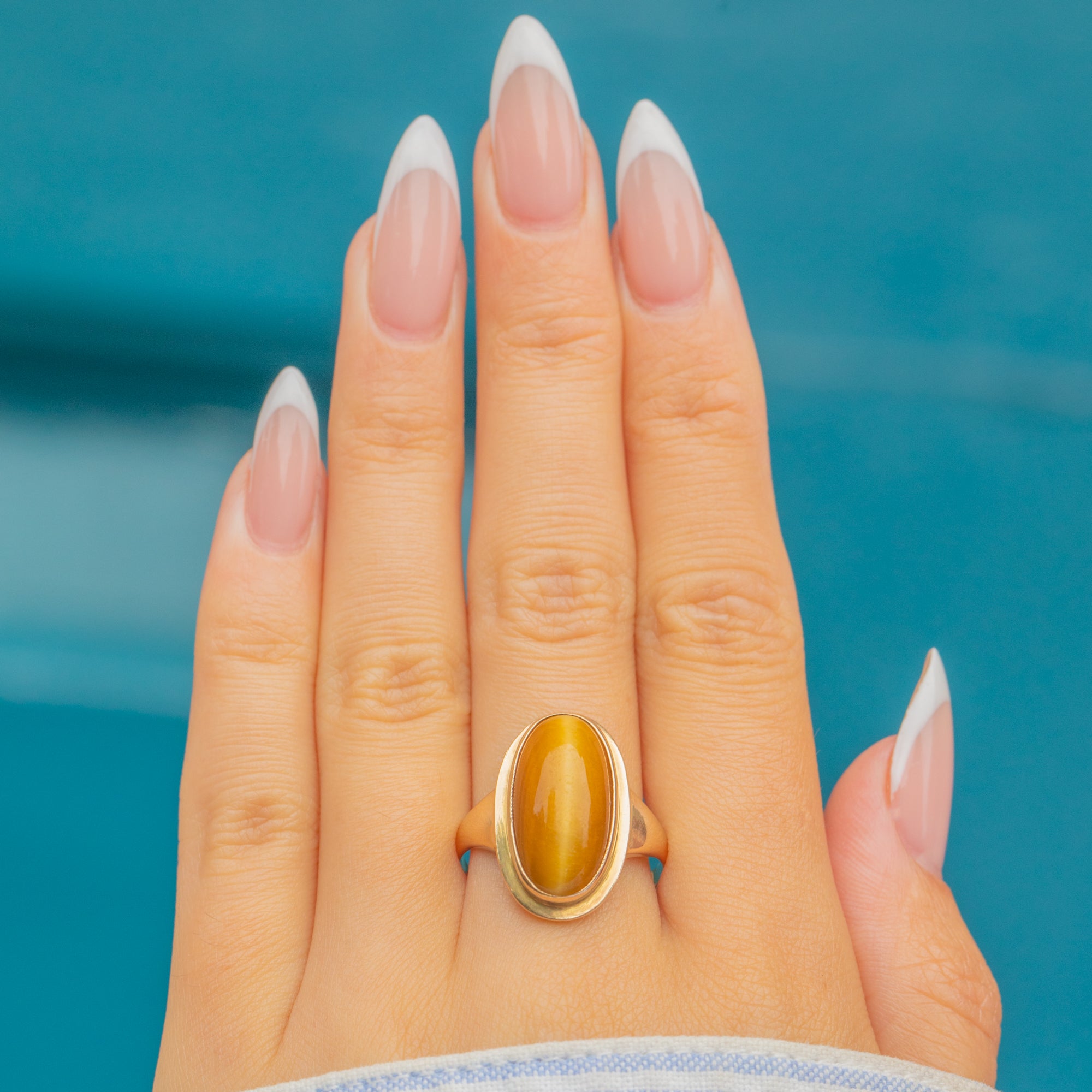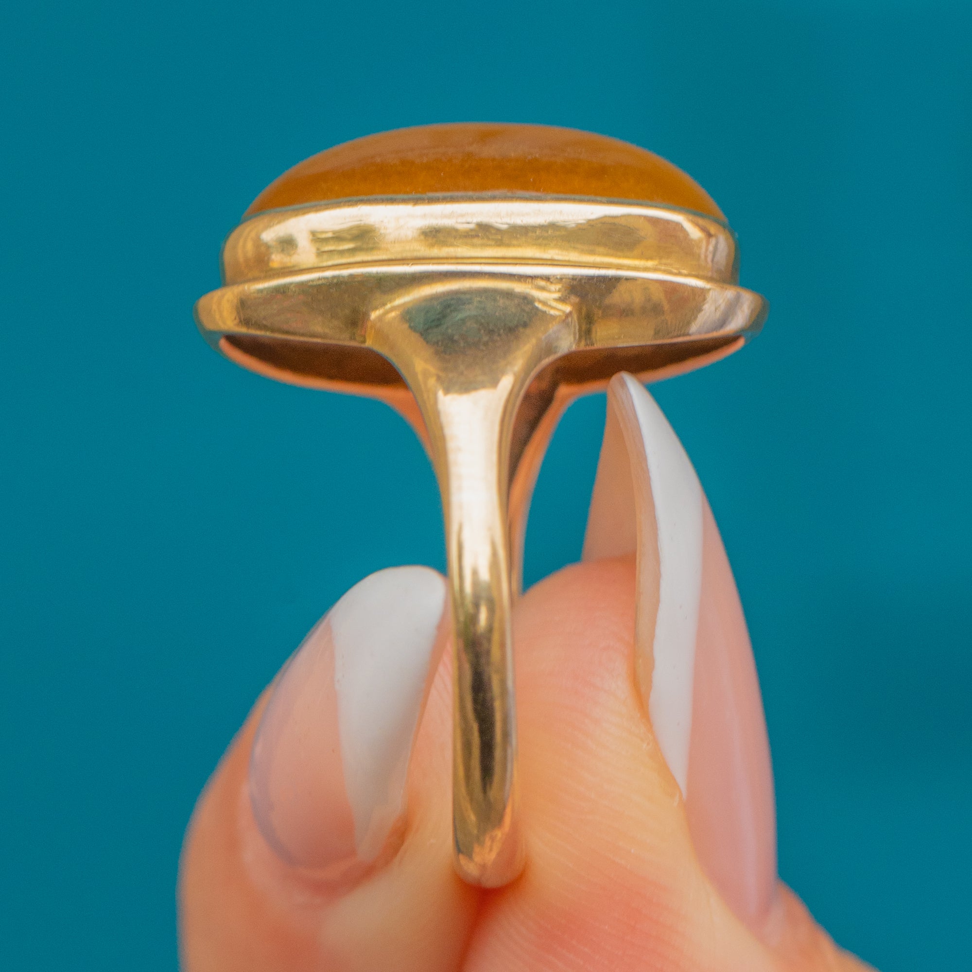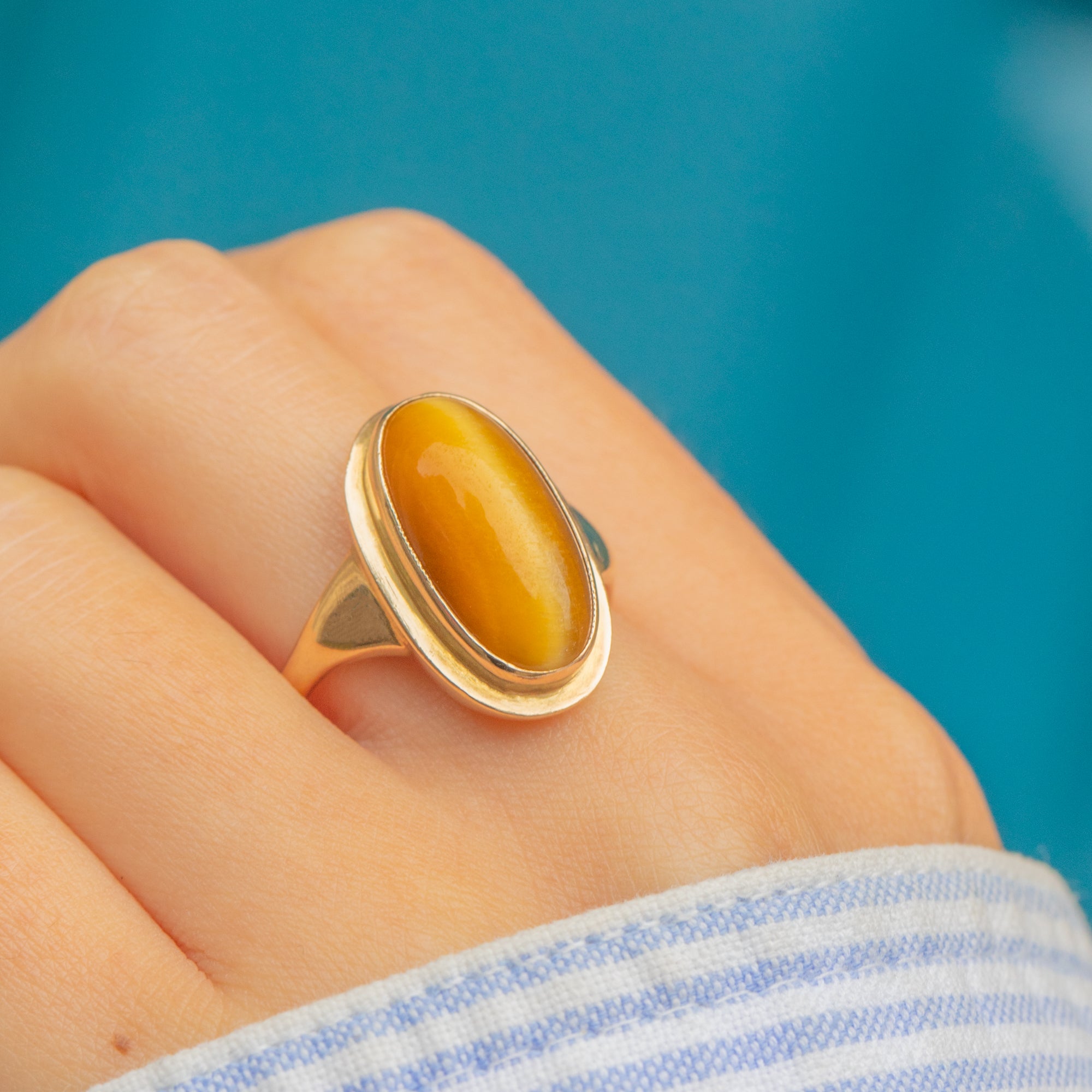 This Vintage ring is set with a richly coloured Tiger’s Eye cabochon, known for its silky chatoyancy and warm golden-brown tones. The gemstone shifts beautifully in the light, creating the distinctive “cat’s eye” effect that has made Tiger’s Eye so popular throughout history.