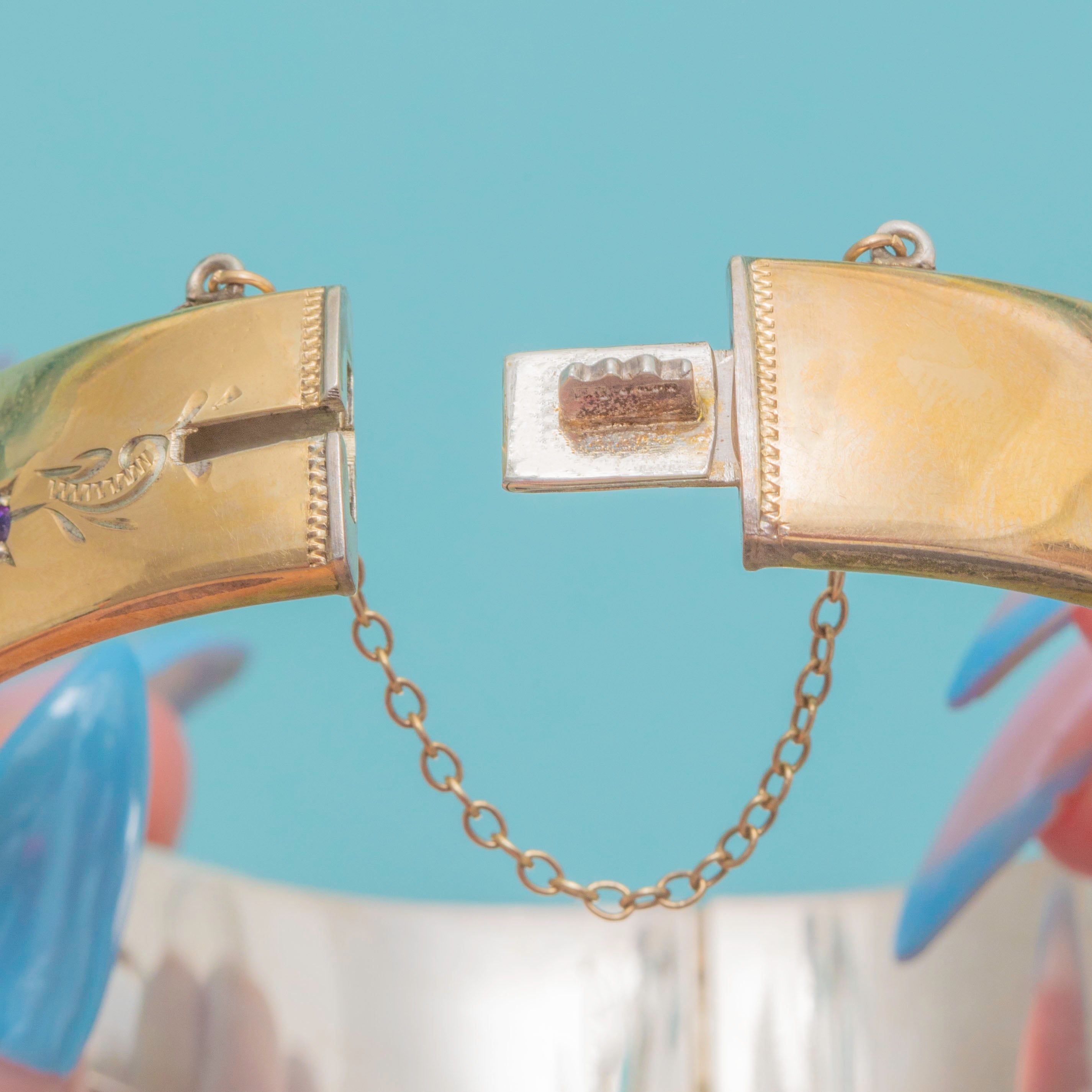 EXCELLENT: Each Amethyst is radiant and secure within its settings. The 9ct rolled Gold is buttery and the Sterling Silver is bright, free from dings or scuffs. Closing securley and complete with a safety chain, this vintage bangle can be worn with utmost confidence.