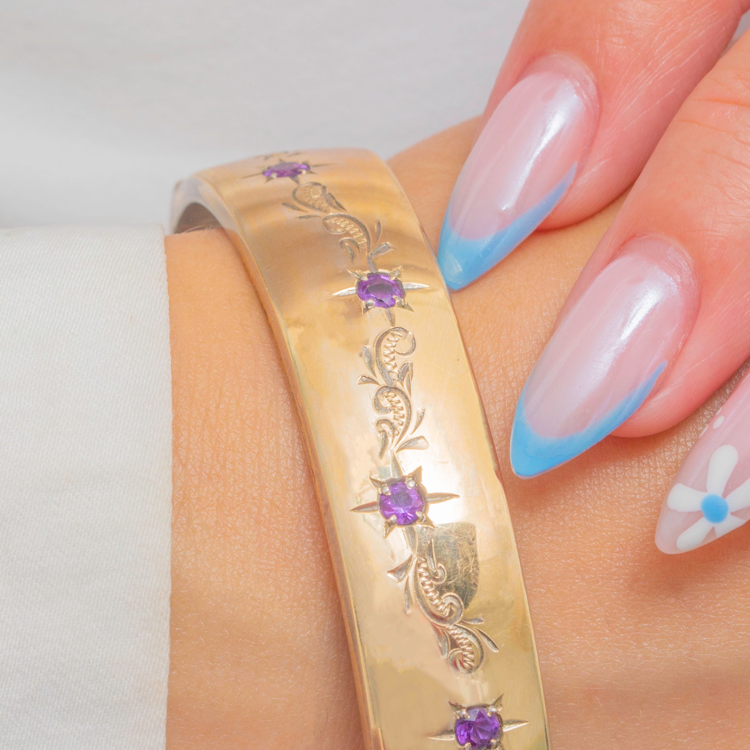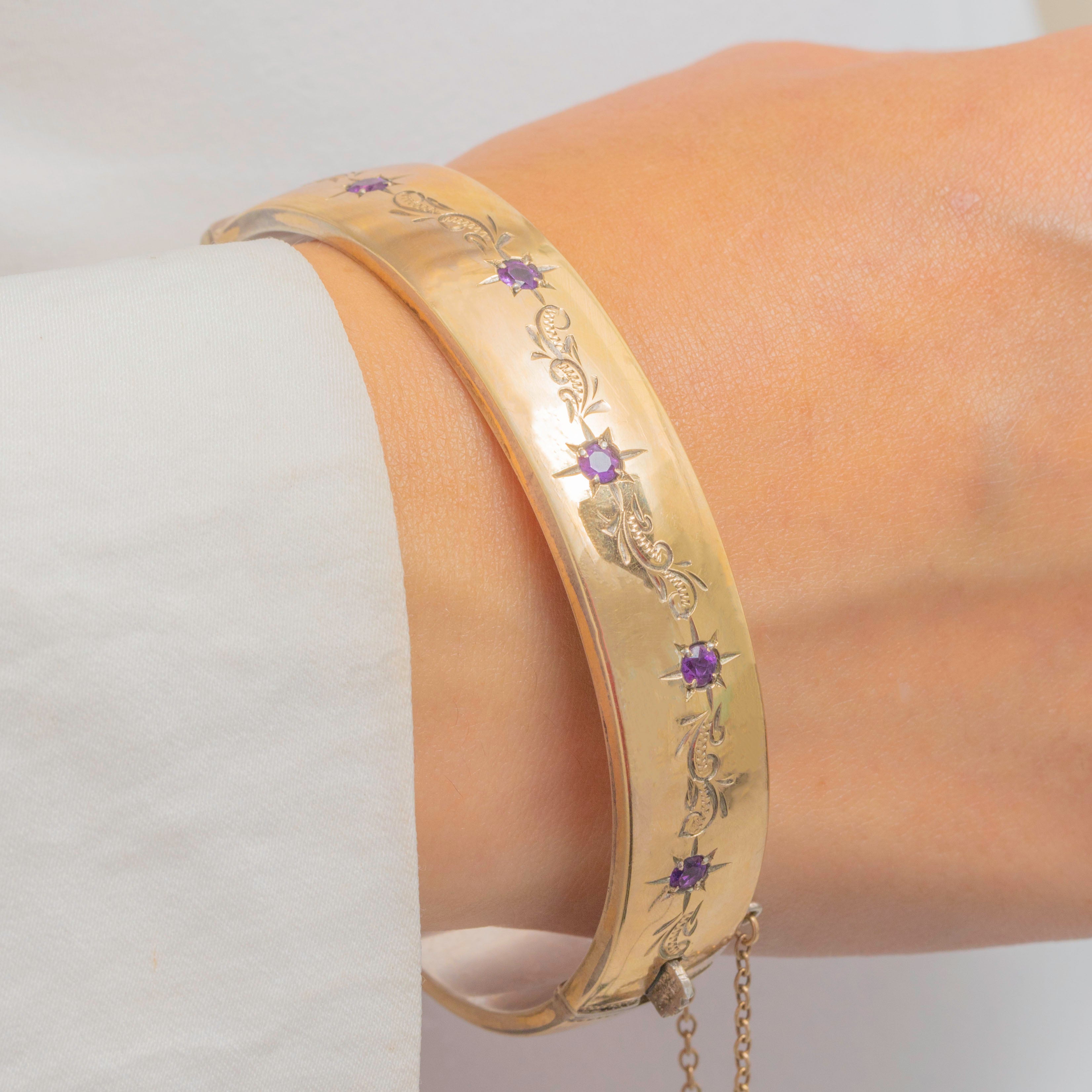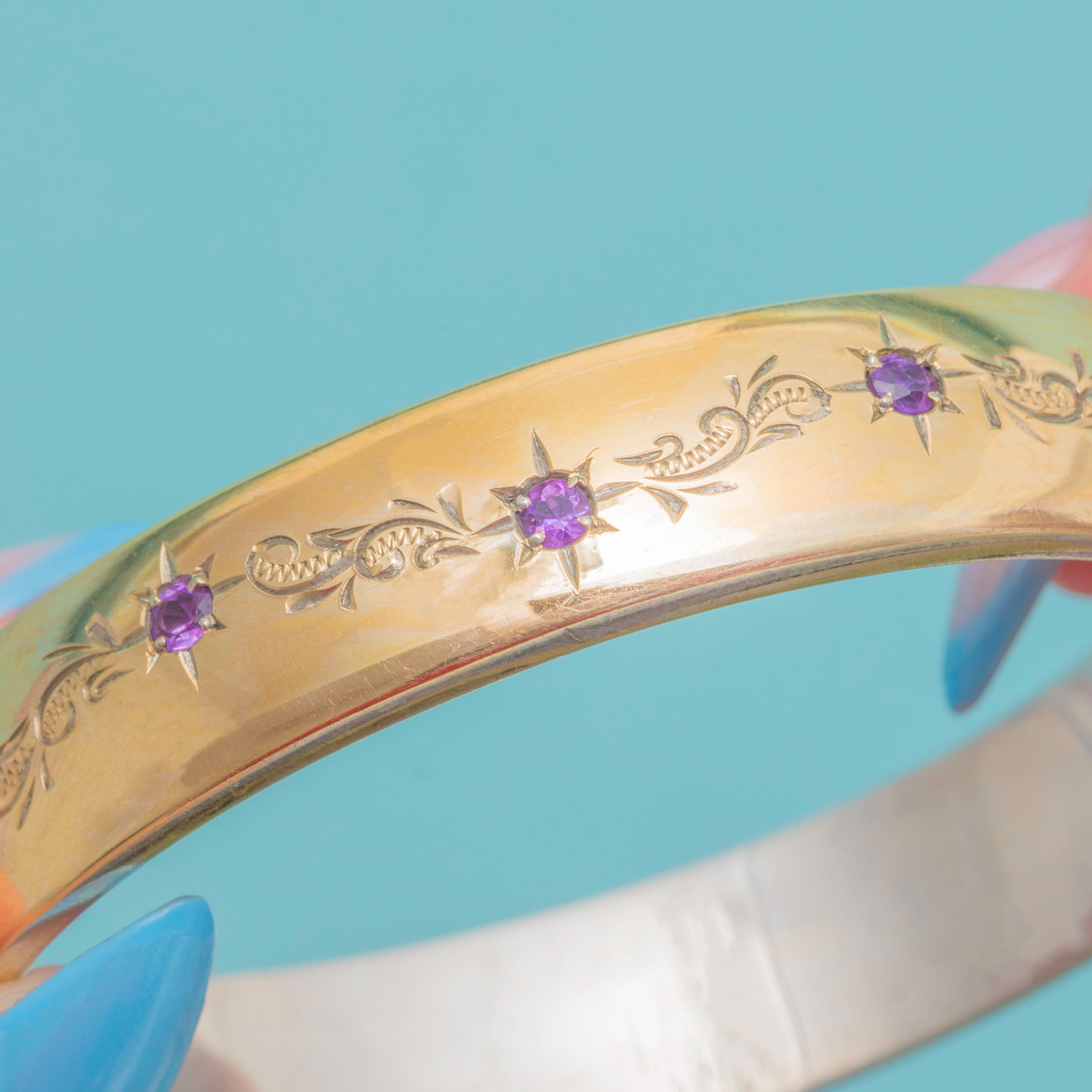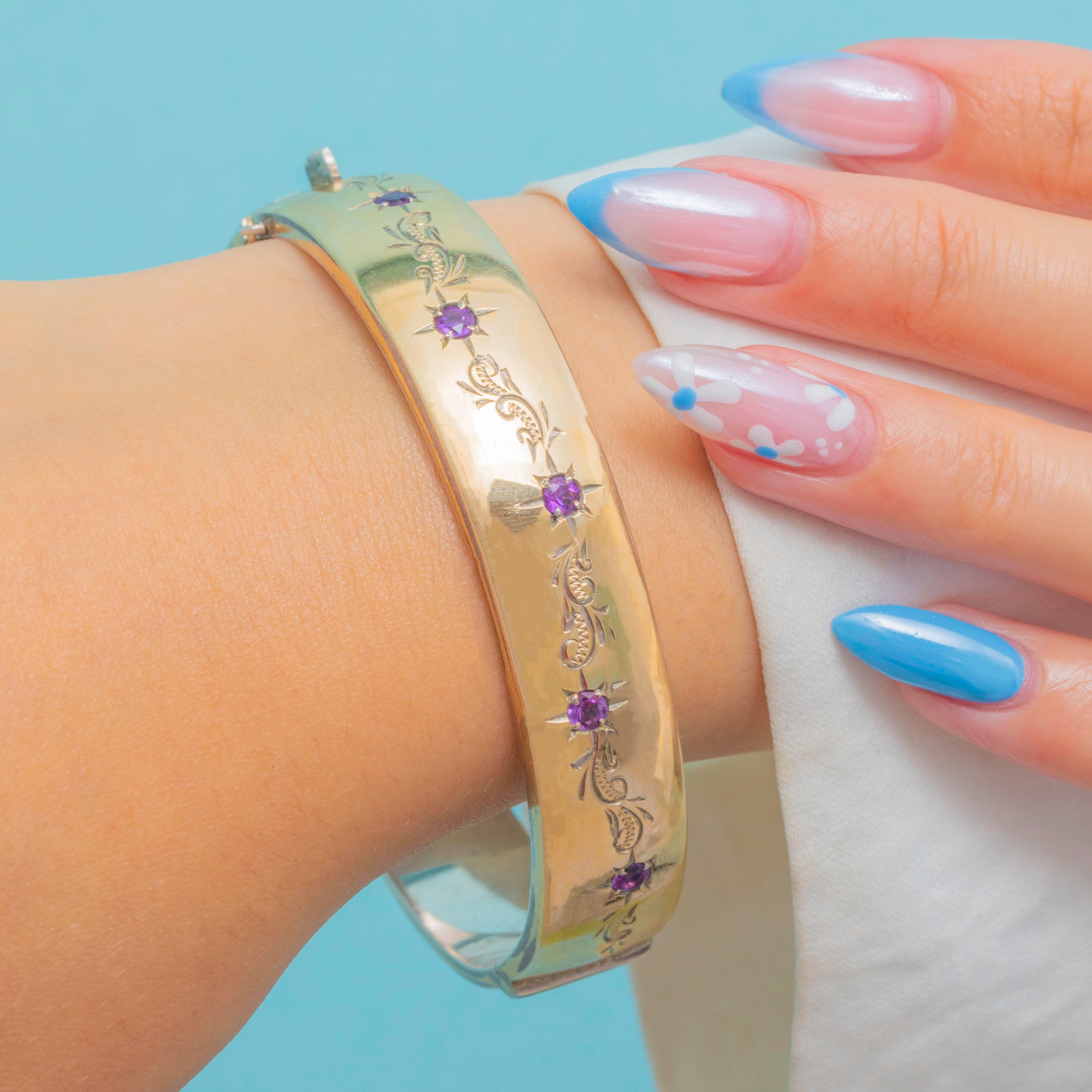Adorned with five star-set Amethysts, each flanked by intricate engravings, it simply radiates vintage allure. Chunky yet lightweight, this ornate bangle is perfect for everyday wear.