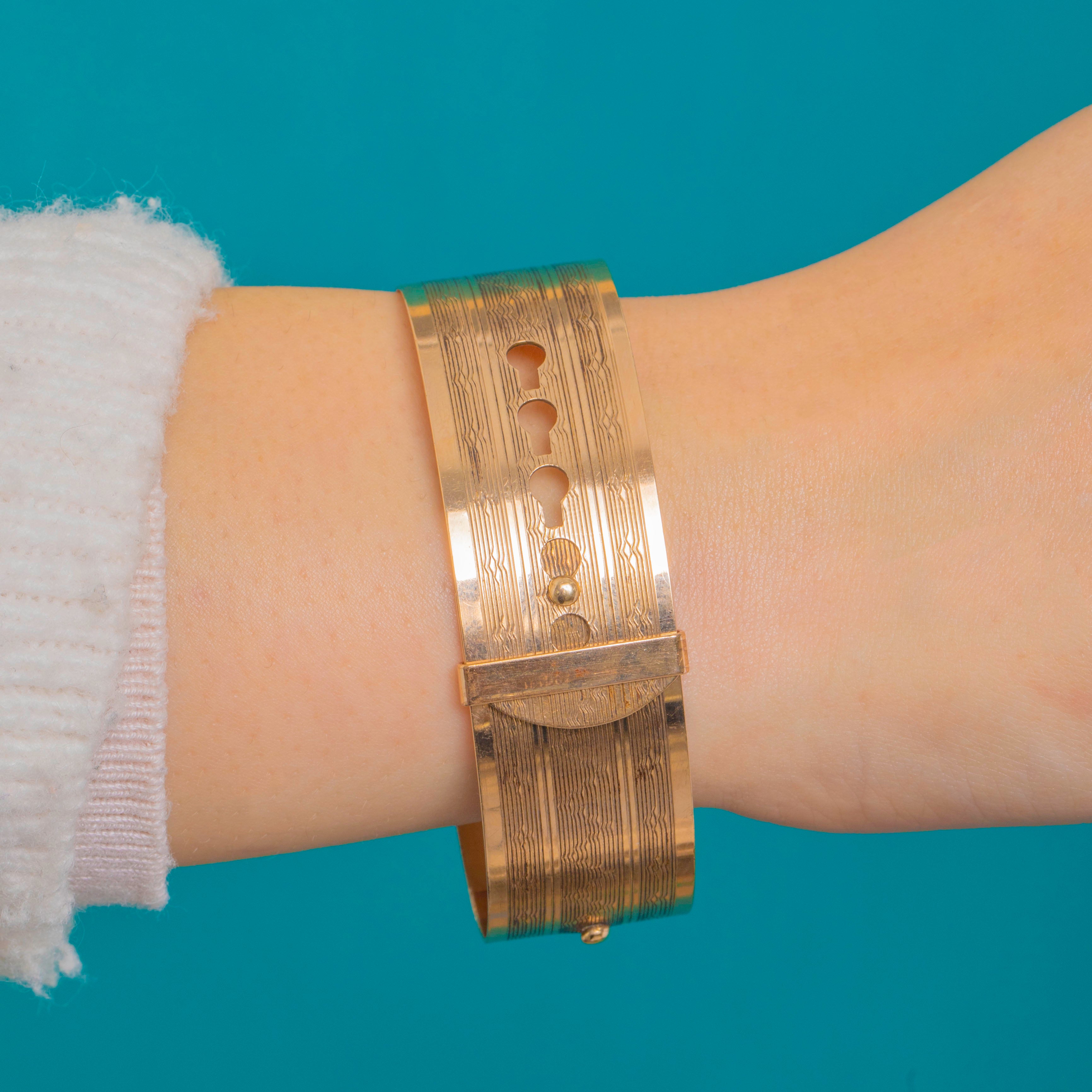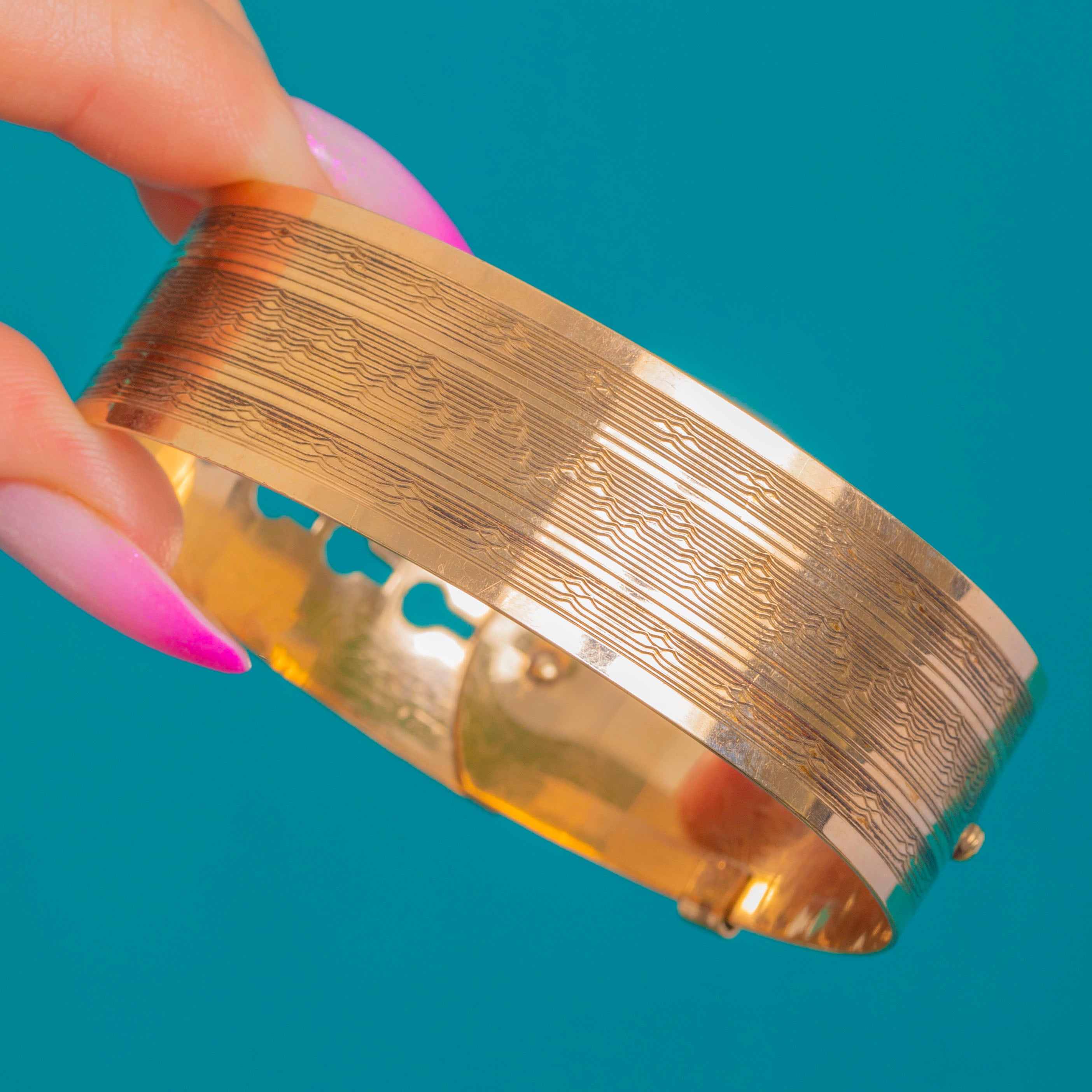 Bold yet impeccably refined, this Mid-Century Vintage buckle bangle gleams in 9ct Rolled Gold with a broad, architectural profile. The central panel is richly engine-turned with crisp, parallel lines that catch the light beautifully, punctuated by a vertical row of keyhole apertures for that classic belt‑buckle aesthetic.