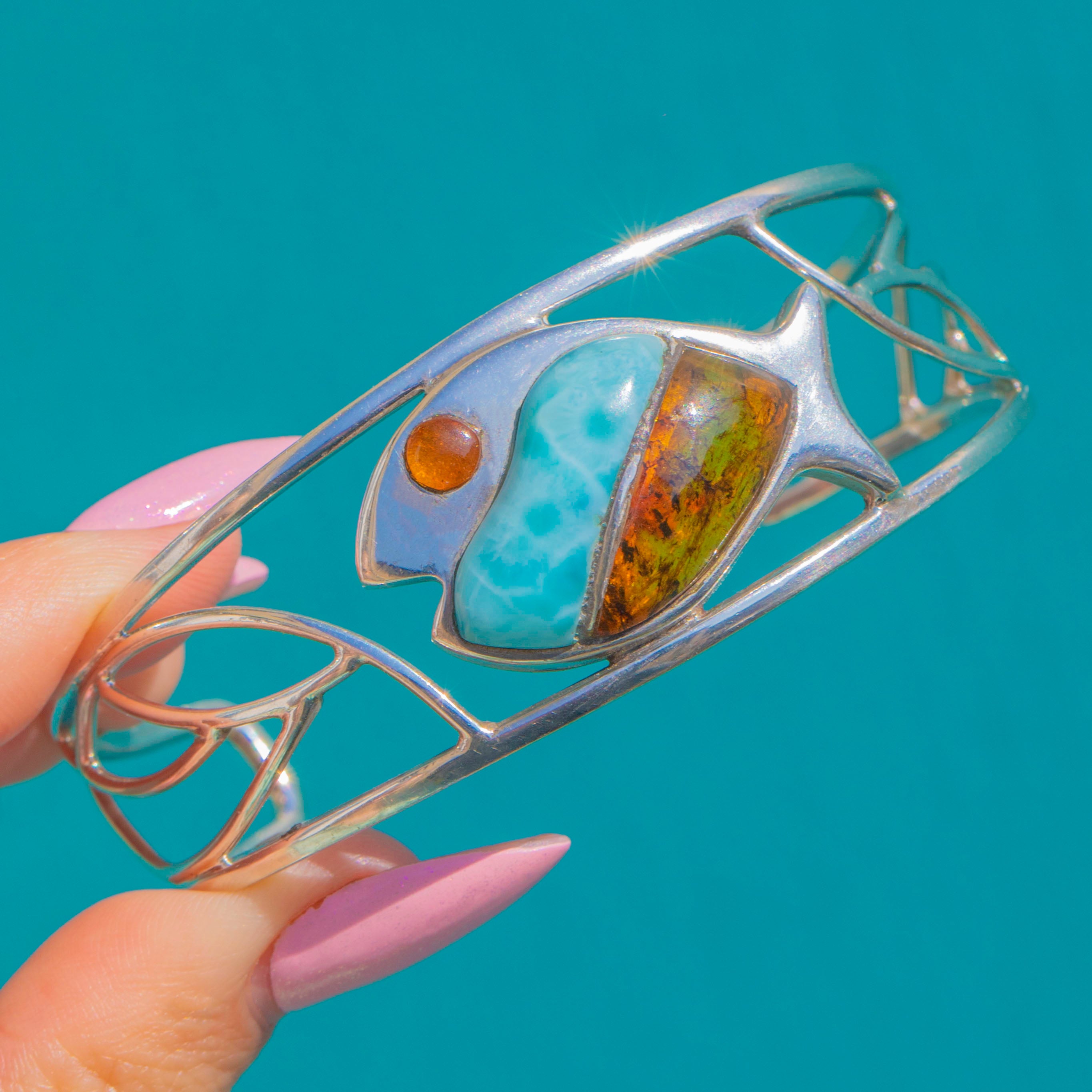 Bold, sculptural, and effortlessly wearable, this Vintage Sterling Silver fish bangle glides across the wrist with fluid openwork and a confident organic silhouette. An asymmetric cluster of smooth Amber and Howlite cabochons is cradled in sleek closed bezels, their textures and tones playing beautifully against the polished Silver framework.