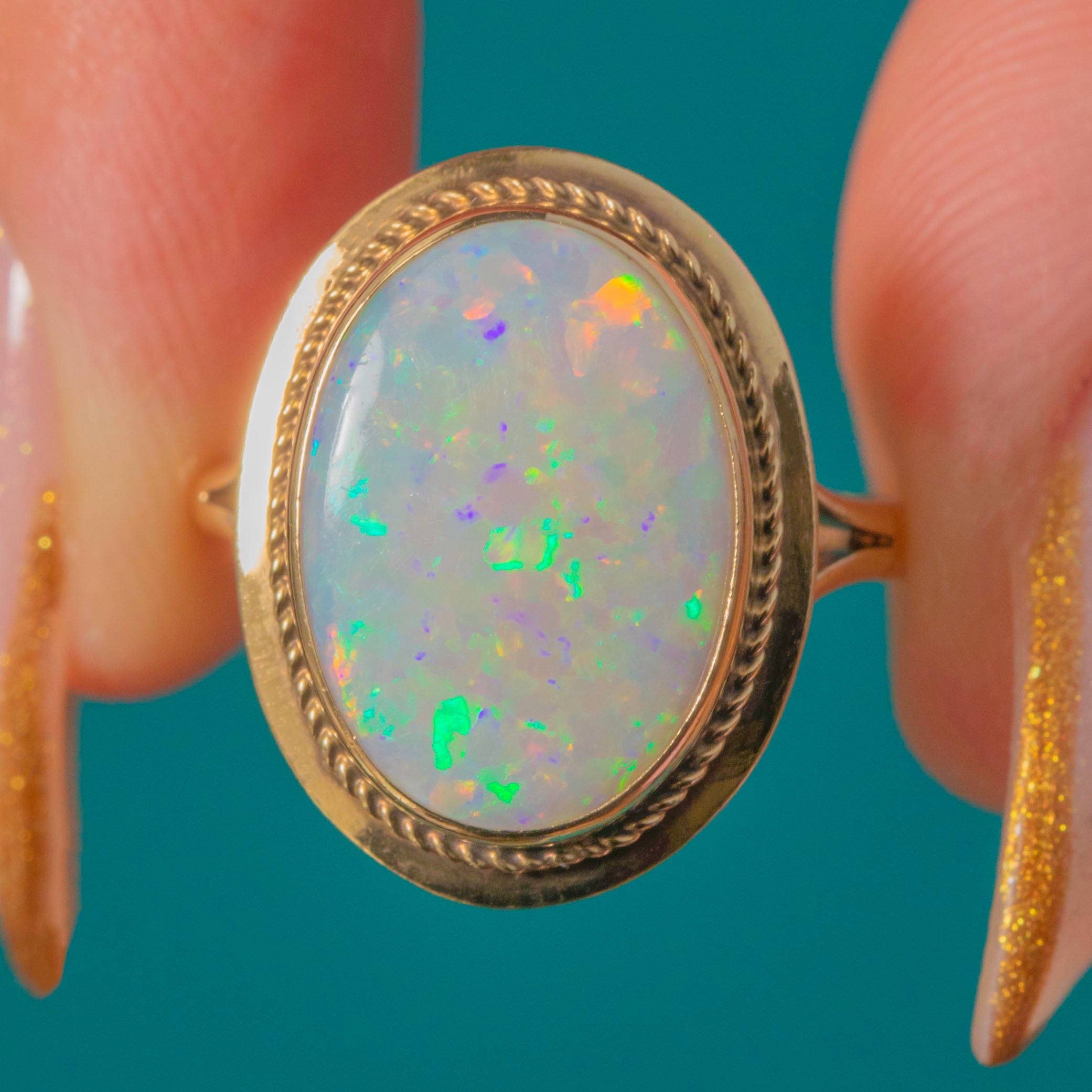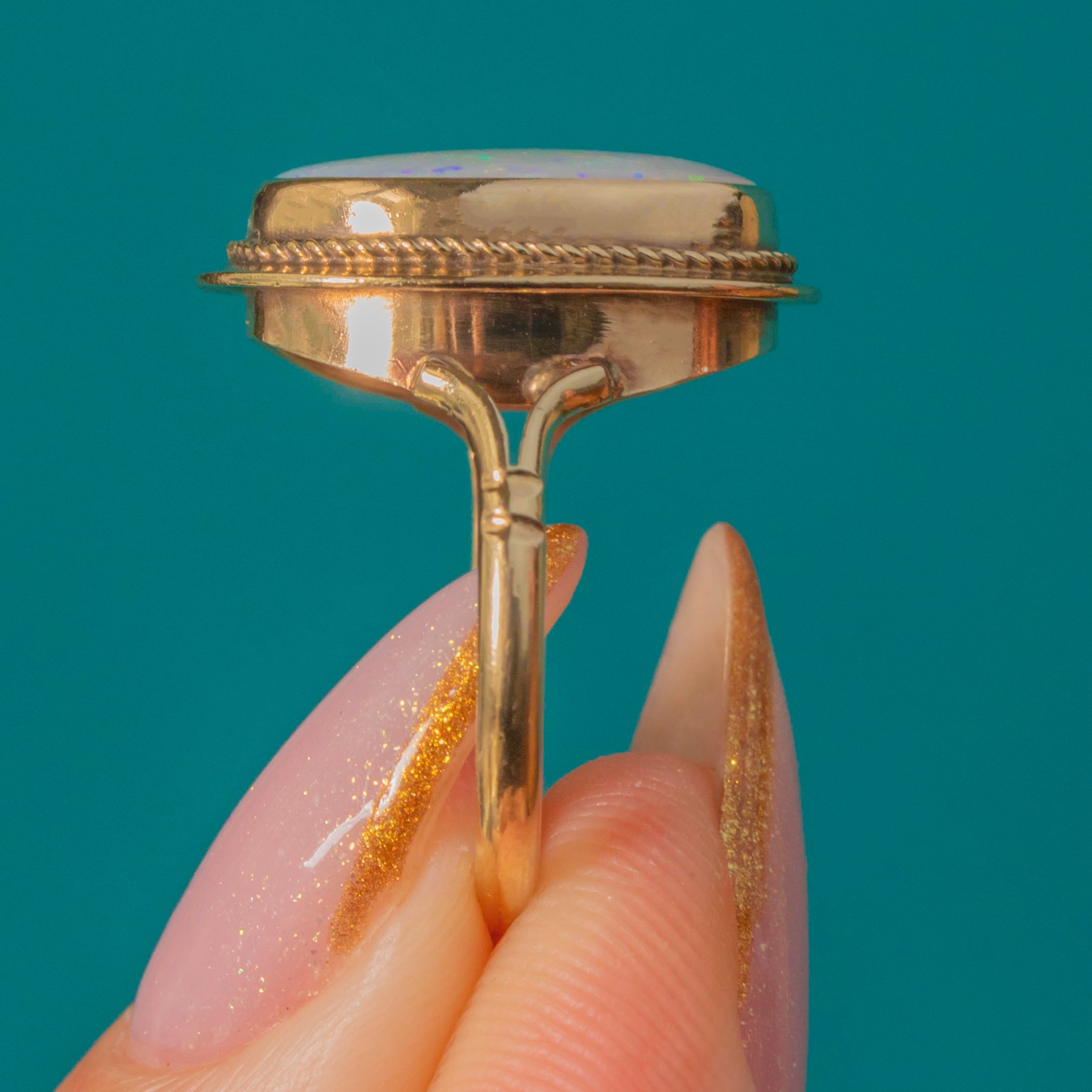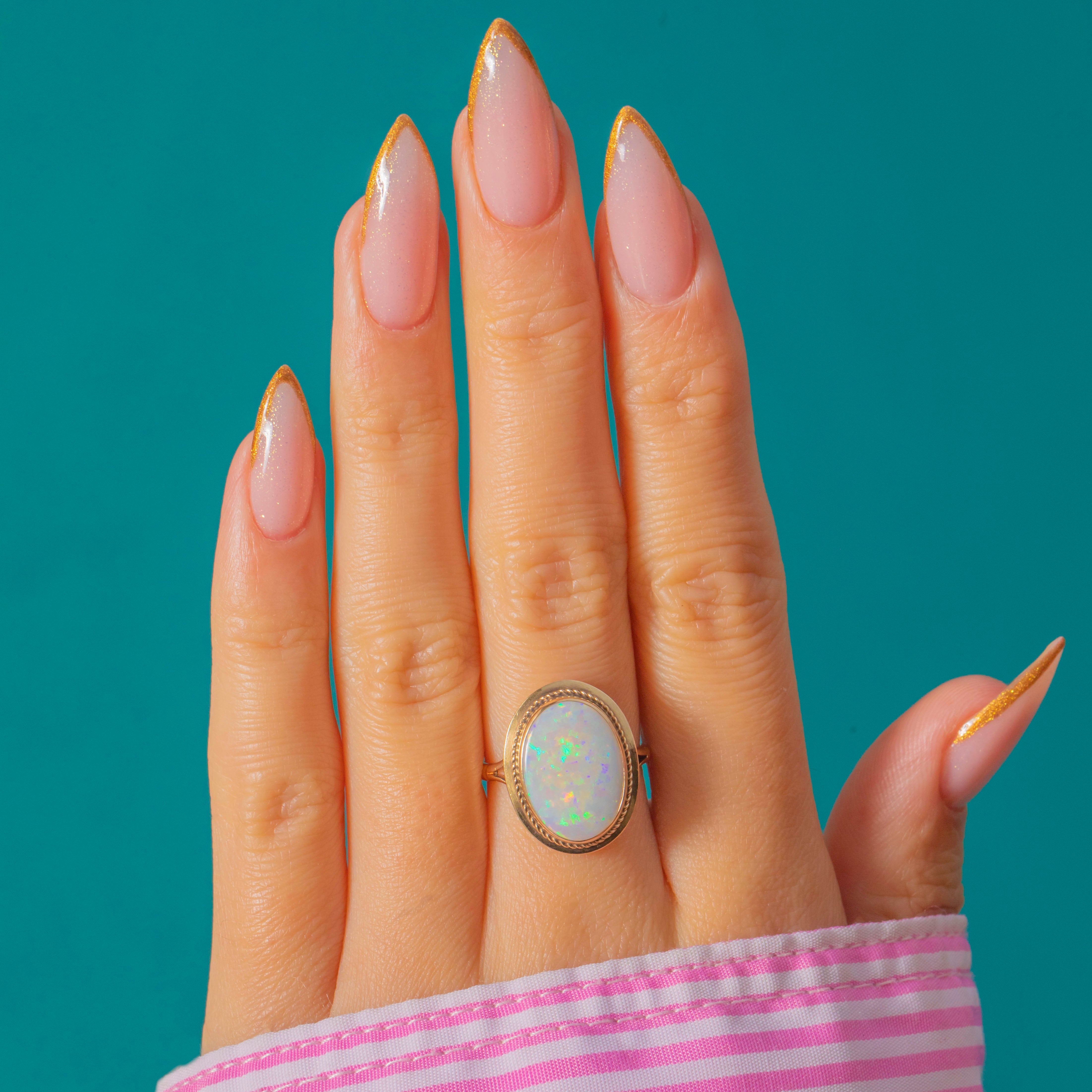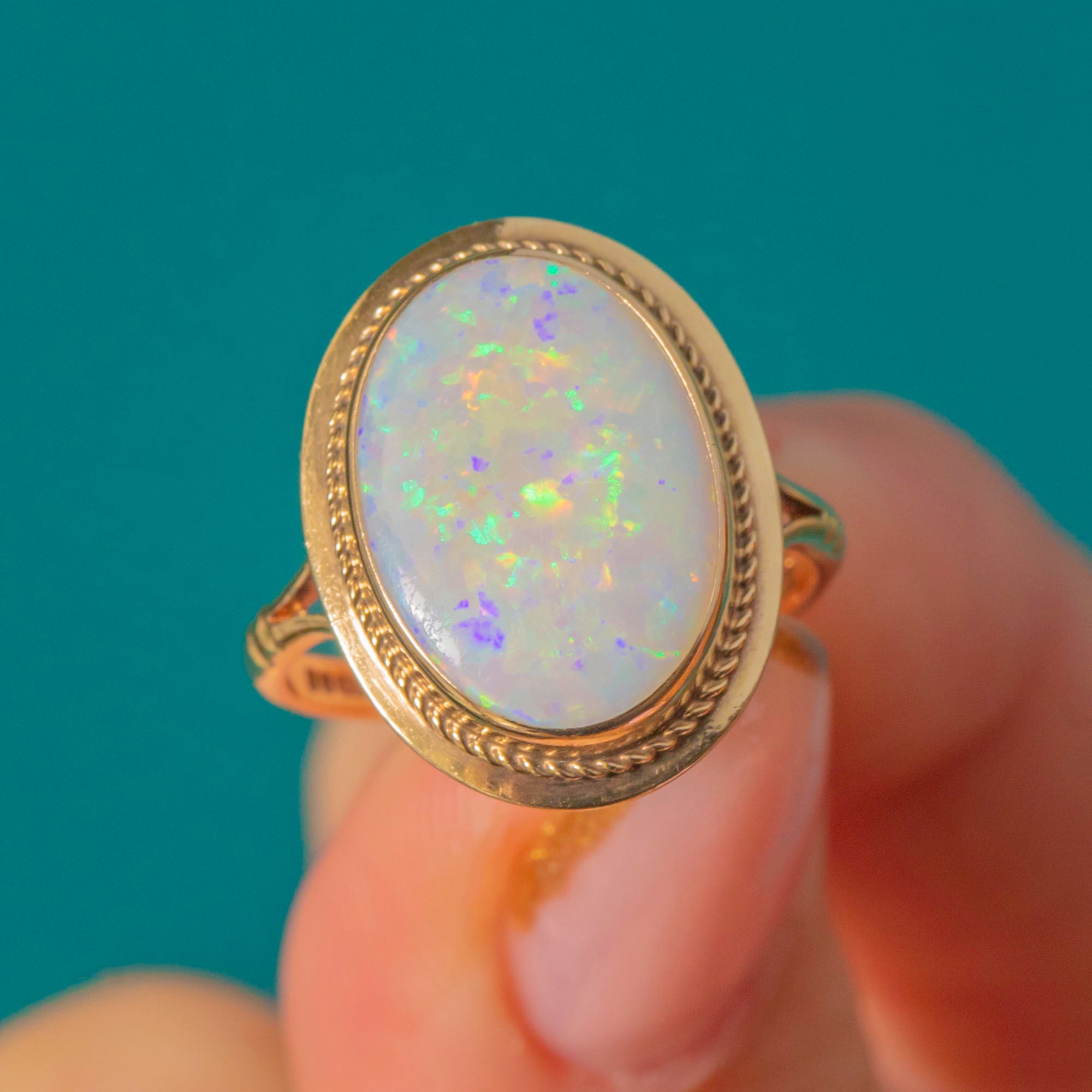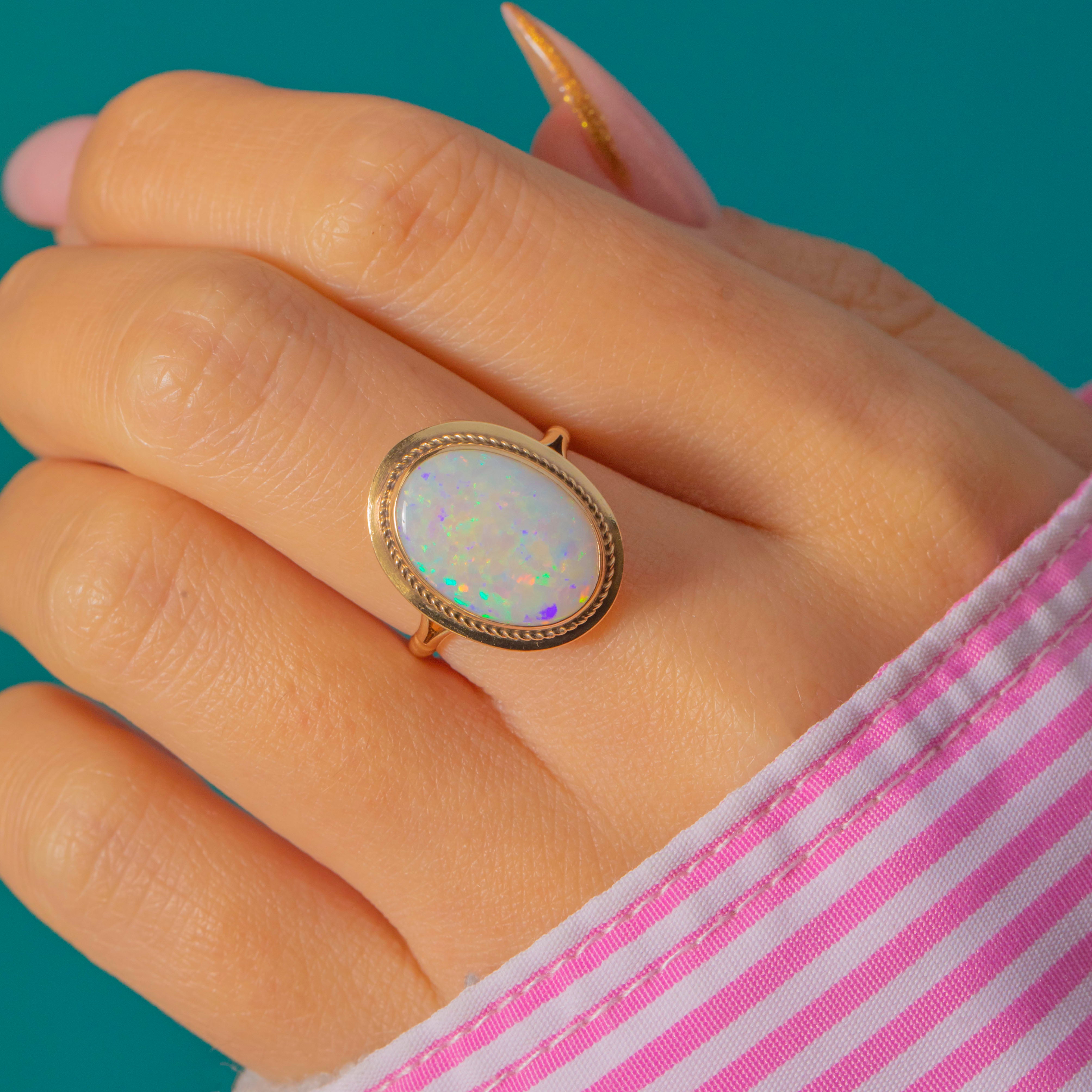 This gorgeous bezel-set Vintage Opal ring captures everything we love about the gemstone’s ethereal beauty. The large solid Opal radiates flashes of electric green, fiery orange and violet, shifting colour with every movement. Set in smooth 9ct Yellow Gold with a delicate rope border, the ring perfectly frames the stone’s iridescence while offering a timeless, wearable & functional design.